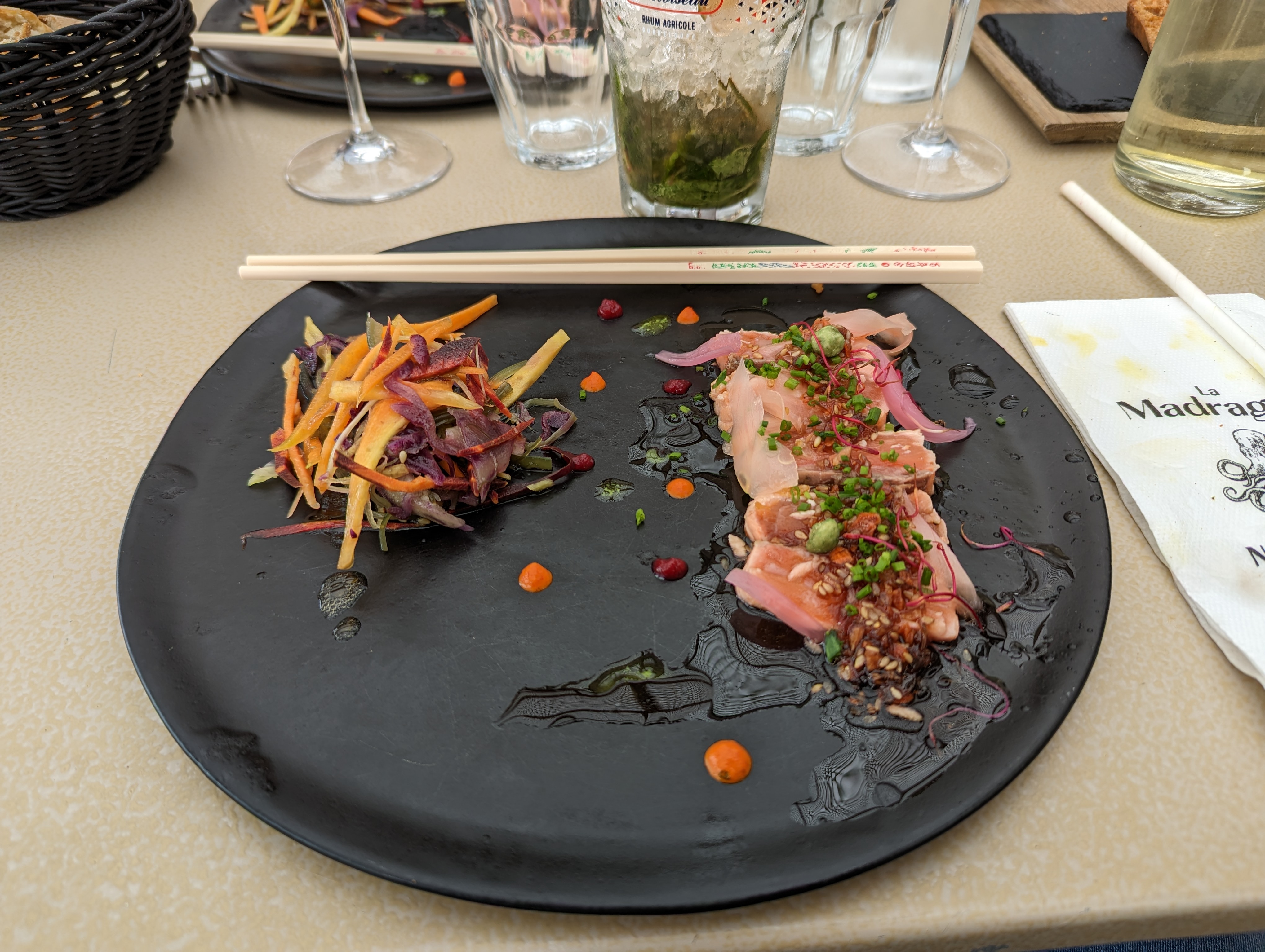 Très belle découverte ! Le thon mi cuit était absolument délicieux. Les portions sont de qualité et généreuses, le tout servi dans de jolies assiettes. Nous nous sommes laissés tenter par un dessert et n'avons pas été déçus ! Les profiteroles sont à tomber ainsi que la mousse au chocolat. La déco est tendance et très agréable et l'accueil chaleureux. Je recommande à 100% et espère bien avoir l'occasion de retourner à La Madrague !