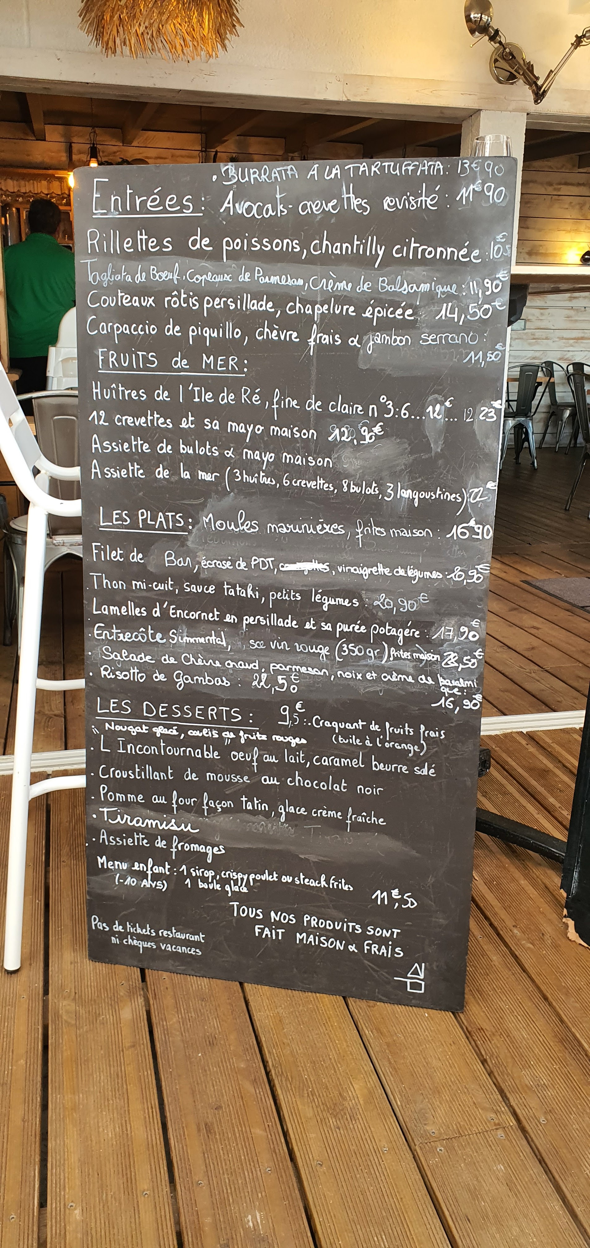 Restaurant situé à côté de l'océan (pratique pour la balade de l'après repas) Parking privé juste devant. Bien accueilli par un personnel souriant. La salle n'est pas très grande mais il y a une terrasse assez sympa. La carte des plats est bien, pas trop longue et avec des tarifs assez corrects. Dans l'ensemble, ce qui est servi est bon. Il est regrettable qu'il y en ait aussi peu dans les assiettes - Et par rapport aux prix, on peut se poser des questions - Quant à la mention certains plats fait maison c'est le flou complet on ne connaît pas les plats concernés. C'est prendre le client pour des imbéciles. Dommage !! Il y a pourtant une législation à ce sujet. Ça reste un établissement correct.