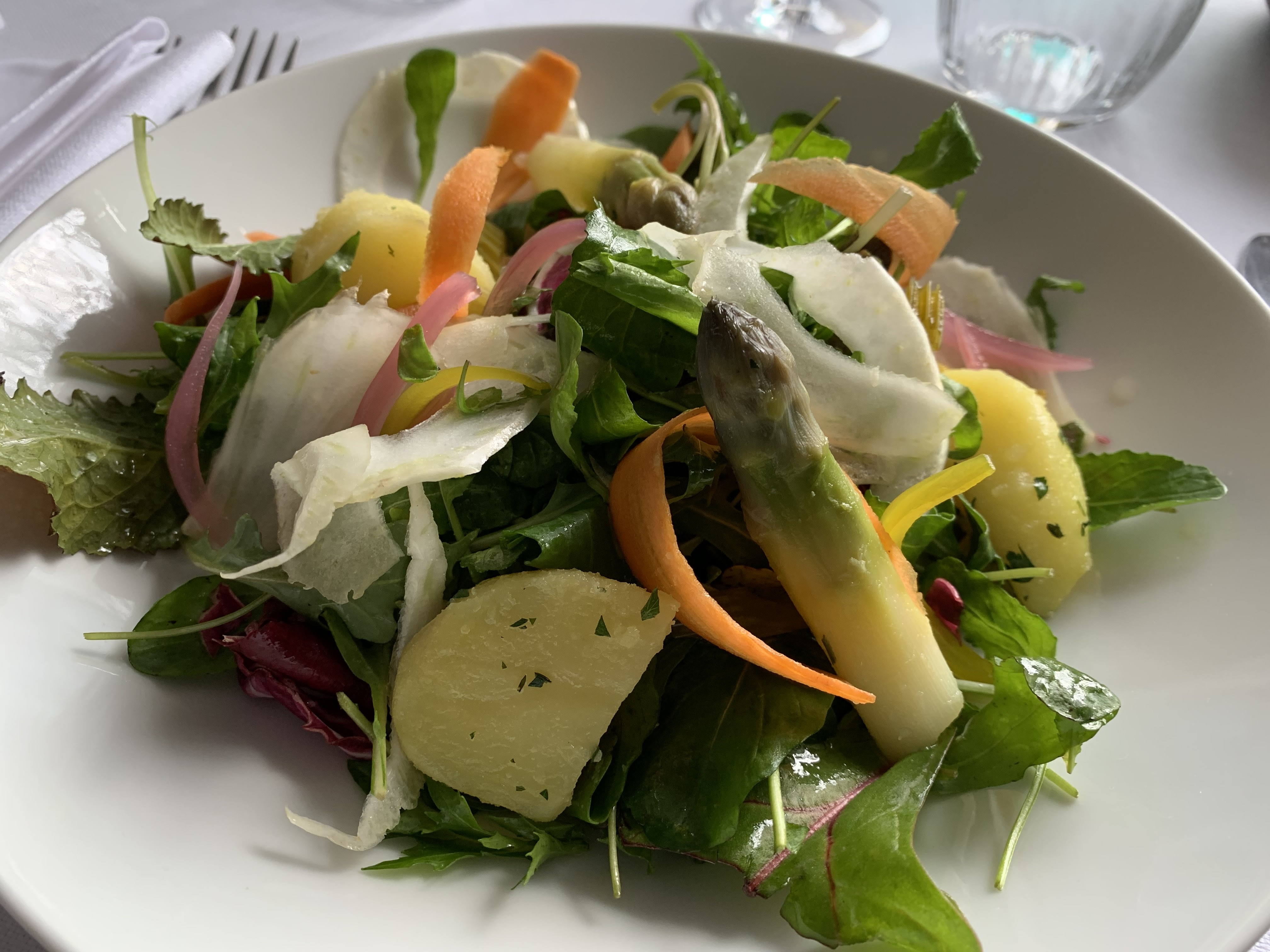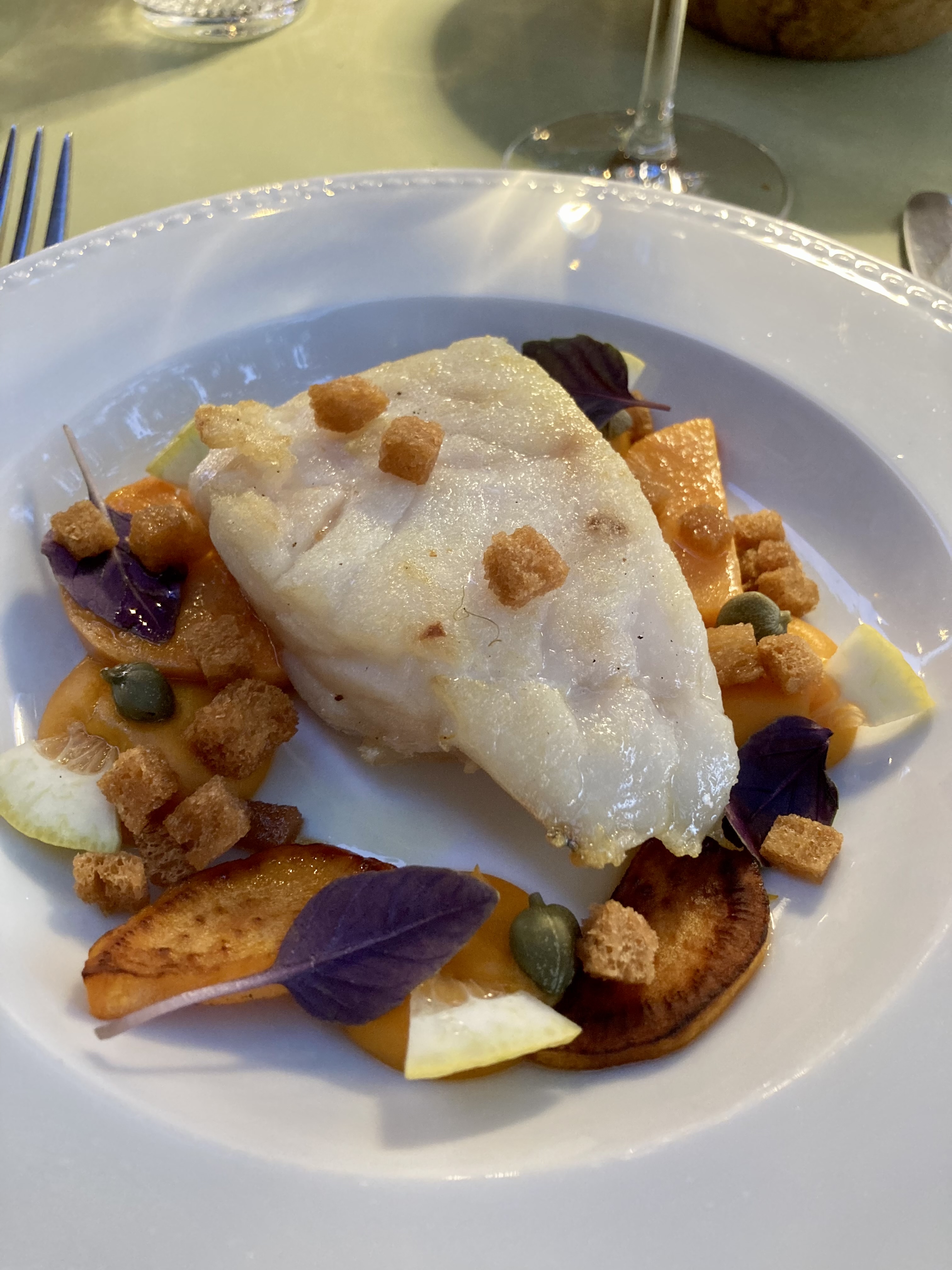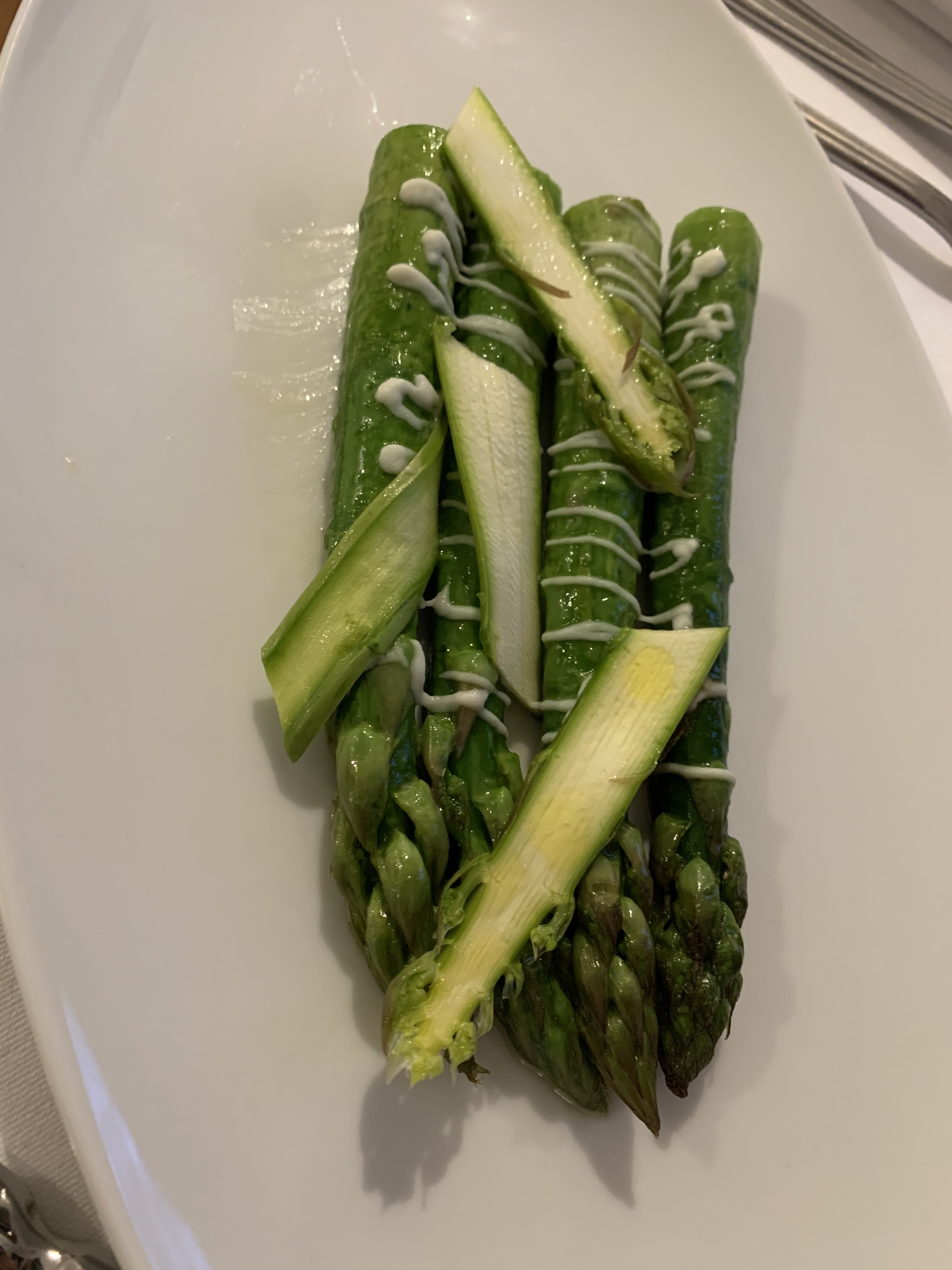 Cadre magnifique, serveurs professionnels...quand soudain nous sommes témoins d'une scène d'humiliation puis d'acharnement de la part du maître d'hotel envers une serveuse.Pourtant celle-ci faisait preuve d'une attitude appropriée, tant dans la prestation technique que dans la capacité à etablir un contact adapté à chaque table. Un détail nous aurait-il échappé ? Il ne justifiait pas une telle violence. Après cette scène nous avons retrouvé la serveuse livide et interdite. Le décor venait de se fissurer. Une histoire un peu à l'image de ces asperges cuisinées avec goût accompagnant une viande sans tendreté. Le dessert arrive avec des saveurs qui sont exaltées. Le visage reprend des couleurs mais le repas est entaché. Si cette cuisine s'accommode d'un tel maître d'hotel elle est en péril.