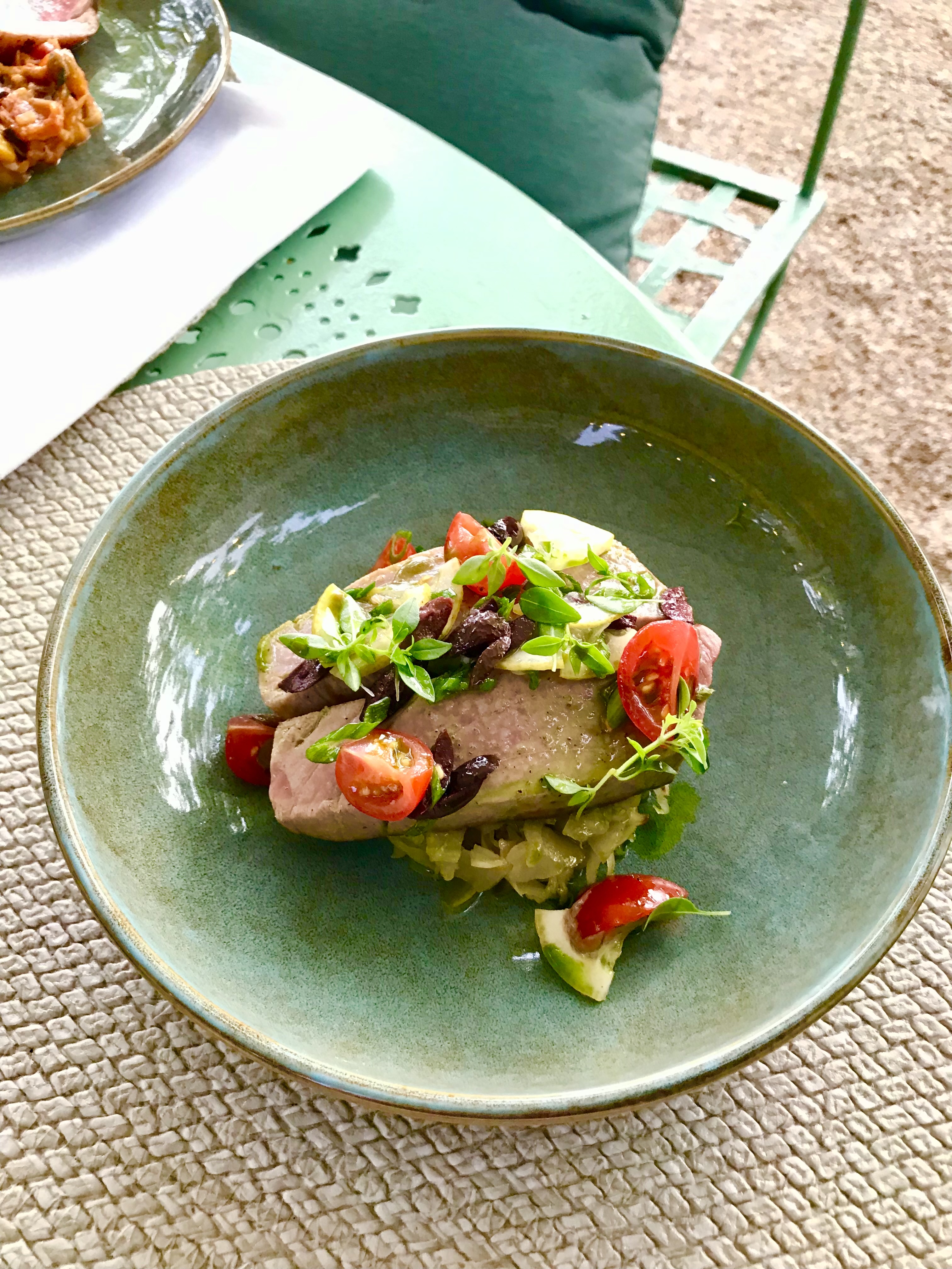 Dîner à l'extérieur dans un cadre magnifique. Nous avons pris le menu et les plats étaient bons et soignés. J'ai apprécié l'entrée avec des moules et le dessert feuilleté avec crème de fenouille et cassis. Une petite déception sur la première entrée avec les pêches qui étaient insipide et la sériole qui était légèrement en surcuisson. Nous avons passé un excellent moment entre amis.