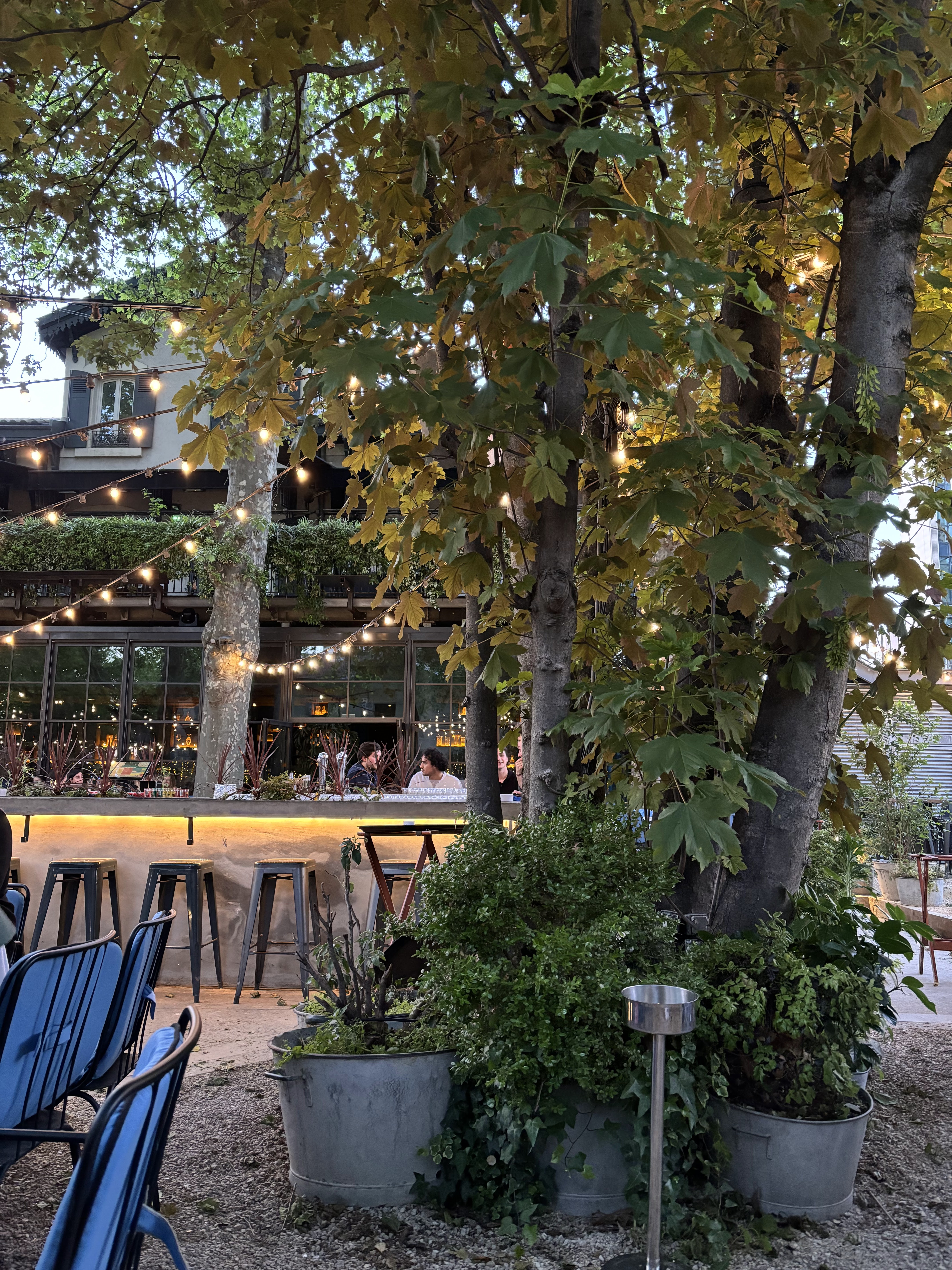 Bel endroit, le modèle dîner et puis possibilité de monter à l'étage pour finir la soirée fonctionne bien mais...pas à merveille, le service au restaurant est sans beaucoup de finesse ou est-ce le serveur qui ce soir-là n'était pas en verve et un peu rugueux dans son service? Bruyant cette salle aussi. Dommage à mon goût... Le bar d'été est également un lieu super sous l'ombrage des platanes.