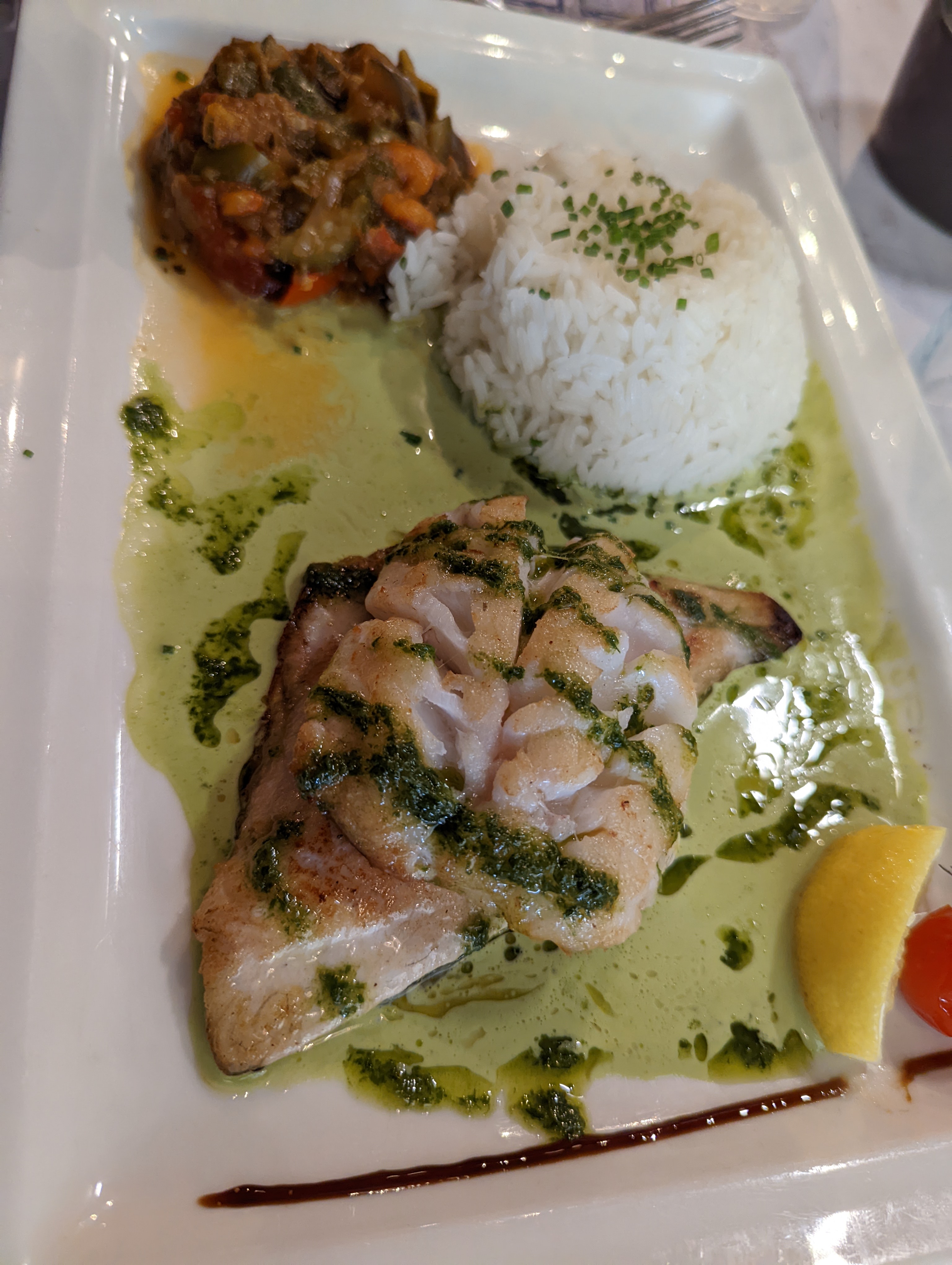 Nous avons étaient accueilli très chaleureusement en ces jours de pluies et avons profité d’une petite table avec coussin à l’écart des autres pour la tranquillité de notre bébé. Le service est impeccable et la cuisine est excellente. Nous recommandons ce restaurant a tout ceux qui recherche un moment de convivialité dans les petites ruelles de saint maxime. À très bientôt