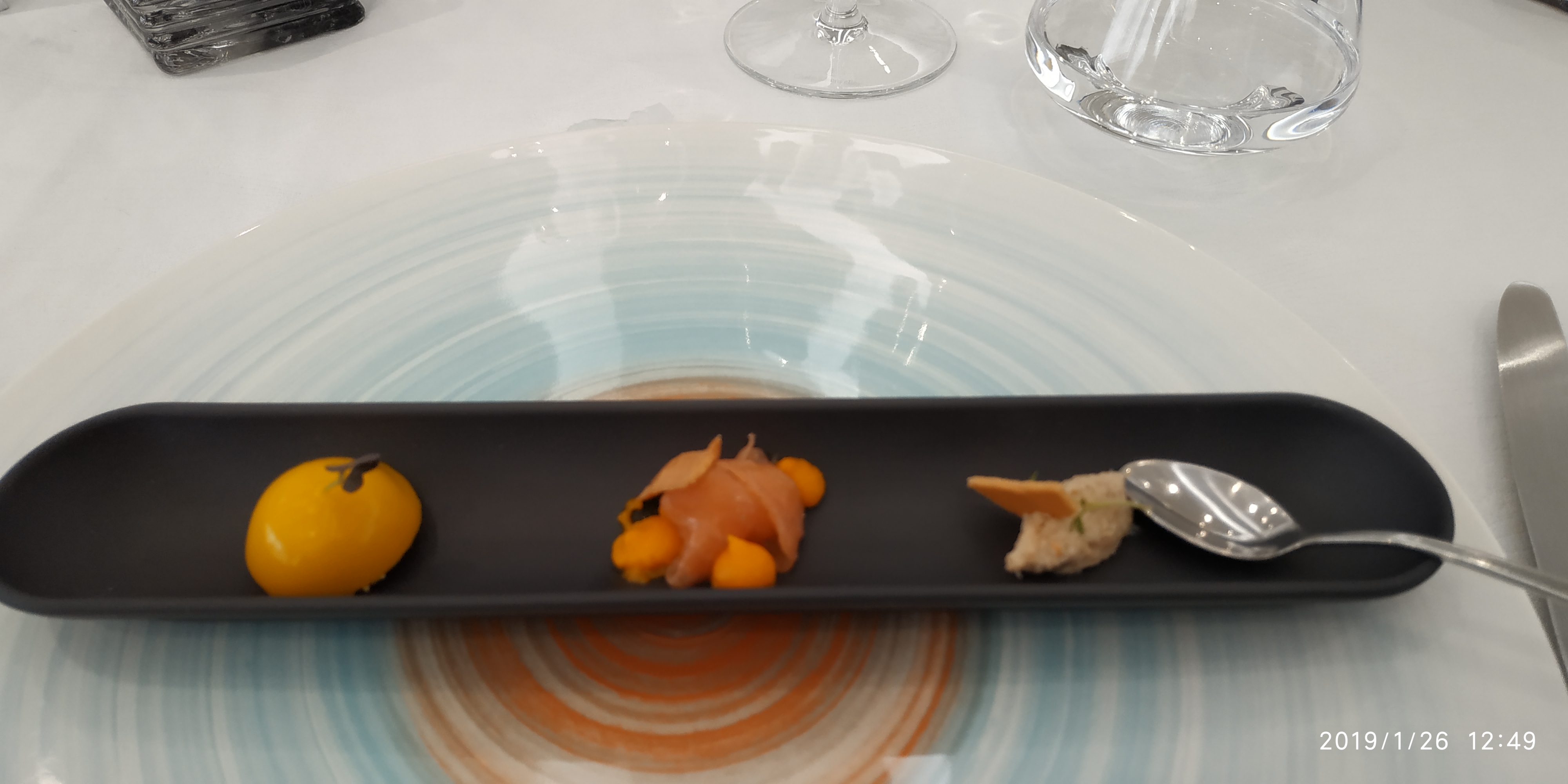 Le lieu et super quoique un peu trop lumineux. La nourriture super dommage qu'elle soit présenté dans des assiettes sombres.