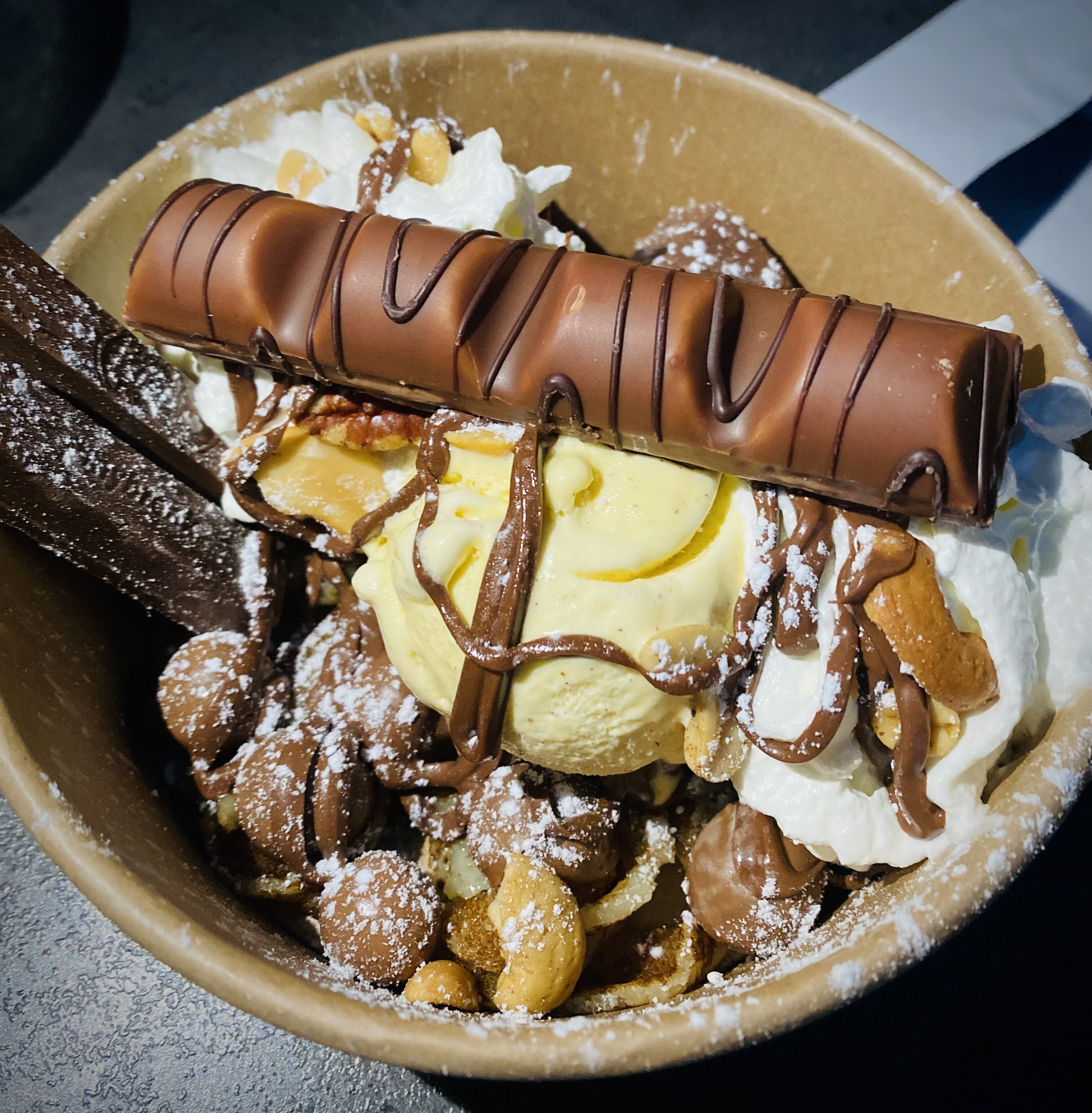 Gaufre froide donc qui sort sûrement du congélateur , nutella servie à côté , pareil pour la chantilly, c’est a nous de la préparer 🤷♀️. Pendant qu’on mange on nous coupe pour nous demande de payer … bref il est nul le resto