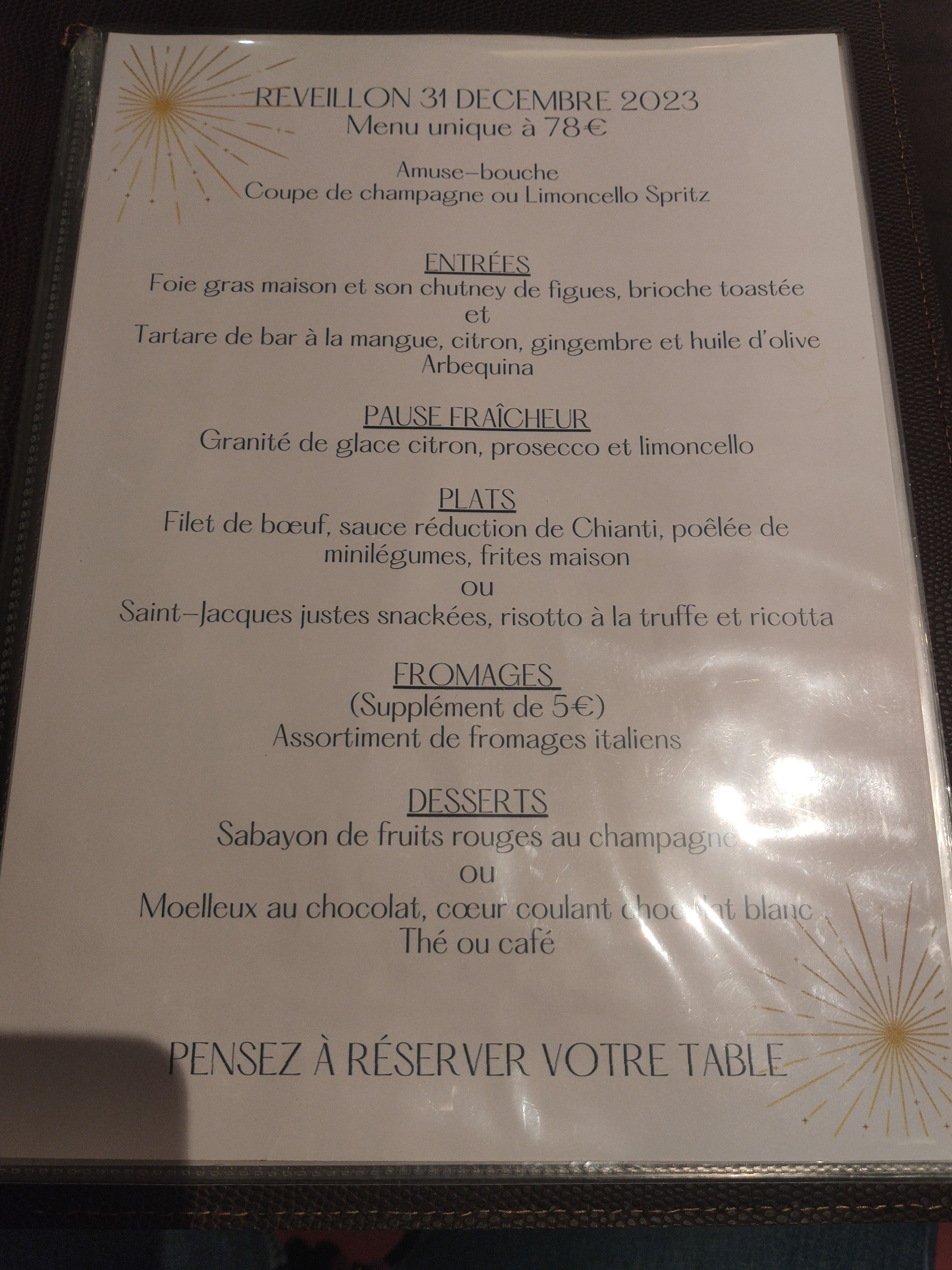 Nous sommes parti manger pour la st sylvestre le soir et franchement rien a dire ! C’était SUPER !!!🤩 très bon un menu spécial avec beaucoup de chose assiettes très bien garni . Nous repartons avec un ventre bien rempli et une bonne soirée
