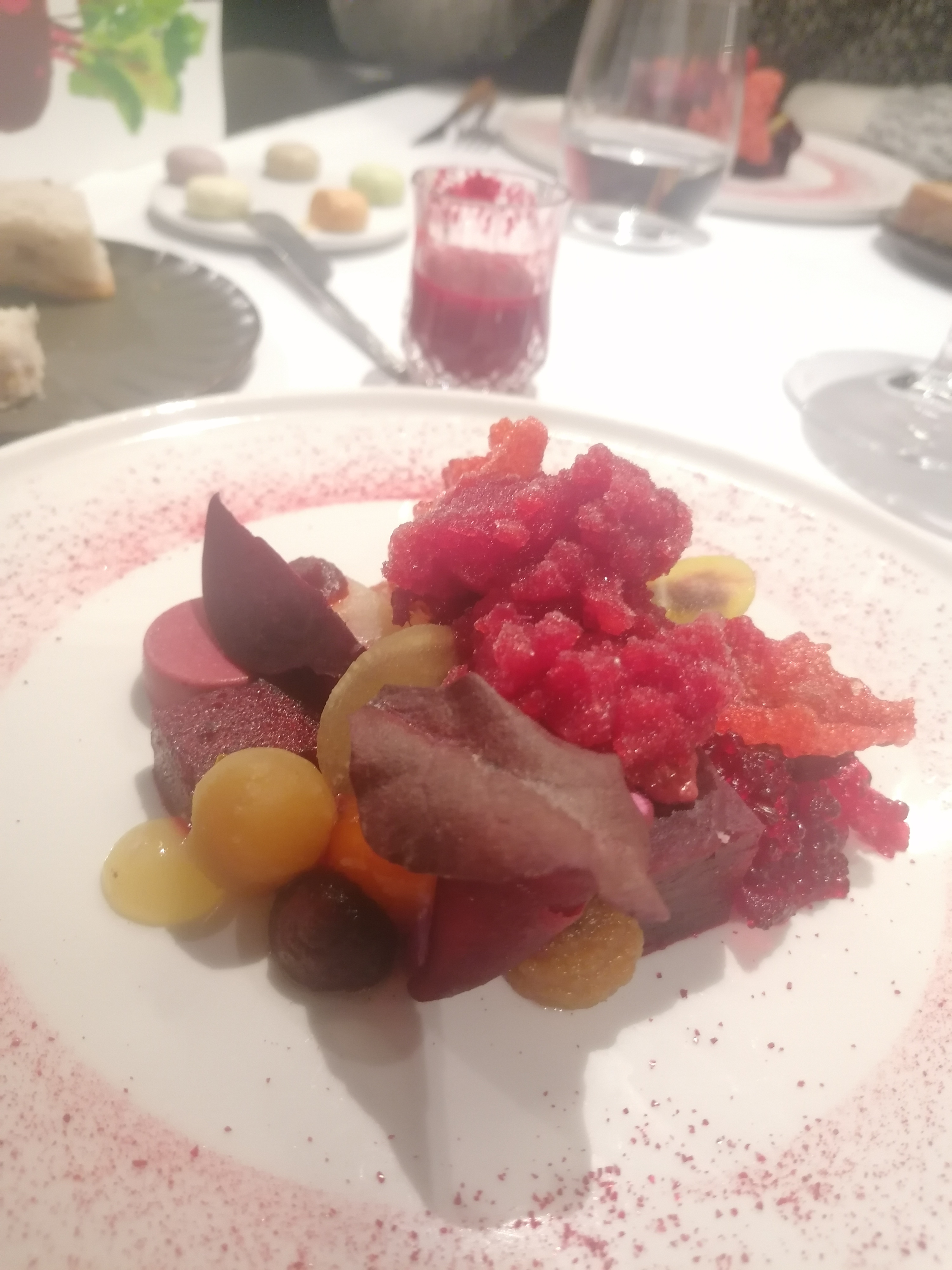 Une déclinaison exceptionnelle de la betterave en 30 variétés nous a conquis. Le service est attentionné sans démesure et l'ambiance y est discrète, adaptée mais, pourrait être plus chaleureuse. L'art de sublimer des produits simples est au rendez-vous mais nous avons regretté de ne pas avoir un seul produit noble dans le menu dégustation. ( comme une langoustine, une part de turbo ou une viande autre que le pigeon, (pièce basique des restaurateurs)