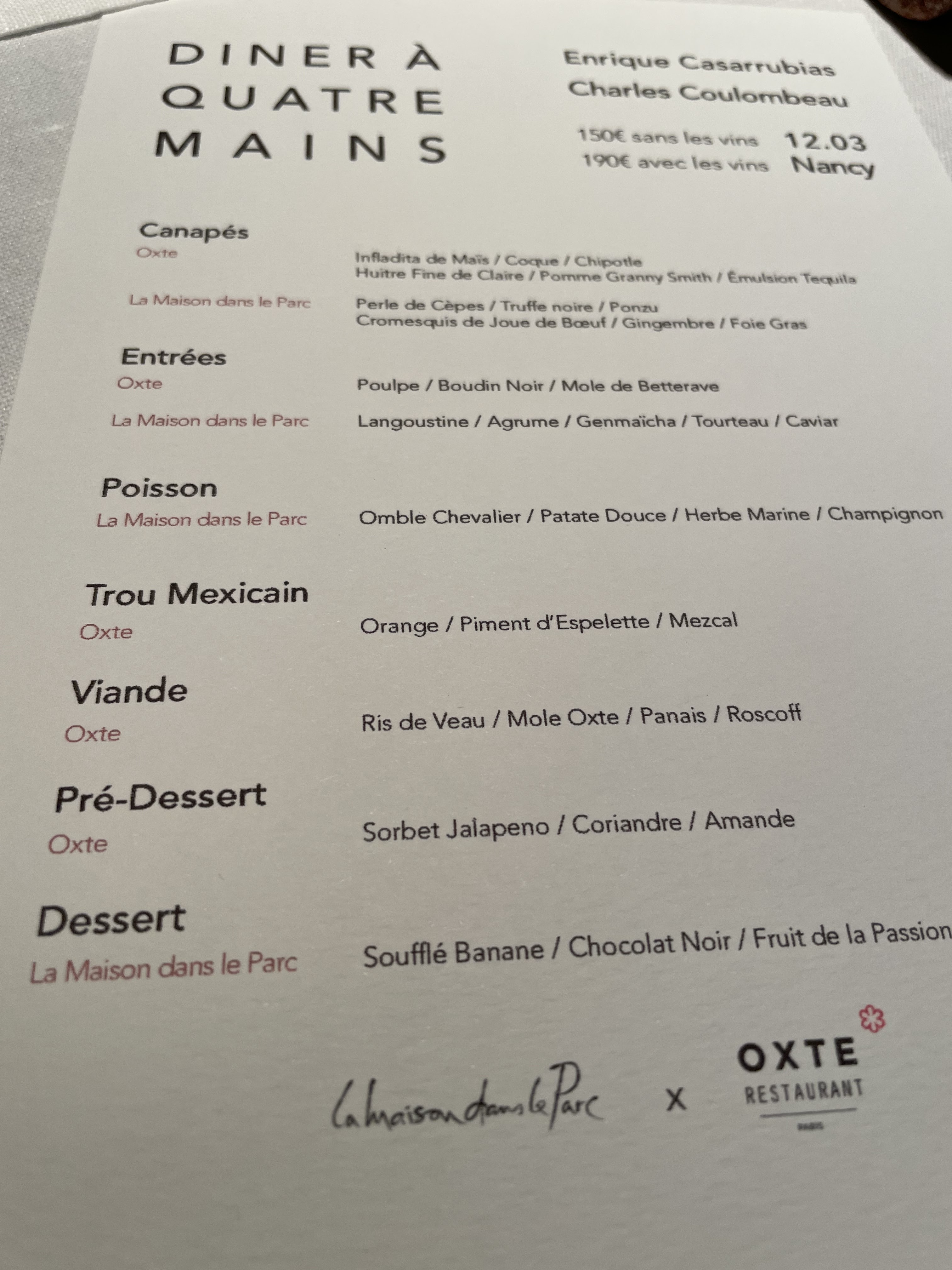 Très beau dépaysement pour ce dîner à 4 mains avec le chef étoile mexicain Enrique Casarrubias ou nous avons retrouvé avec bonheur les plats signatures des 2 chefs : un festival de saveurs , des ingrédients improbables Bravo à toute l’équipe et au Chef Casarrubias , qui avait fait le déplacement à Nancy avec son second que nous ne manquerons pas de retrouver dans son restaurant parisien OXTE Et enfin bravo au Chef Charles Coulombeau qui ne cesse de nous surprendre