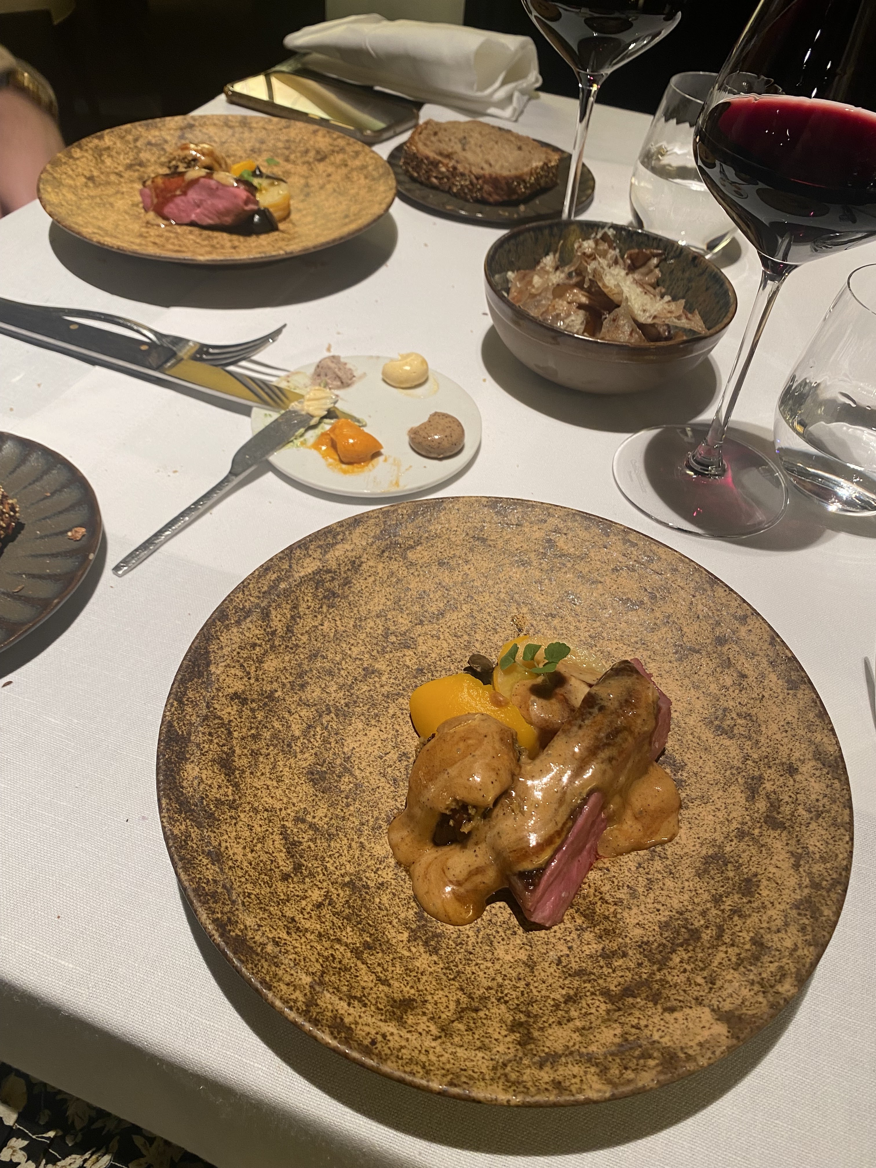 Menu les suggestions du déjeuner(entrées maquereau petit navire + terrine de betteraves;plats : cannette ; desserts :mille feuilles framboises- pistaches) avec vins ! Plats excellents, service irréprochable et très discret, cadre agréable (terrasse avec vue sur parc, et un beau ciel bleu), bref un excellent moment. A offrir ou à s'offrir