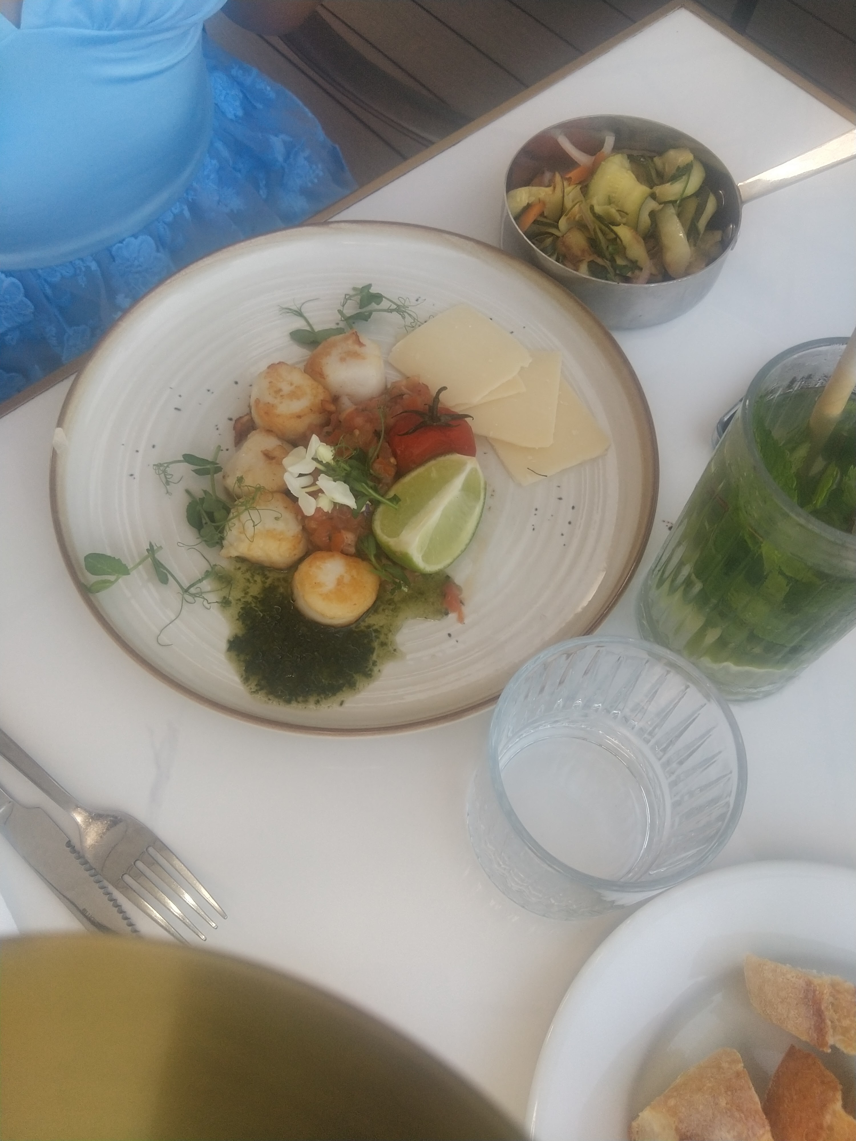 Très satisfaite. Salade de poulpe délicieuse. Serveur adorable. St Jacques de qualité. Dessert savoureux. Je reviendrai !
