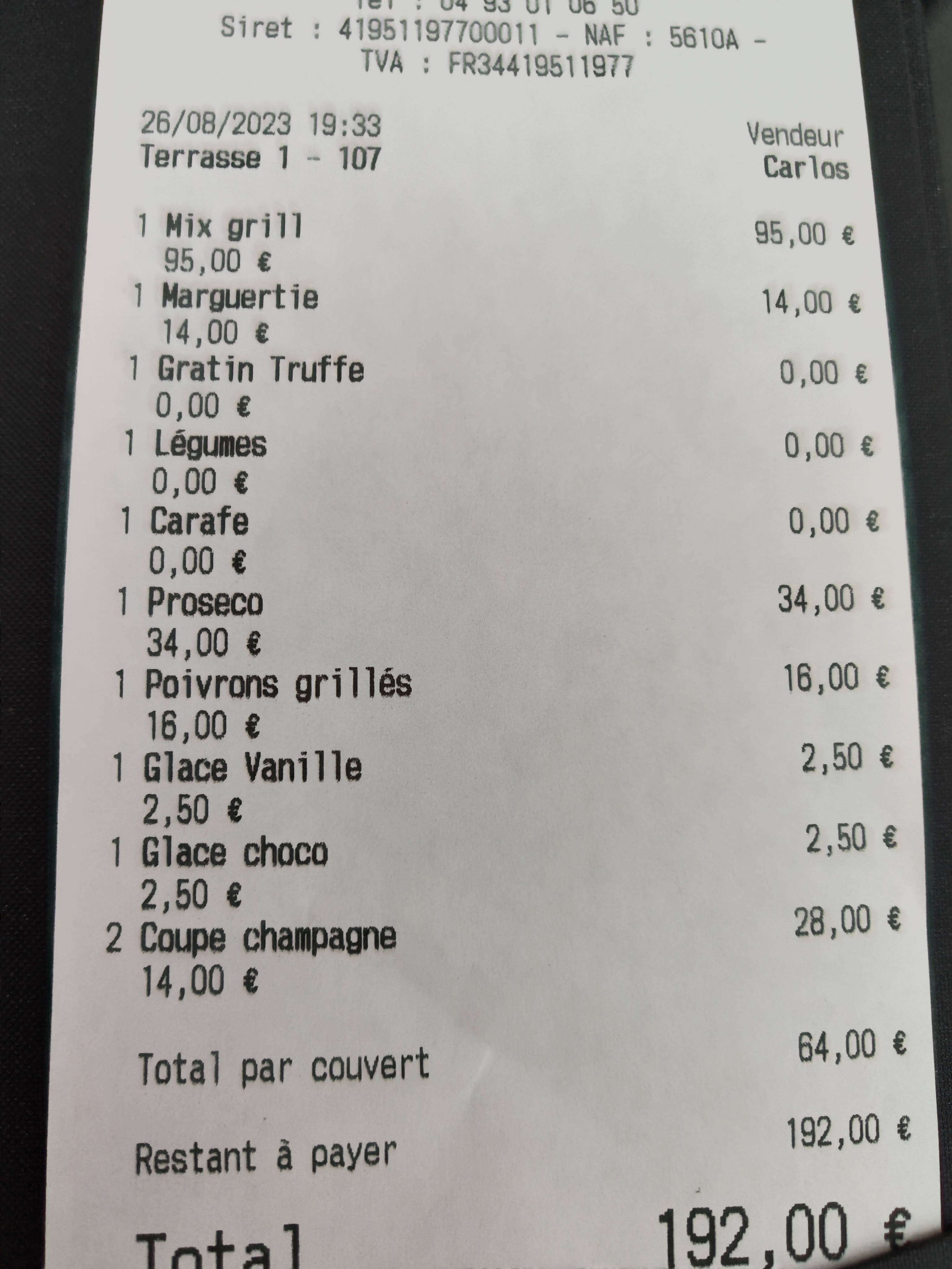 56 euros 4 verres de vin rouge. Nous avons demandé 2 salade niçoise qui était pas vraiment une salade niçoise. Présenté dans un saladier pour pour 2 et j en passe. C Est inacceptable