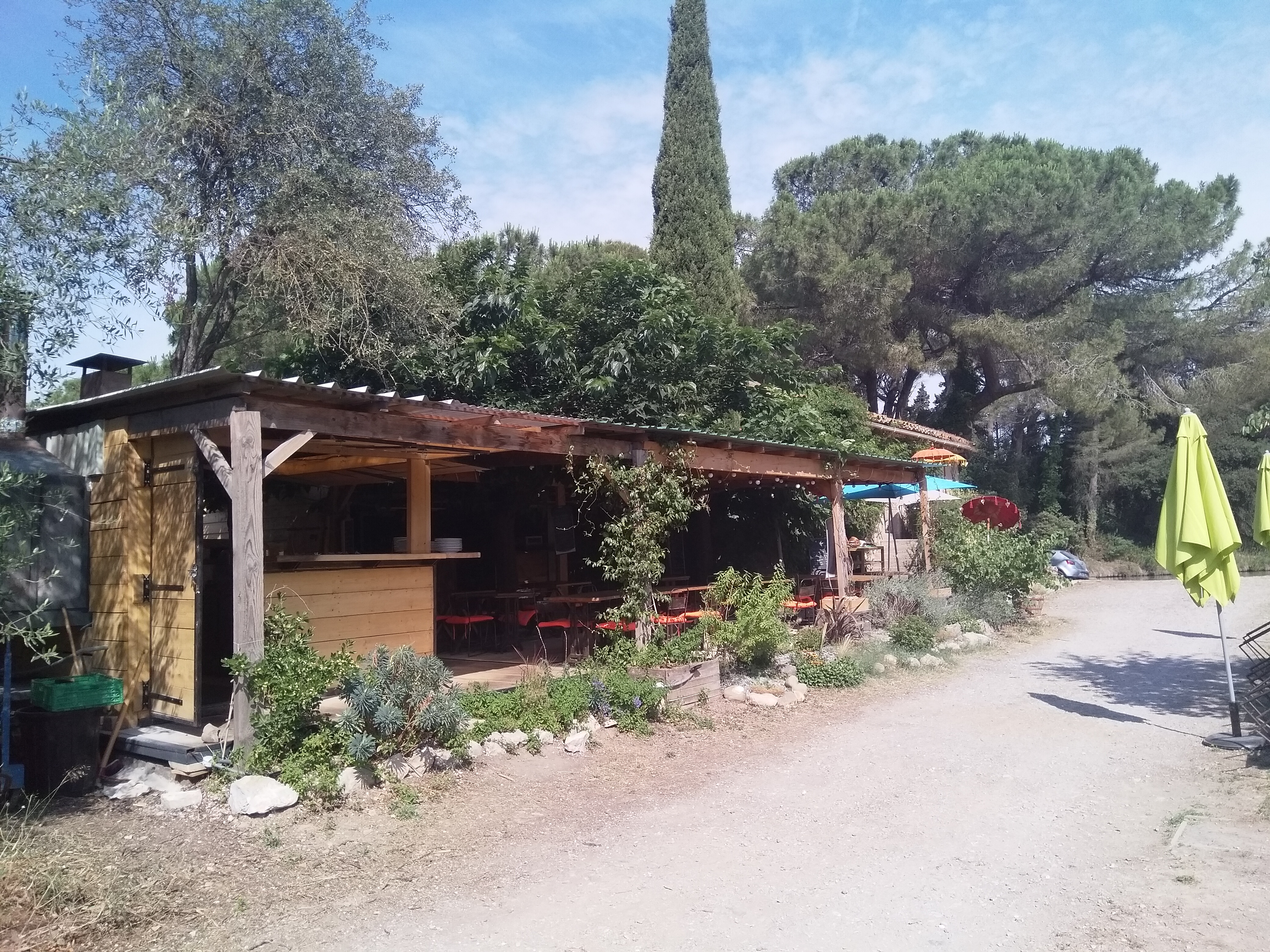 Super lieu très convivial au bord du canal de la robine et du canal de jonction. On peut y manger ou simplement y boire un coup. Une halte s'impose et sans hésitation