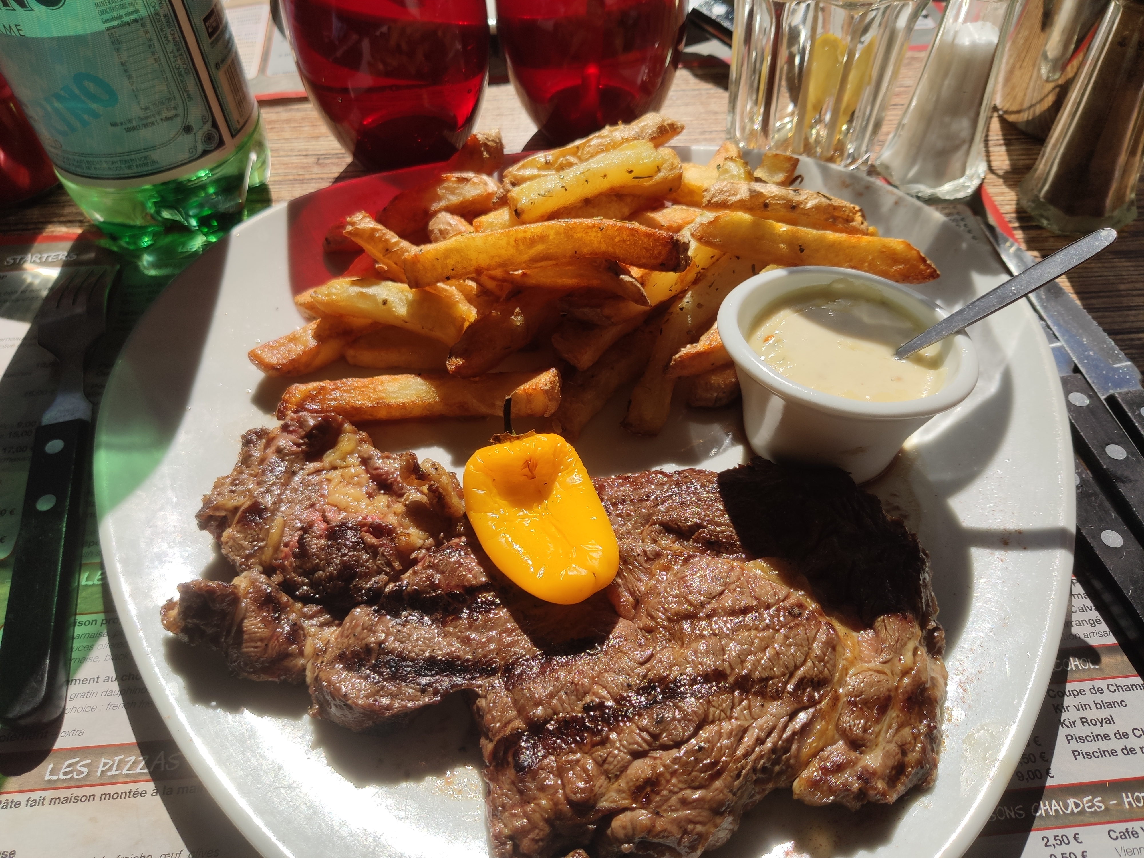 The place To be si vous voulez manger de la bonne viande; côte de boeuf majestueuse, cotelettes d agneau excellentes (oublié de prendre les photos des plats du coup...^^), bonnes pizzas et menu enfant ok. Les pièces de viande nous sont présentées avant cuisson, les préférences de cuisson sont respectées et bien exécutées! accompagnements maison délicieux (frites et gratin dauphinois). Nous connaissions cet etablissement avant le reagencement du port et n avons jamais été déçus par le contenu de nos assiettes à la maison de l entrecôte. Allez y les yeux fermés 👍