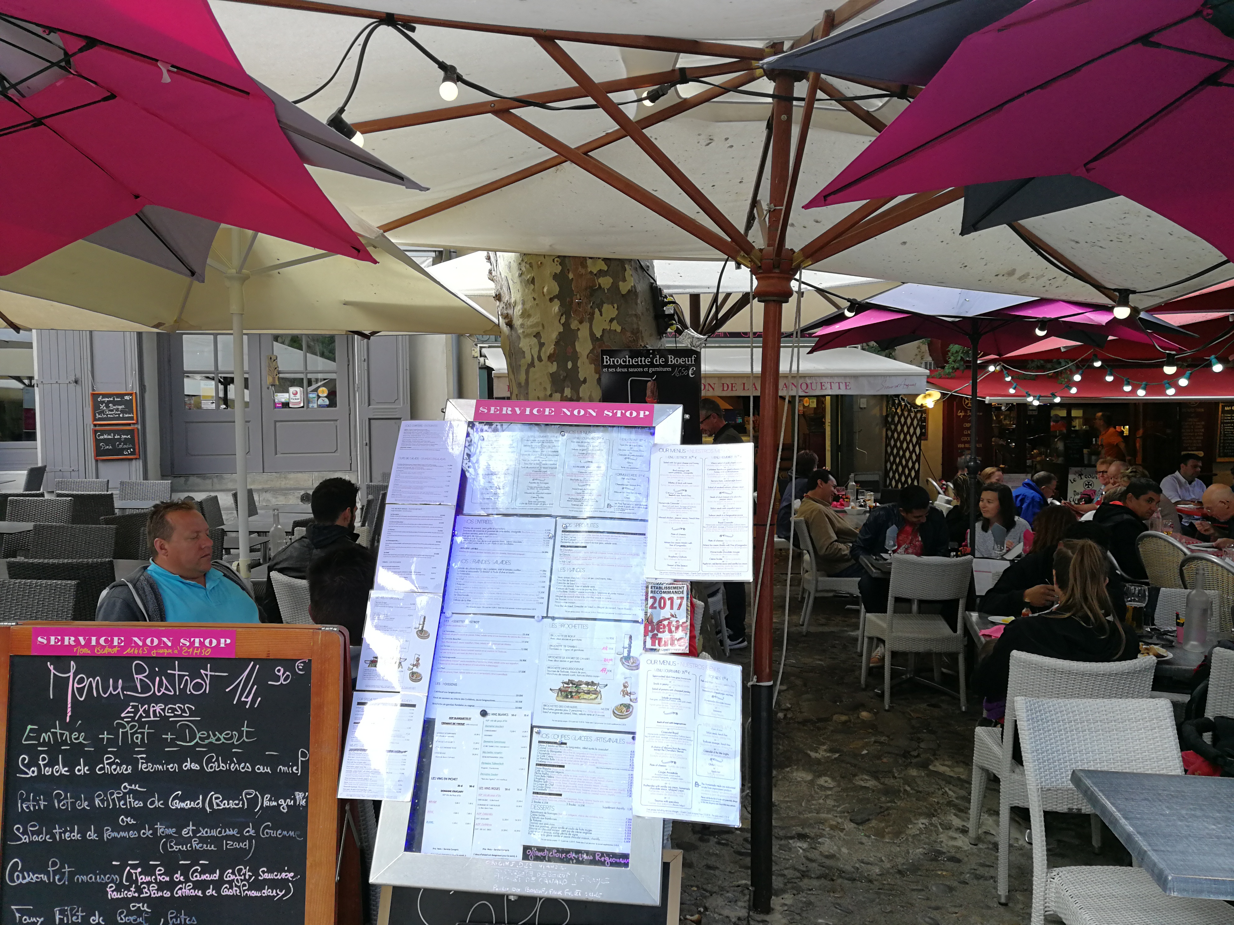 Sur la place principale de la cité . Service efficace , serveurs attentionnés et surtout un VRAI menu enfant sans frites , nuggets ou steak haché !! Je recommande !!