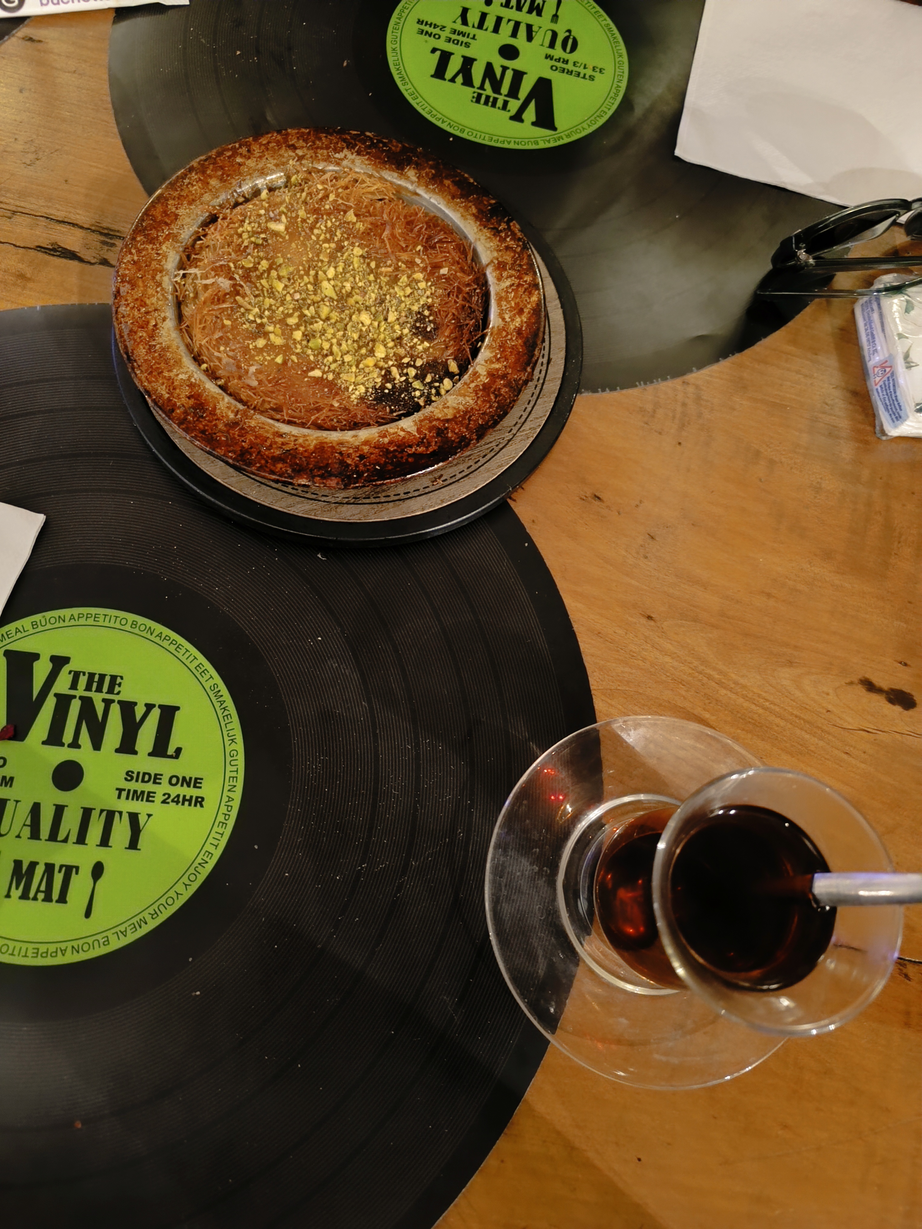 Bonjour à tou te s, Voilà un dilemme qui me chatouille 🙄. Ce petit restaurant aux accents exotiques, dont les jeunes serveurs sont tout à fait charmants. Dans un décors très typique de la région, le cadre ne déroge pas à bien d'autres restaurants dans une ville médiévale. Même si quelques tableaux, accrochés aux murs, nous rappelle quelque peu la Turquie. Les tables, et leurs décorations n'ont pas trop trouvé, à mon goût, une envie de voyage. Même si les sets de table en forme de disque vynil restent originaux, ils ne m'ont pas vraiment excité... Bon, mais, me direz vous, c'est pas tout cela qui me fera manger, et c'est bien pour ceci que je suis venu. La carte est à la limite du compliqué. Je dis limite, car au-delà du nombre de plats proposés je me serait méfié. Je vous laisse découvrir cette carte bien remplie. Ce que j'en dirais, c'est que les plats proposés sont pour la plupart plutôt simples, et que pour les prix annoncés (10€ l'entrée, 22€ le plat, 6€ les desserts...), je ne les trouve pas justifiés... La cuisine était somme toute très bonne, peut être les baklavas plutôt trop cuits... Si je devais y retourner, il faudrait que ce restaurant fasse de sérieux efforts sur l'ambiance. Et s'il fallait commencer par quelque chose, c'est pour les prix : je conçois qu'un menu à 22€ serait plus en adéquation avec se que l'on a dans l'assiette, à l'inverse d'une carte qui porte le repas complet pour une personne à plus de 40€... Je souhaite, tout de même, bonne chance et longue vie à cette jeune entreprise... Merci à tous celles/ceux qui ont pris le temps de me lire... Et si le cœur vous en dit, merci de partager 😉