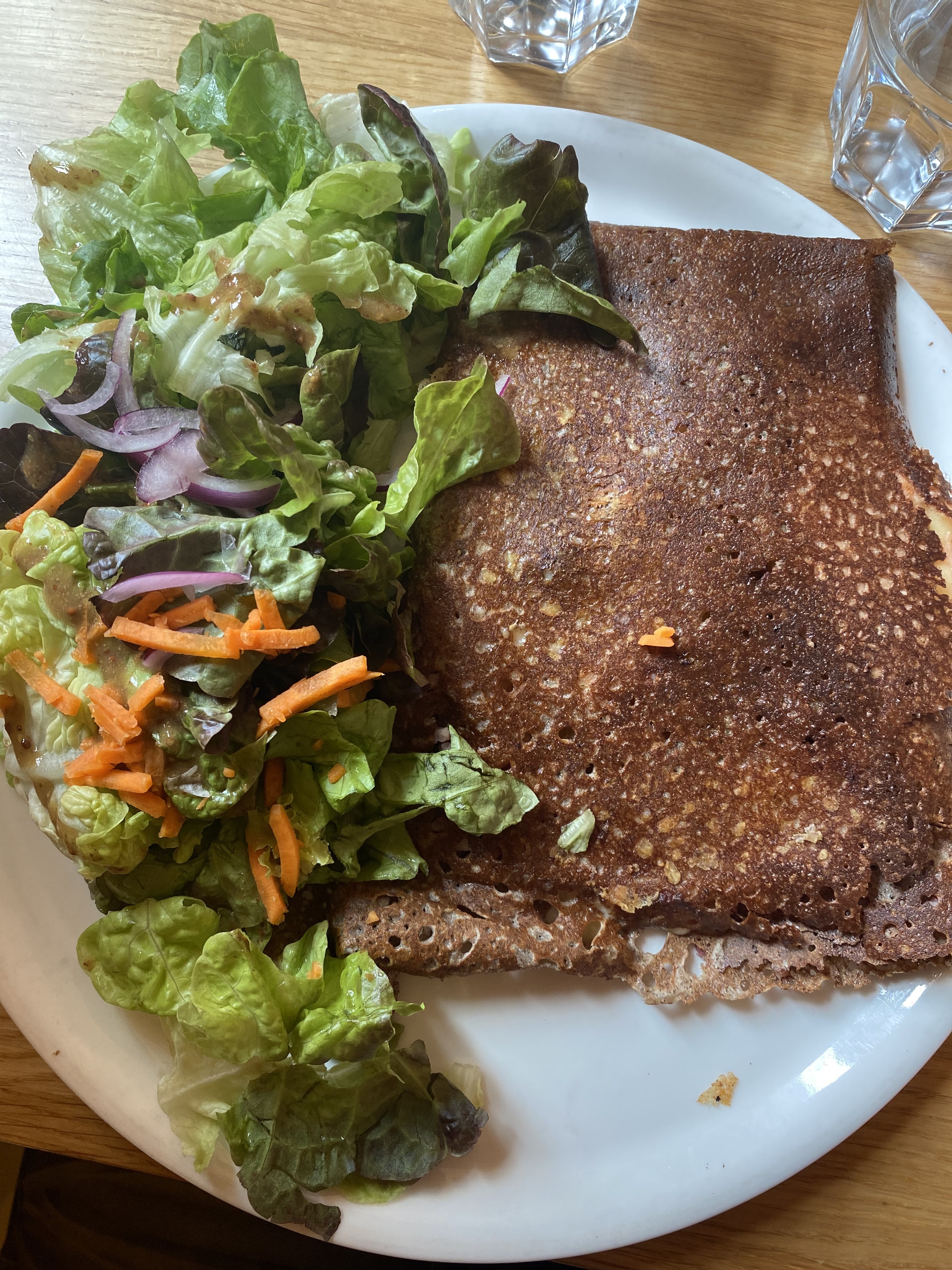 Entre les galettes et les salades c est vraiment bien servis et bon... Les salades sont copieuses et délicieuses et les galettes bien garnies et délicieuses..je recommande ce restaurant.