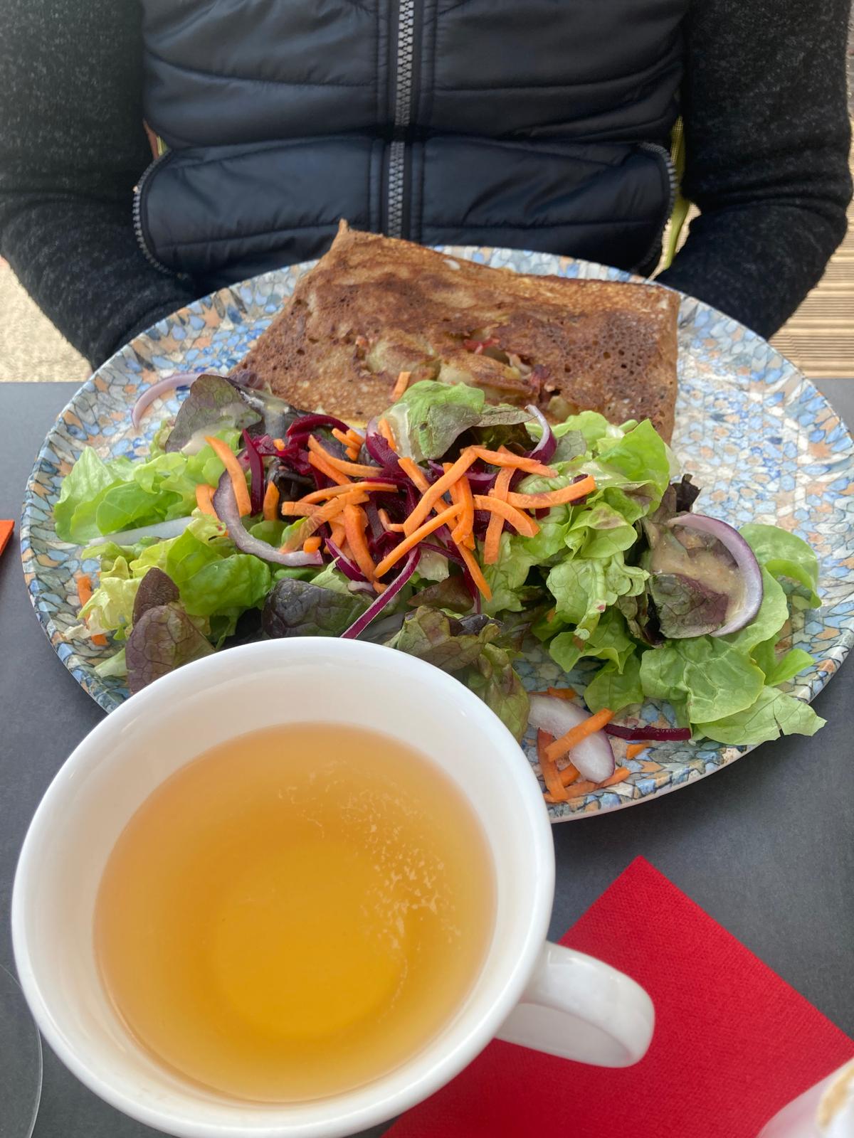 Très bon passage, ambiance chaleureuse et jolie décoration. Equipe agréable, peut être un soucis d'organisation car nous avons eu pratiquement tous les serveurs qui ont défilés. Plats excellents et copieux. Bon nombre de choix de galette et très bonne. De très bonne frite et desserts fait maison. Nous nous sommes régalés et regrette de ne plus pouvoir y aller. Petit regret, l'établissement ce dit salon de thé mais nous ne l'avons pas vu ouvert de l'après midi en semaine, très dommage !
