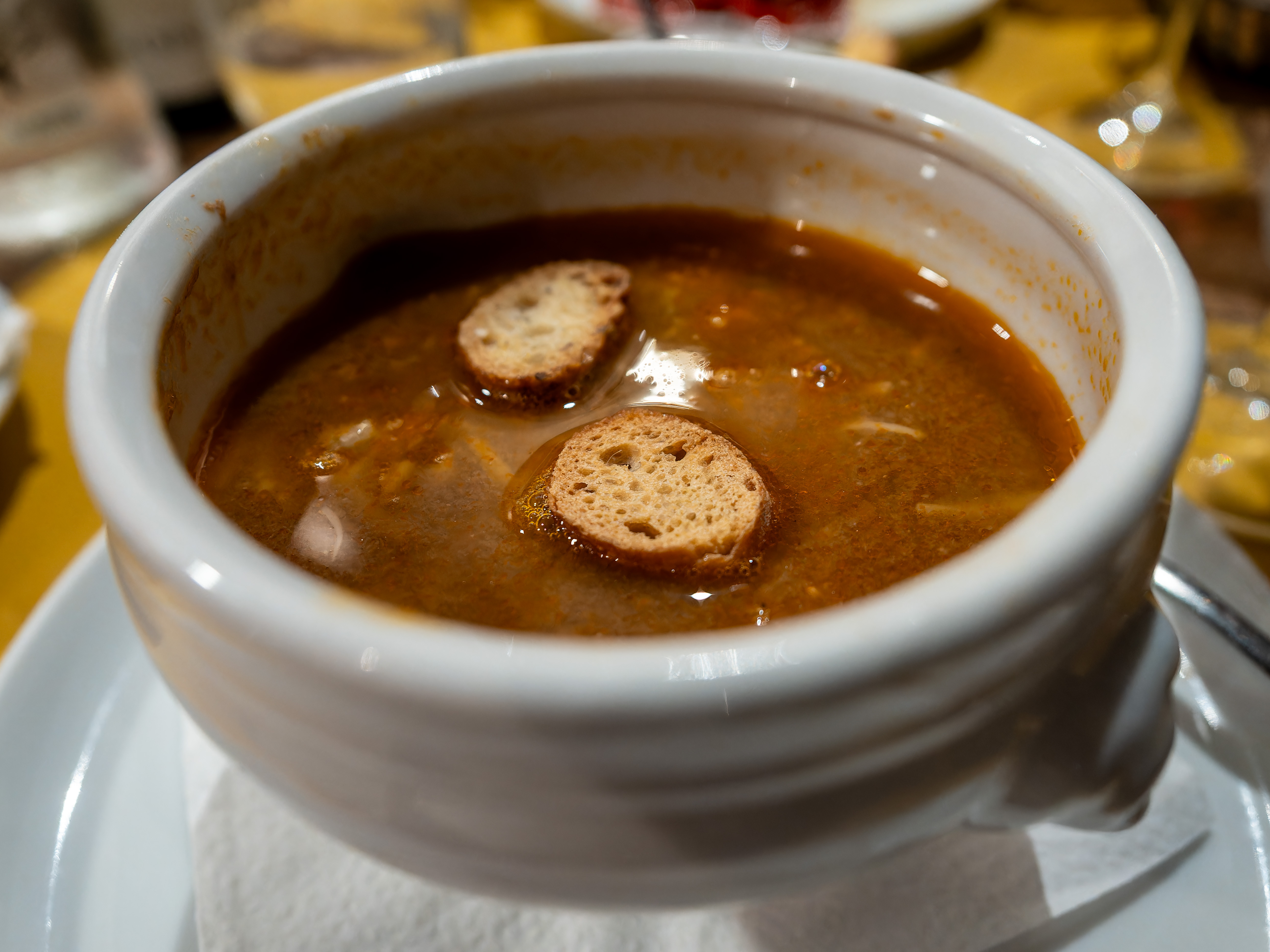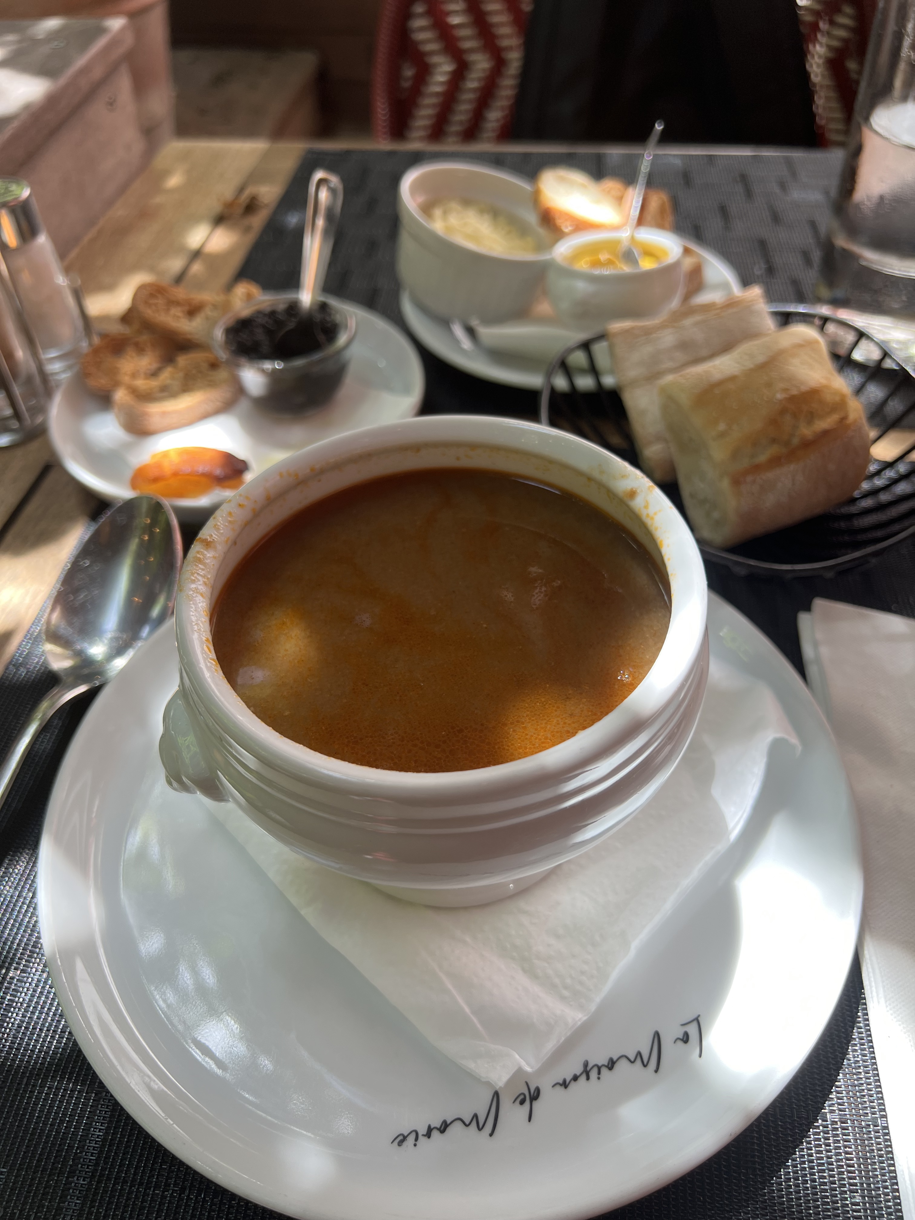 6 personnes ont pris le menu : Le plat d'oignons était correct, du pain préparé accompagné de 2 morceaux d'anchois. loin du niveau du restaurant. Les poivrons rôtis étaient la chose la plus insipide que nous ayons essayée en France. La soupe de poisson n'était pas disponible. Le veau était bon, les gnocchis ils ont oublié de l'apporter donc je ne peux pas faire de commentaire. J'ai également oublié les desserts pendant une heure, mais ils étaient une édition gastronomique typique de Lidl. Service les sourcils haussés (photo incluse).