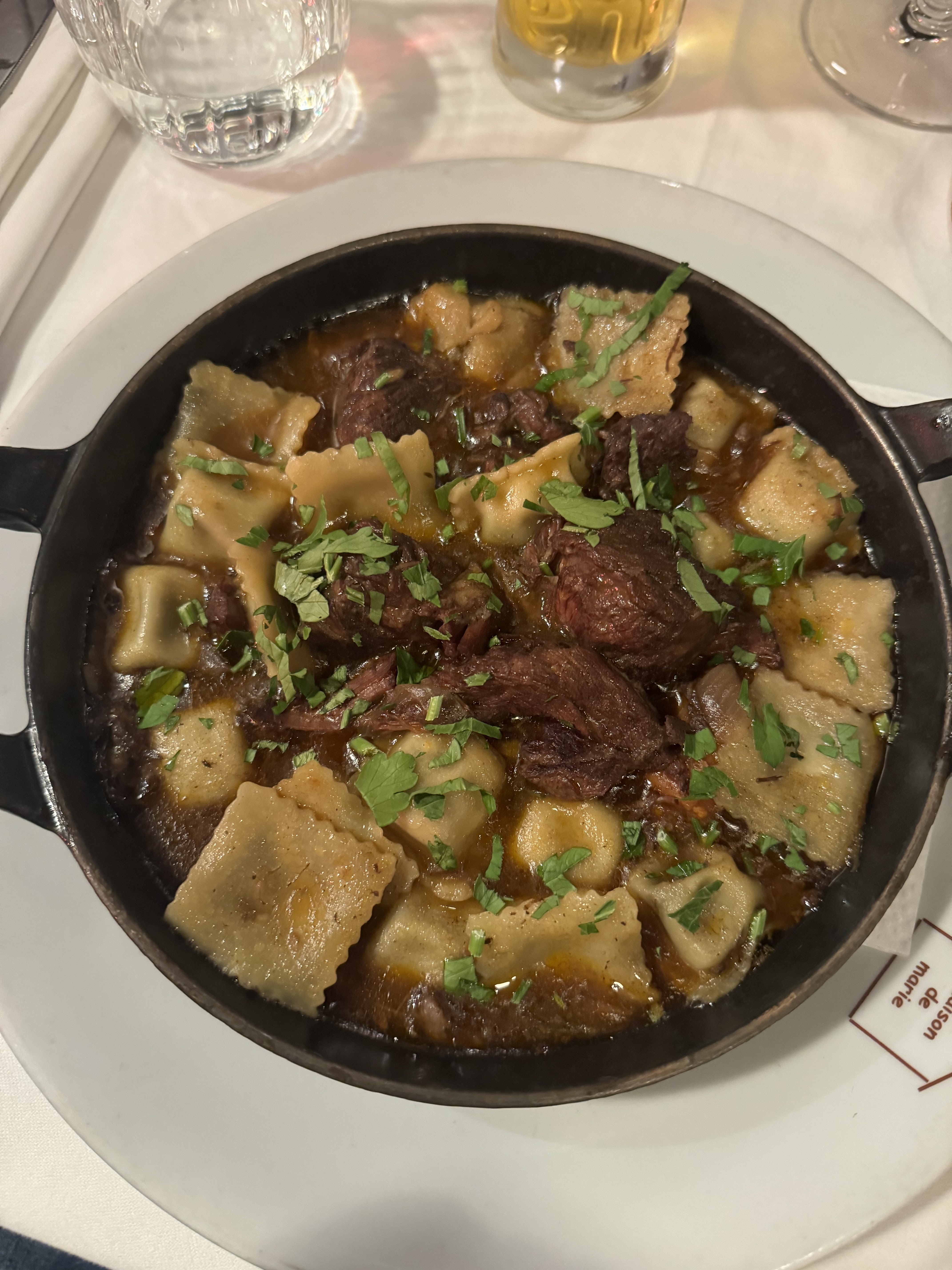 J'ai beaucoup apprécié mon déjeuner à La maison de Marie. J'ai commandé le Daube qui est un ragoût de bœuf et de raviolis au fromage. C'est un incontournable lors de votre visite à Nice. Le serveur a fourni un excellent service. Ils proposent également un menu du midi avec entrée, plat et dessert pour 26 euros.