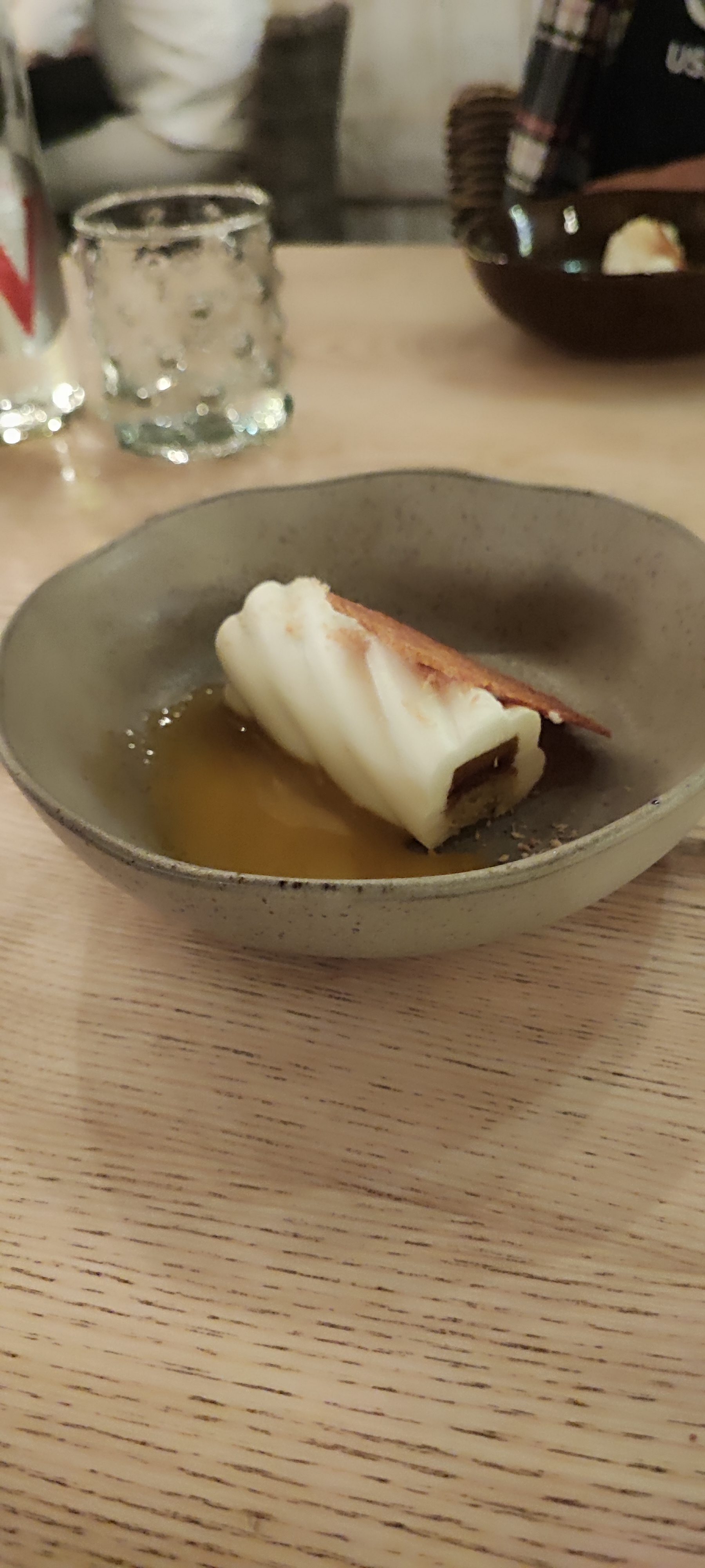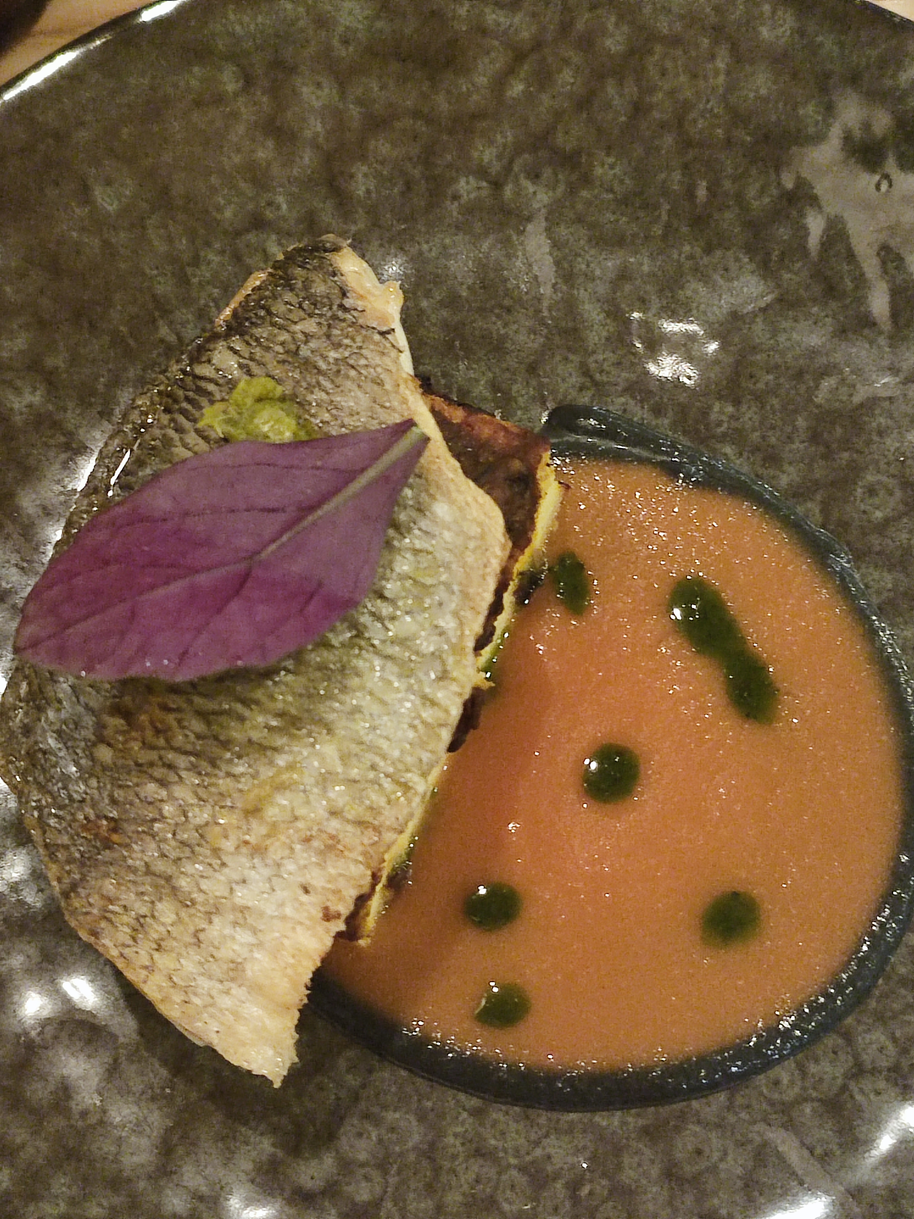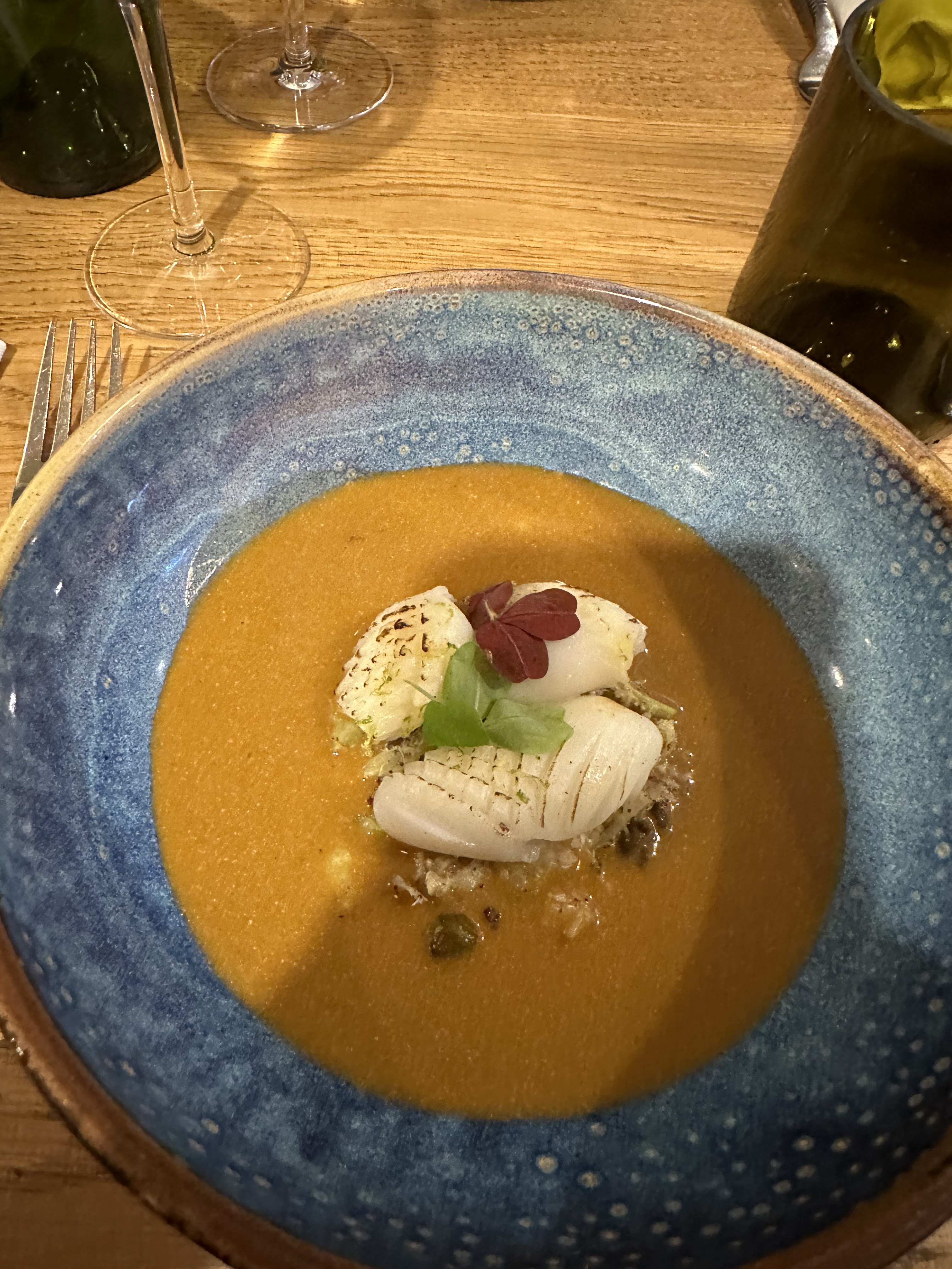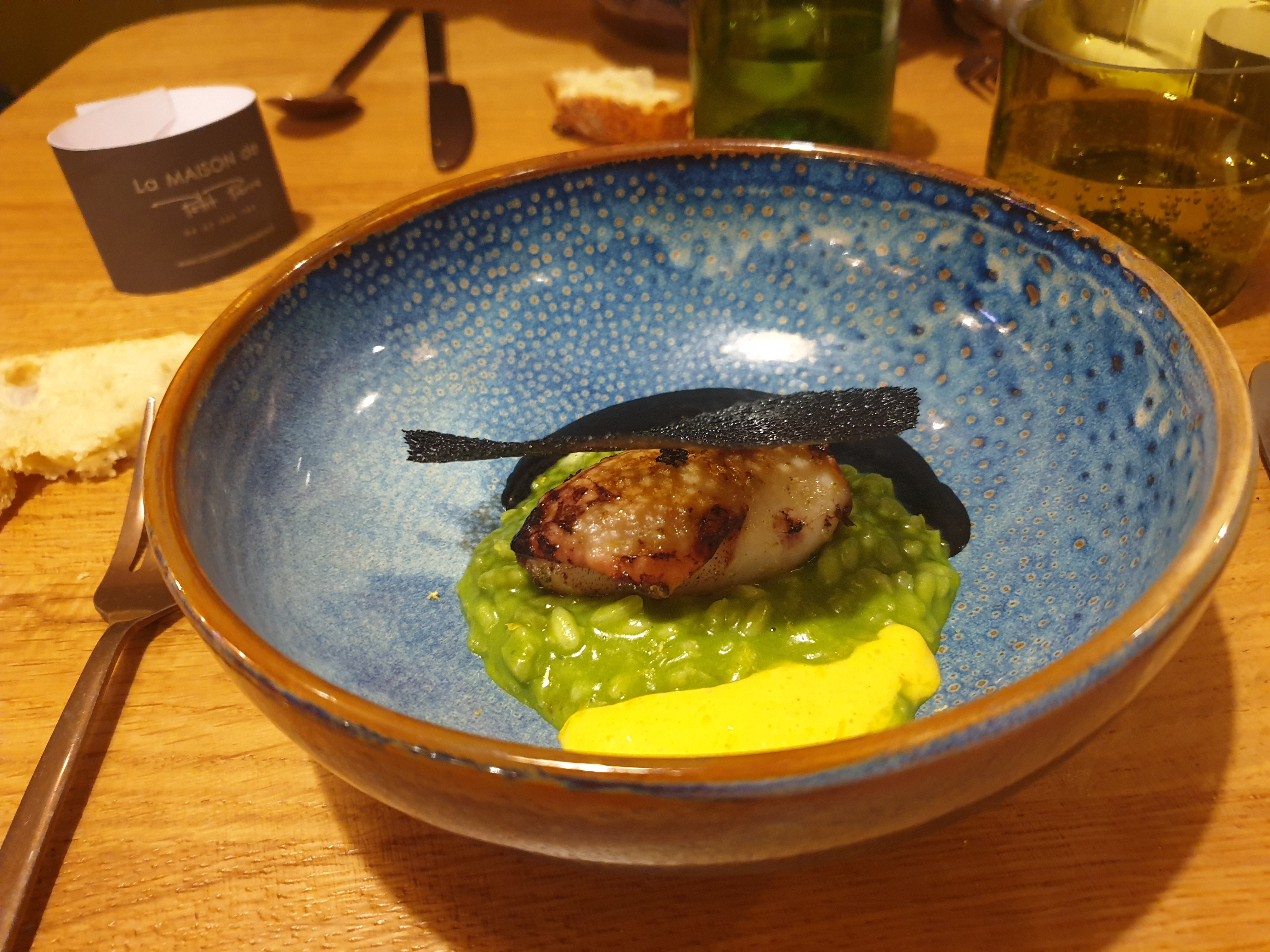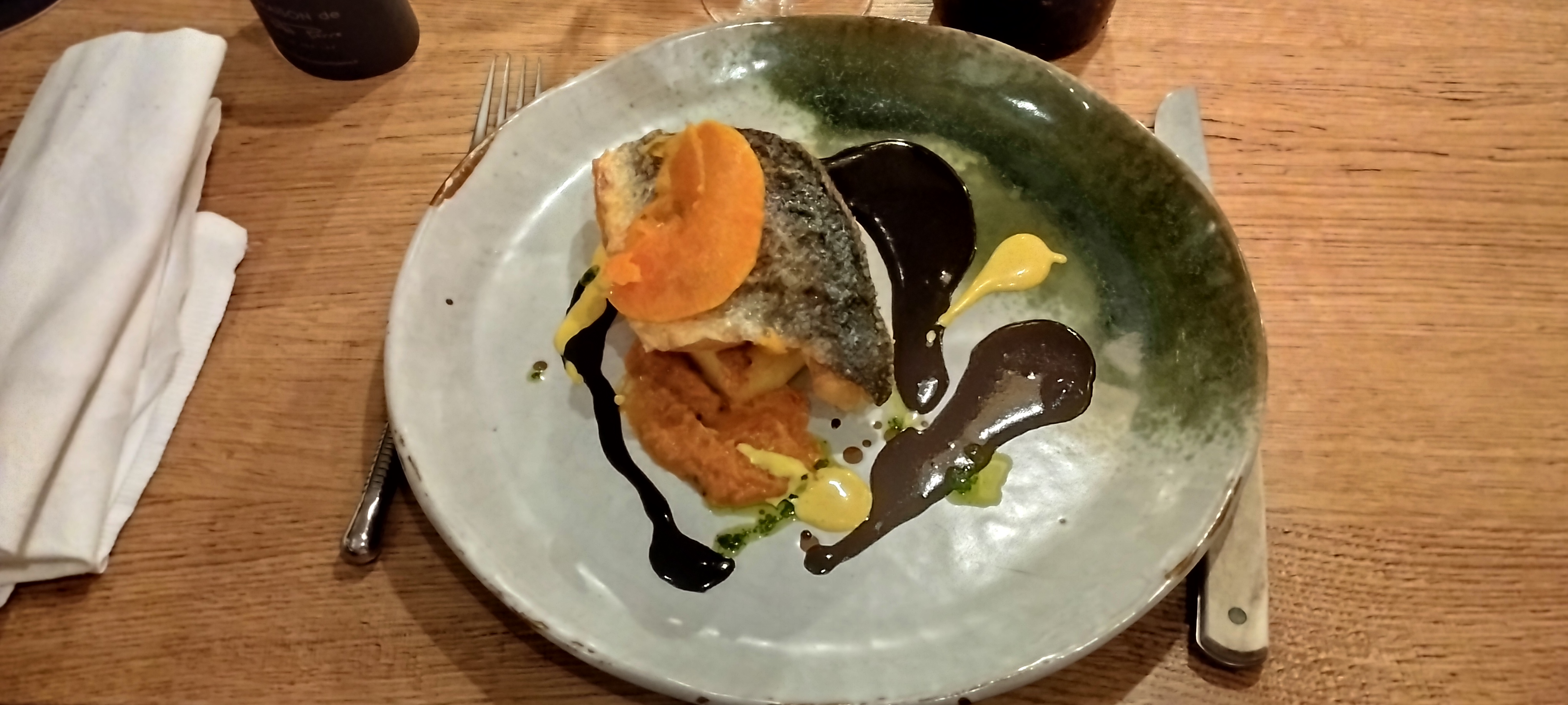 Comme toujours bon accueil et service et cuisine excellente, une bisque comme celle de ma grand-mère pour accompagner des calamars juste cuit à la flamme, et découverte de la feuille de cerisier croustillante avec une canette divine. Merci encore