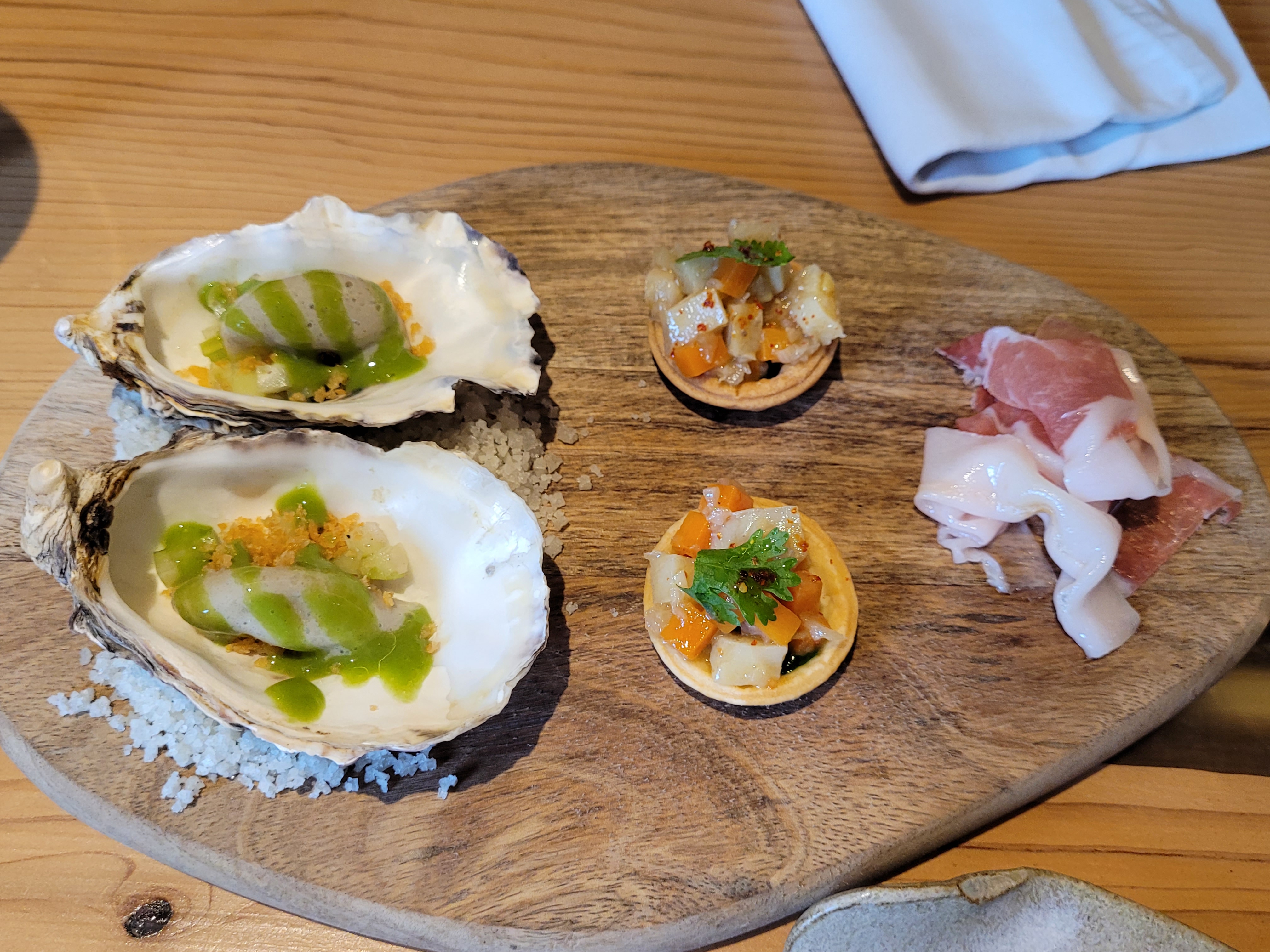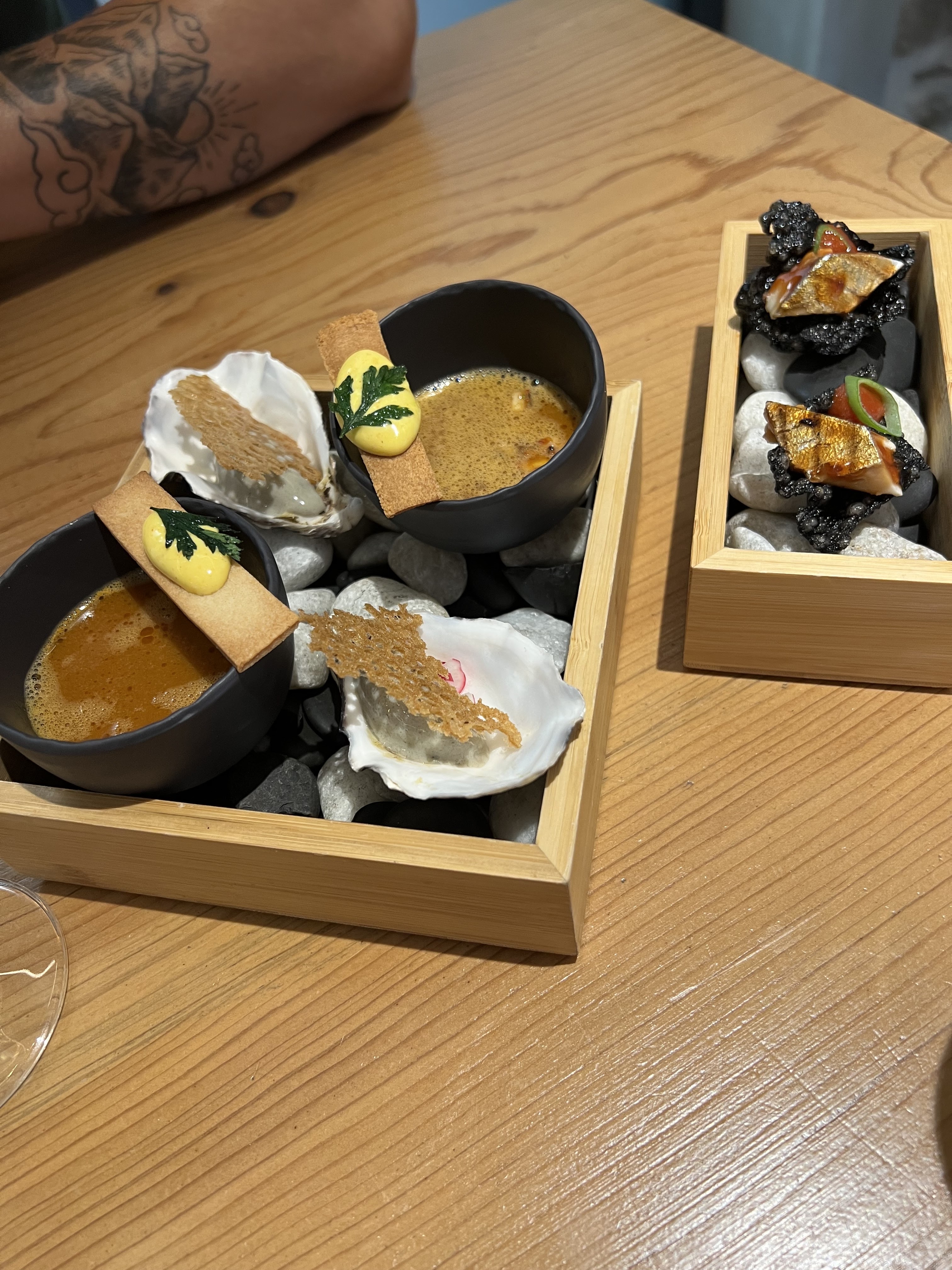 Dans l'assiette c'était bon, surprenant et créatif, pas copieux, mais au vue des nombreux plats c'est très bien. Dans la salle le concept est gâché par un mauvais service, tellement surjoué! Ni moi, ni mes convives n'avons compris ce que nous allions manger, et la serveuse était bien trop aggressive. On offre un choix en 4 type de pains, mais il faut quémander chaque tranche... Ambiance resto chic mais musique pop genre début de soirée. C'est dommage, je ne recommande pas.