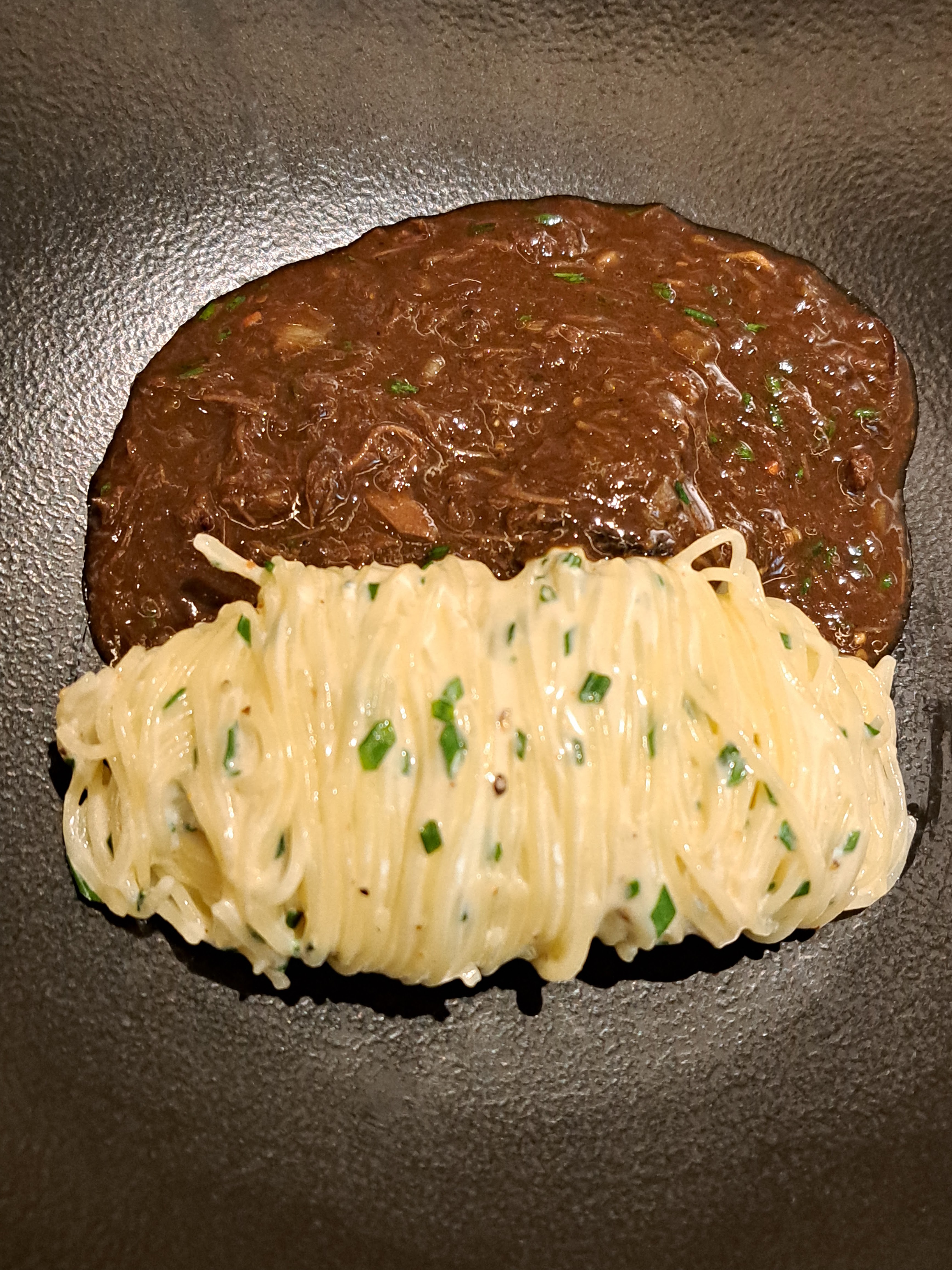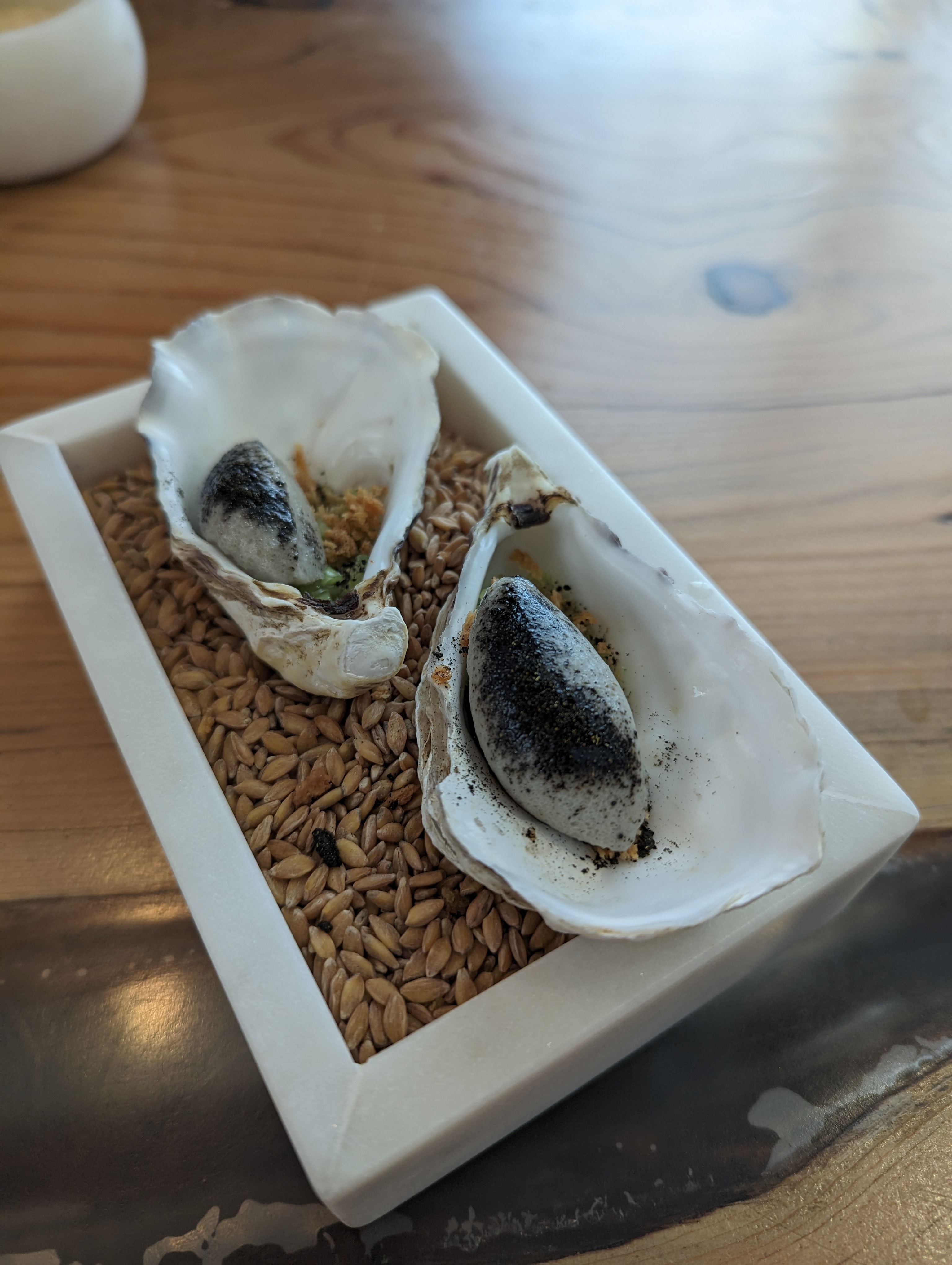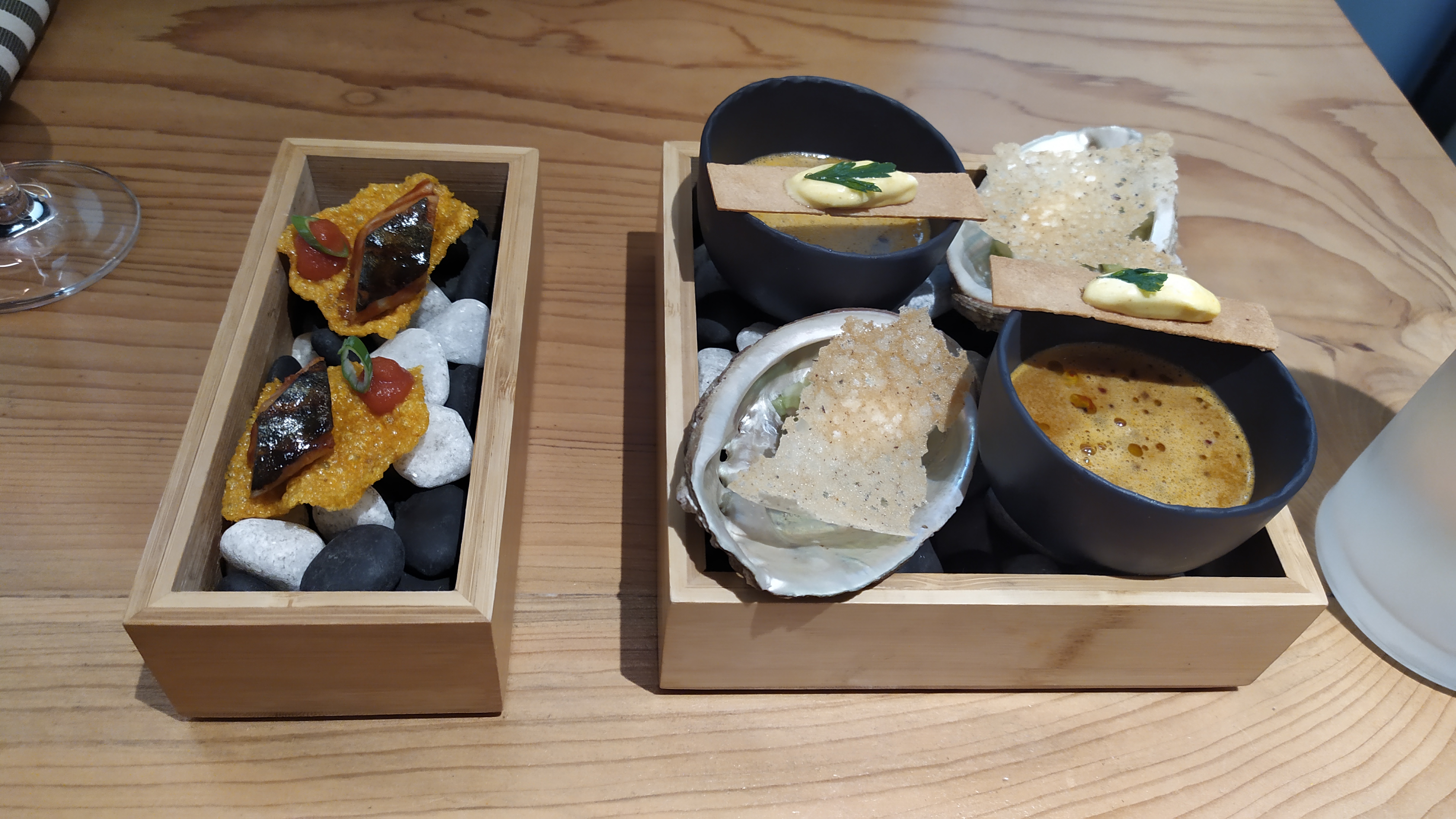 Plongée immersive et subtile dans la créativité des deux chefs, on se laisse surprendre par leurs propositions au gré de leurs envies. Décor et ambiance épurés, tables orientées vers une cuisine ouverte, véritable scénographie au geste assuré, nous sommes en prise direct avec cet art majeur qu'est la gastronomie sans être ostentatoire.