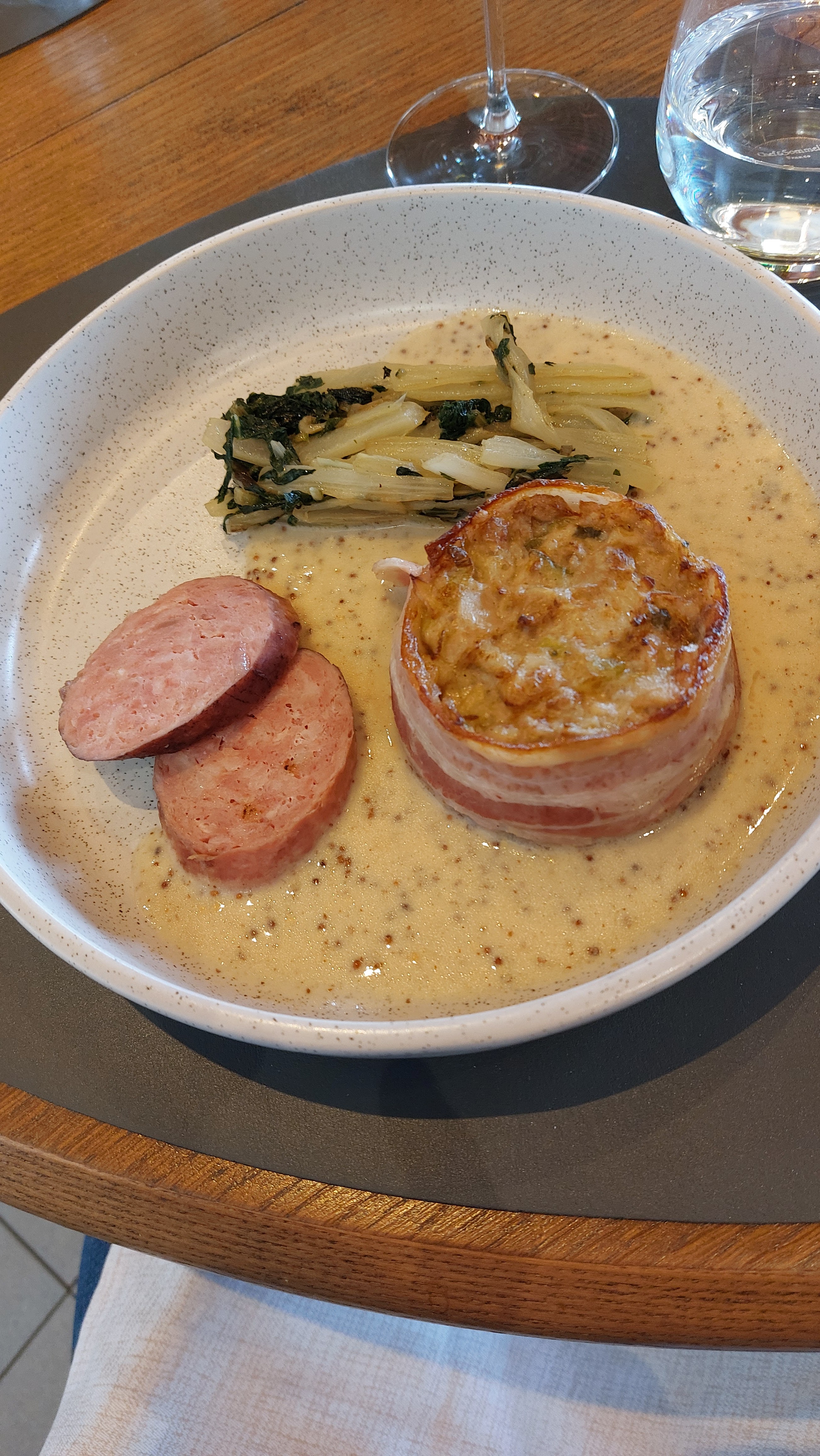 Plus rien à voir avec l ancien établissement. Là on est sur des plats gastronomiques. Pour ma part j ai pris en entré croustade aux rognons, sur la photo c est des queues de lotte avec une sauce au homard,et comme dessert un gâteau chocolat noisette Je recommande cette adresse