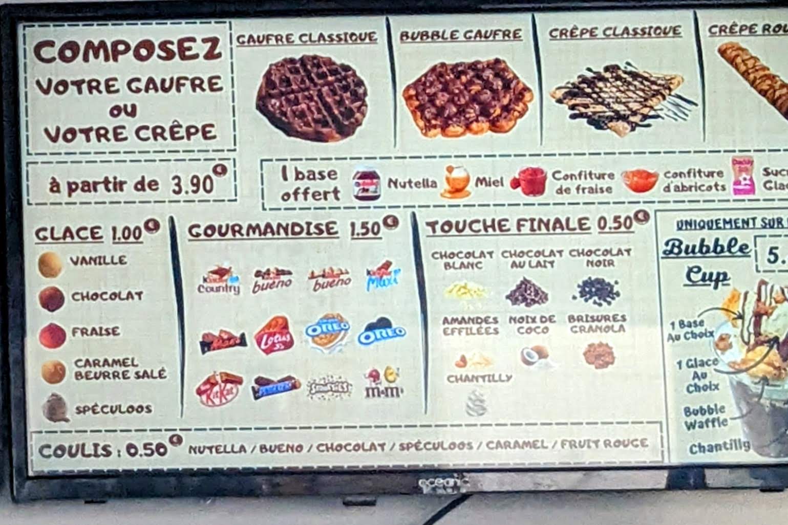 Accueil chaleureux et concept original. Notre groupe de 18 personnes à savouré les bubbles Gaufres salées délicieuses puis des Gaufres sucrées tout aussi bonnes. On recommande ce lieu pour son gérant d'une immense gentillesse et pour ses surprenantes Gaufres façon burger.