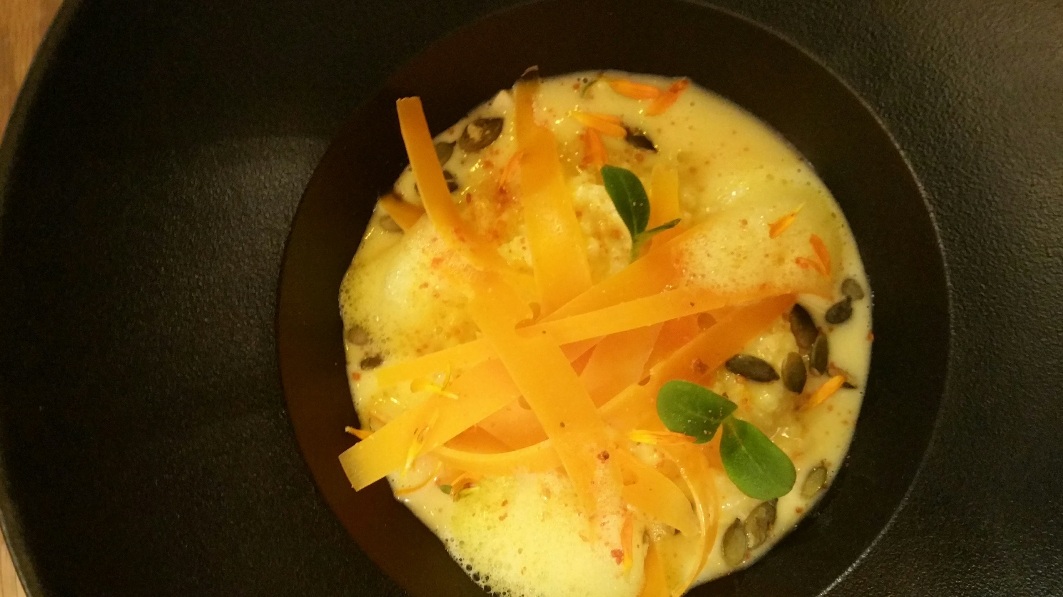 Originalité mais vraiment petite quantité notamment les légumes 2 petites pommes de terre grenaille et champignons qui se battaient en duel vin très cher .tout est très cher menu non explicité