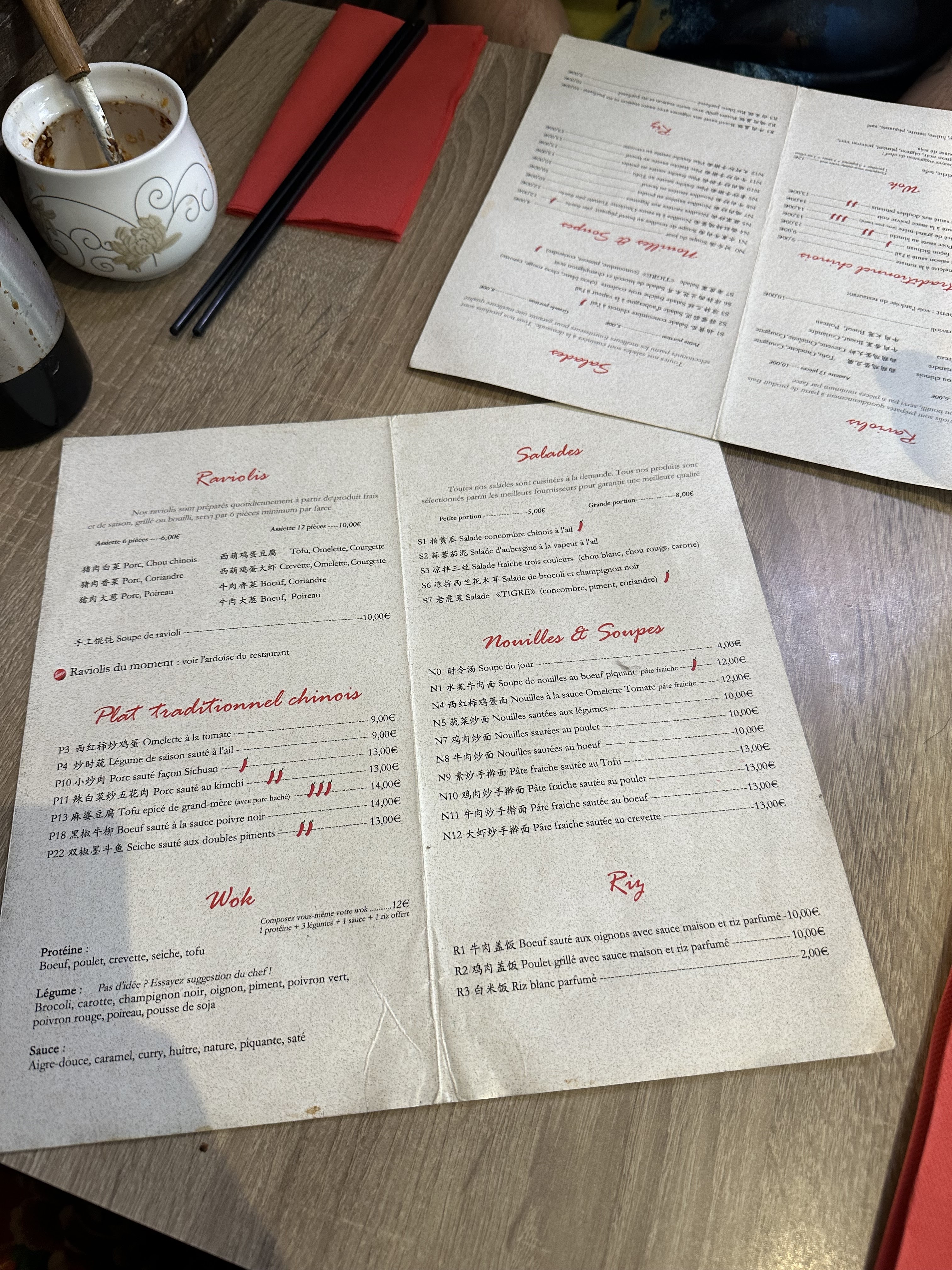 Je suis venue déjeuné il y a 2 jours, il fesait froid à l'intérieur mon amie à manger avec sa doudoune , dans le restaurant les raviolis était bon mais quelques un était froid... la soupe du jour et les nouilles au légumes délicieux! j'ai pris un thé au jasmin une vrai découverte un voyage en Asie un vrai plaisir la serveuse ma fait vite redescendre sur terre, elle ma amené l'addition 20euro rien à dire je lui donne ma carte de fidélité dans laquelle il ne restait qu'une seule case la voilà revenir me donnant ma carte, plus une deuxième carte avec un tempon dessus ne cherchant pas le pourquoi du comment nous nous levons pour partir la serveuse le dos tourné nous lui disons au revoir même pas un signe dommage, il est vrai que depuis la fermeture du restaurant pour travaux le sentiment d'un laissé allait me donne plus l'envie d'i revenir