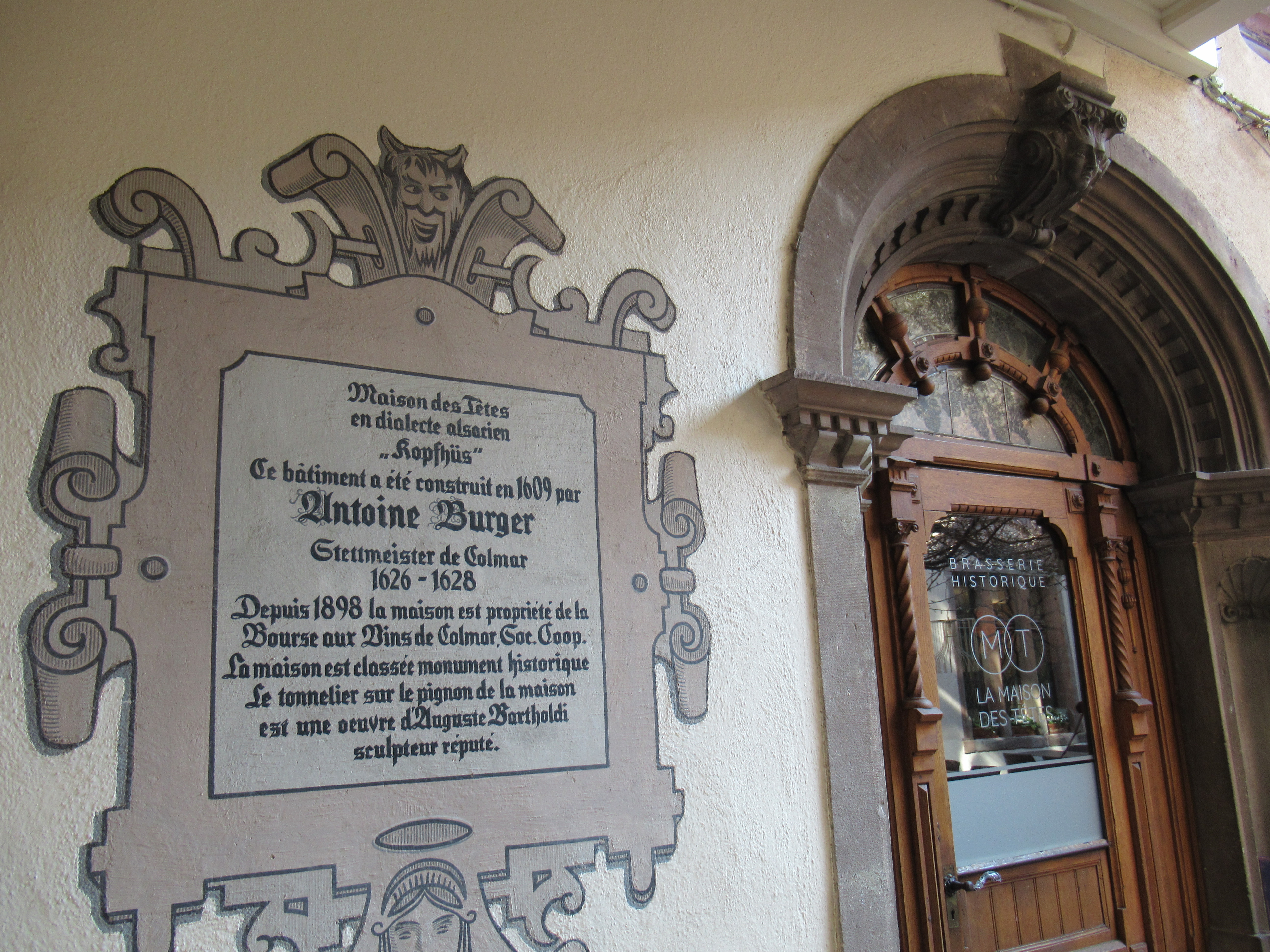 La Maison des Têtes, bel édifice de la Renaissance allemande, doit son nom aux 106 têtes ou masques grotesques qui ornent une riche façade sur laquelle s’élève un oriel de trois étages. Le pignon de l’édifice est surmonté de la statue d’un Tonnelier (1902), œuvre d’Auguste Bartholdi (créateur de la statue de la liberté) qui répondait à une commande de la Bourse aux vins qui s’était installée dans l’immeuble en 1898.