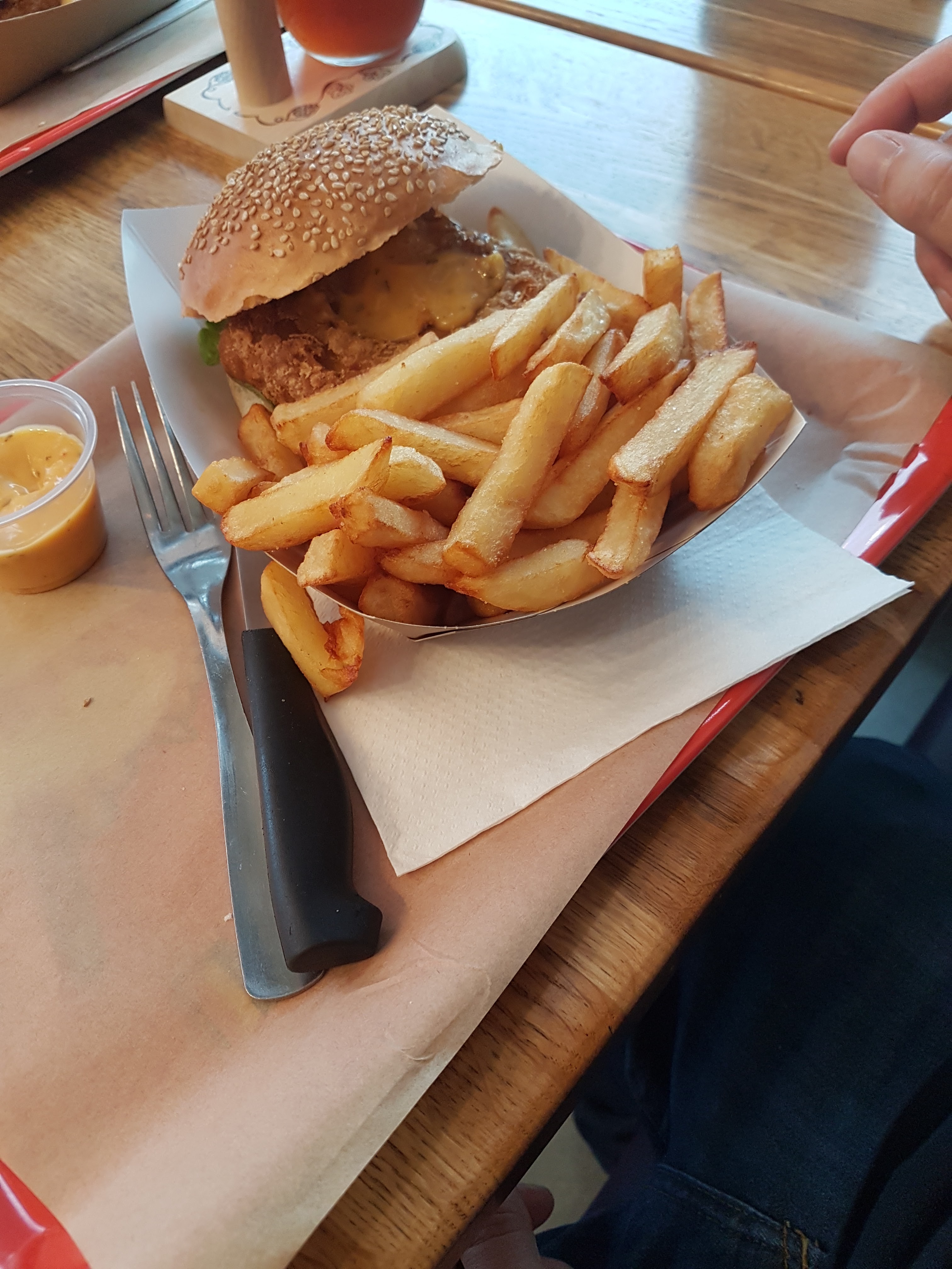 Très bon , dommage que l'hamburger du jour (poulet pané) ne soit pas cuit à coeur donc immangeable . Prix excessif une fois pas deux
