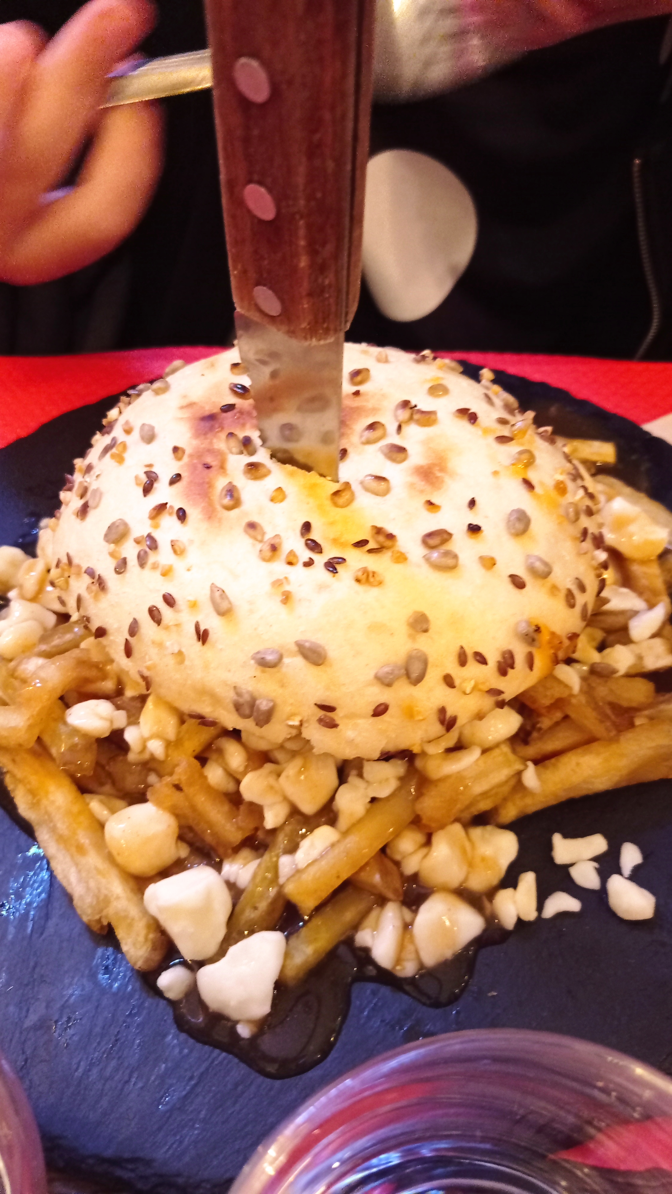 Très bon burger poutine. Un régal ! Bu avec une grande bière au sirop d'érable. Ça m'a rappelé mes vacances au Québec.