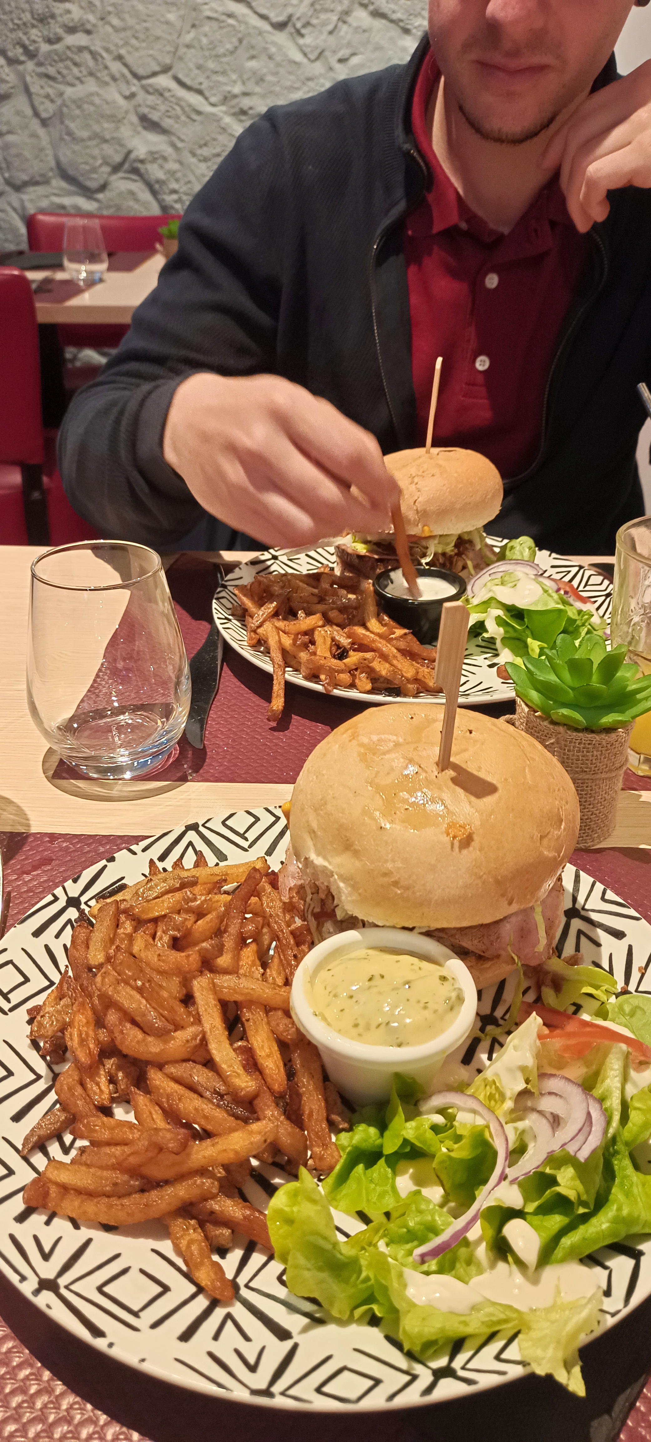 Burger délicieux avec ses frites maison on c'est régalé,je recommande a 100% . Je met un bémol sur le menu enfant, le poulet pané n'a pas été apprécié et le choix d'une boisson pour les enfants serait appréciable merci pour ce bon repas.🍔🍟