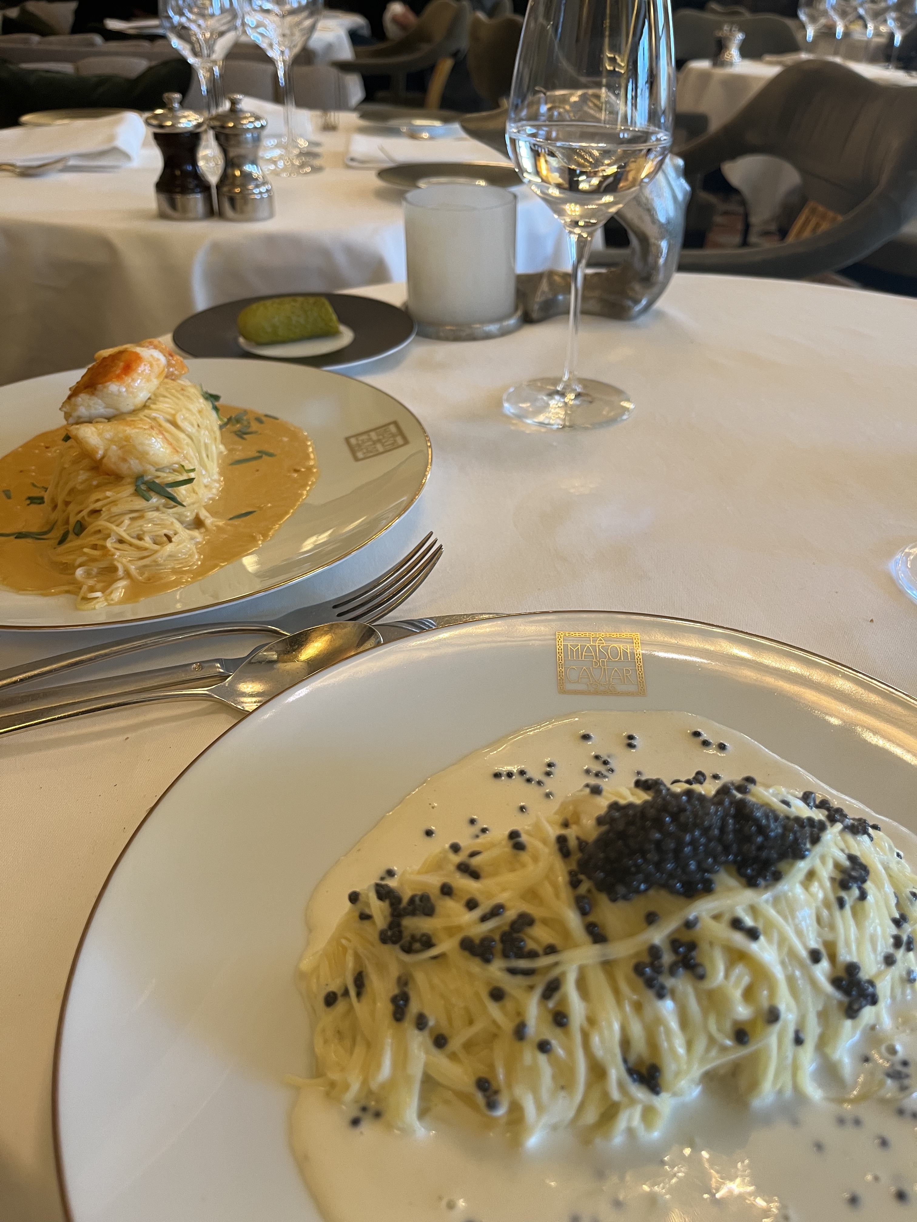 Spaghettis et pomme de terre au caviar un peu amer tout de même...Serveur familier avec certains clients. Ambiance musicale variétés françaises ; il faut apprécier Claude François et sontéléphone qui pleure...à près de 400 euros le déjeuner à deux, on aimerait entendre autre chose. Le jour de notre venue, trois tables occupées. Ambiance fin de règne...