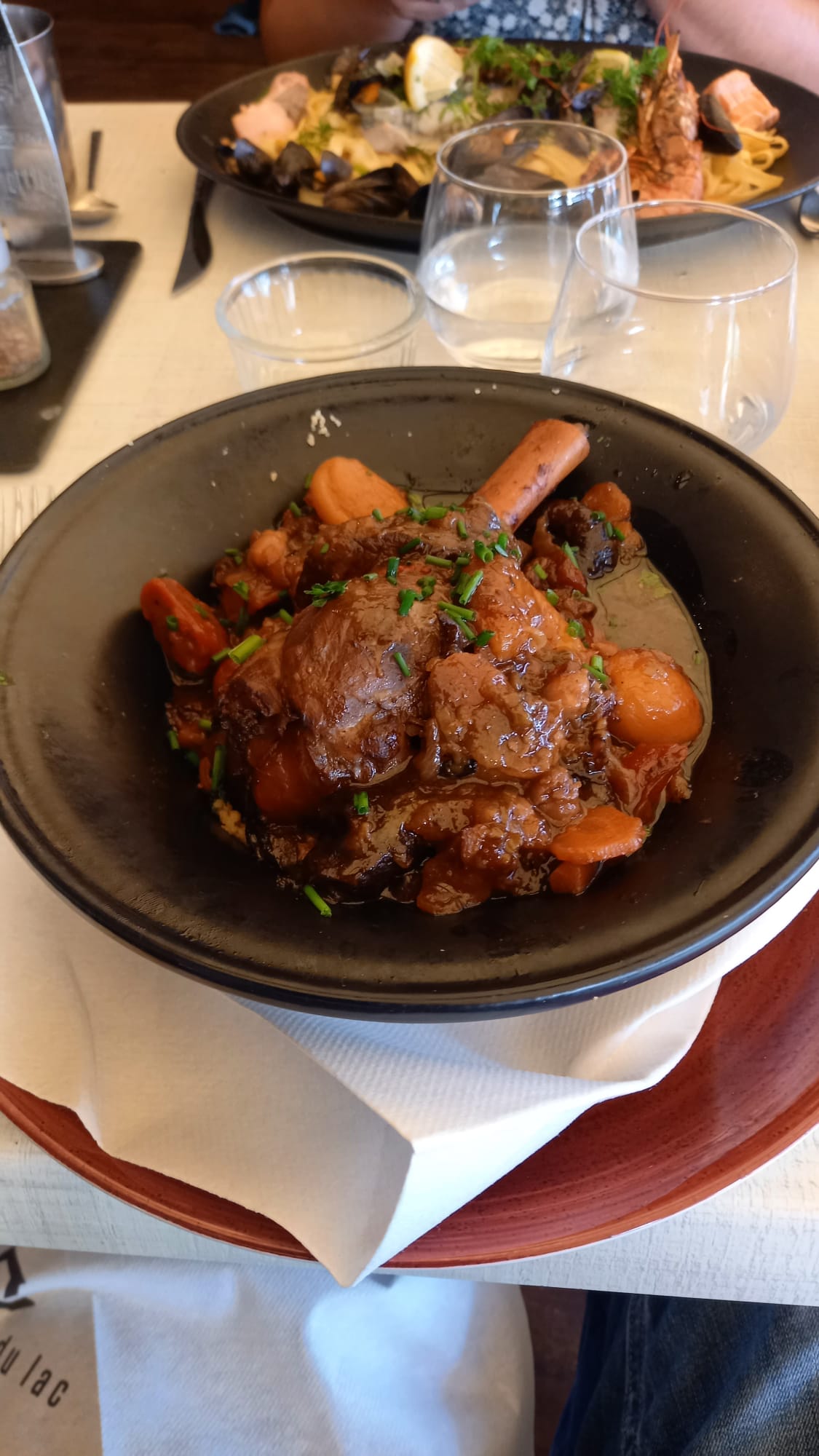Honnêtement beaucoup d'attente. Avant et pendant le repas. Je dirais même à un moment on a du être oublié des clients qui arrivés après nous étaient servis avant nous. On m'a amené l'entrée et pas le mise en bouche prévu dans le menu. Il a fallu que je le demande. Attente. Ensuite plat à peine tiède (normal assiette froide) avec décors minis tomates qui sortaient du frigo. Déçue Dommage les plats étaient bien mis en valeur. Je pardonne l'attente, s'il y a du monde à l'heure où nous sommes arrivés se n'était pas le cas. Mais manger froid non. Petit tour du lac agréable.