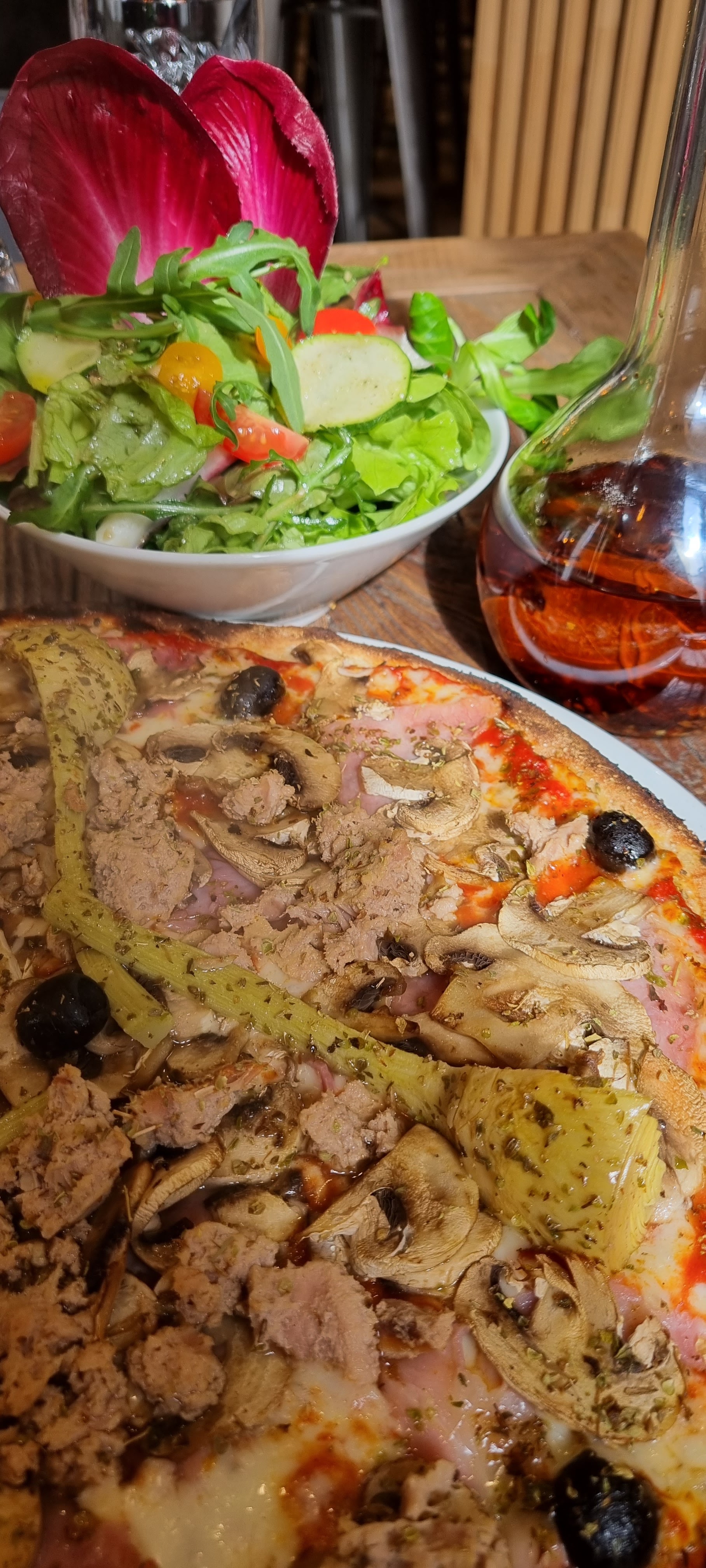Ambiance sympa,😀 bon accueil la pizza est bonne mais trop grande pour une personne. Une pizza plus petite avec une salade pourrait être proposé pour les petits estomacs 😉