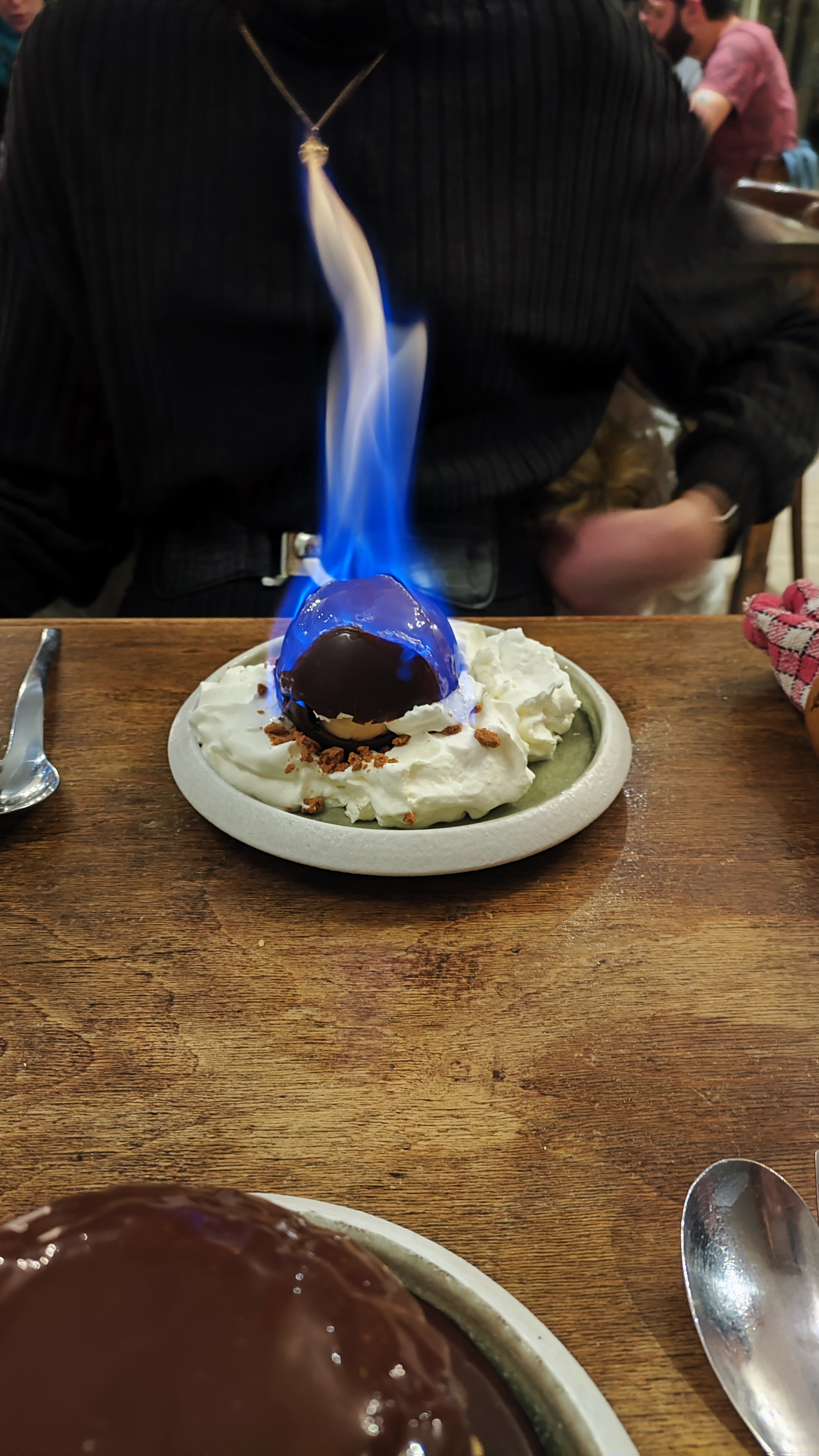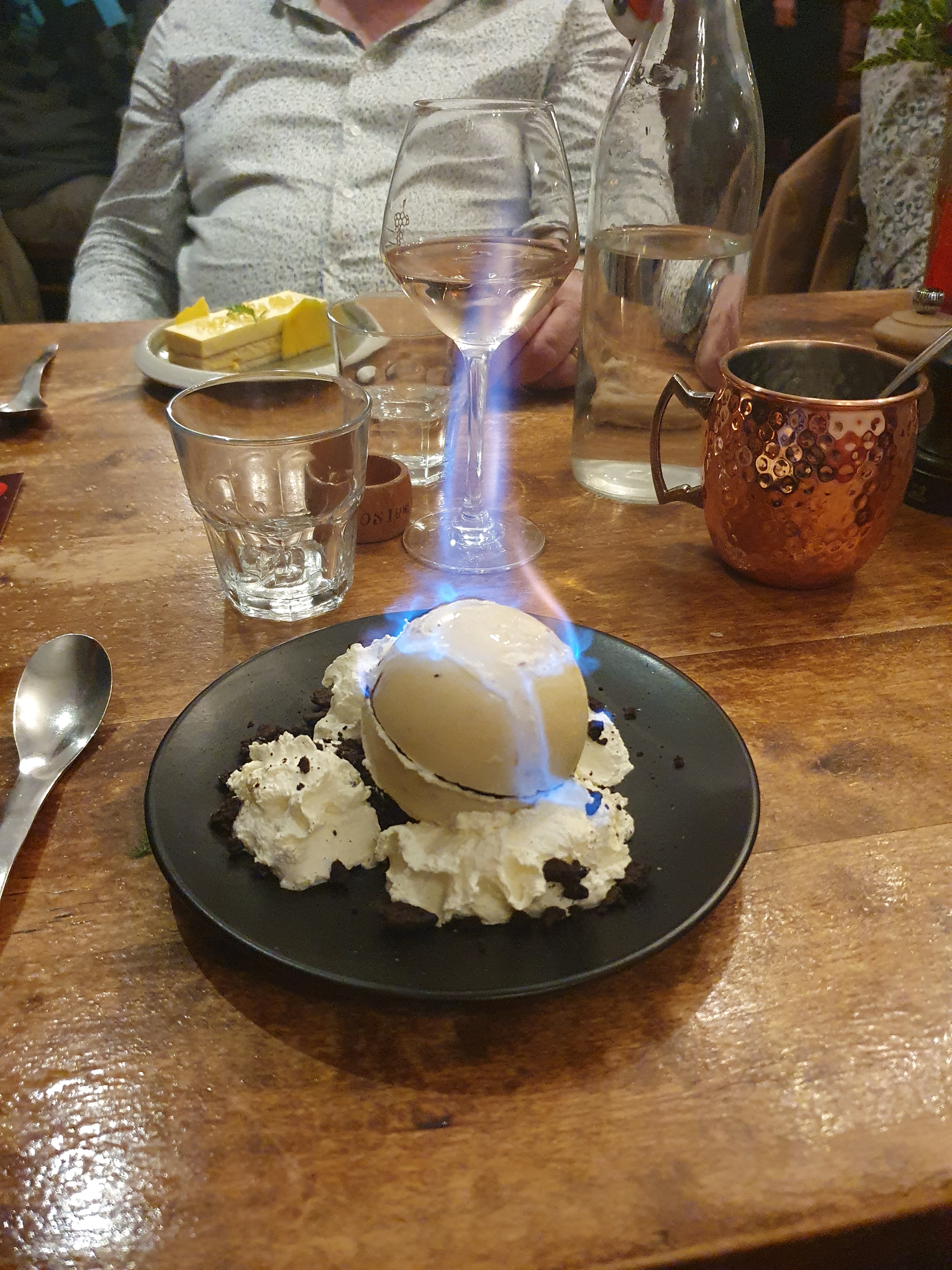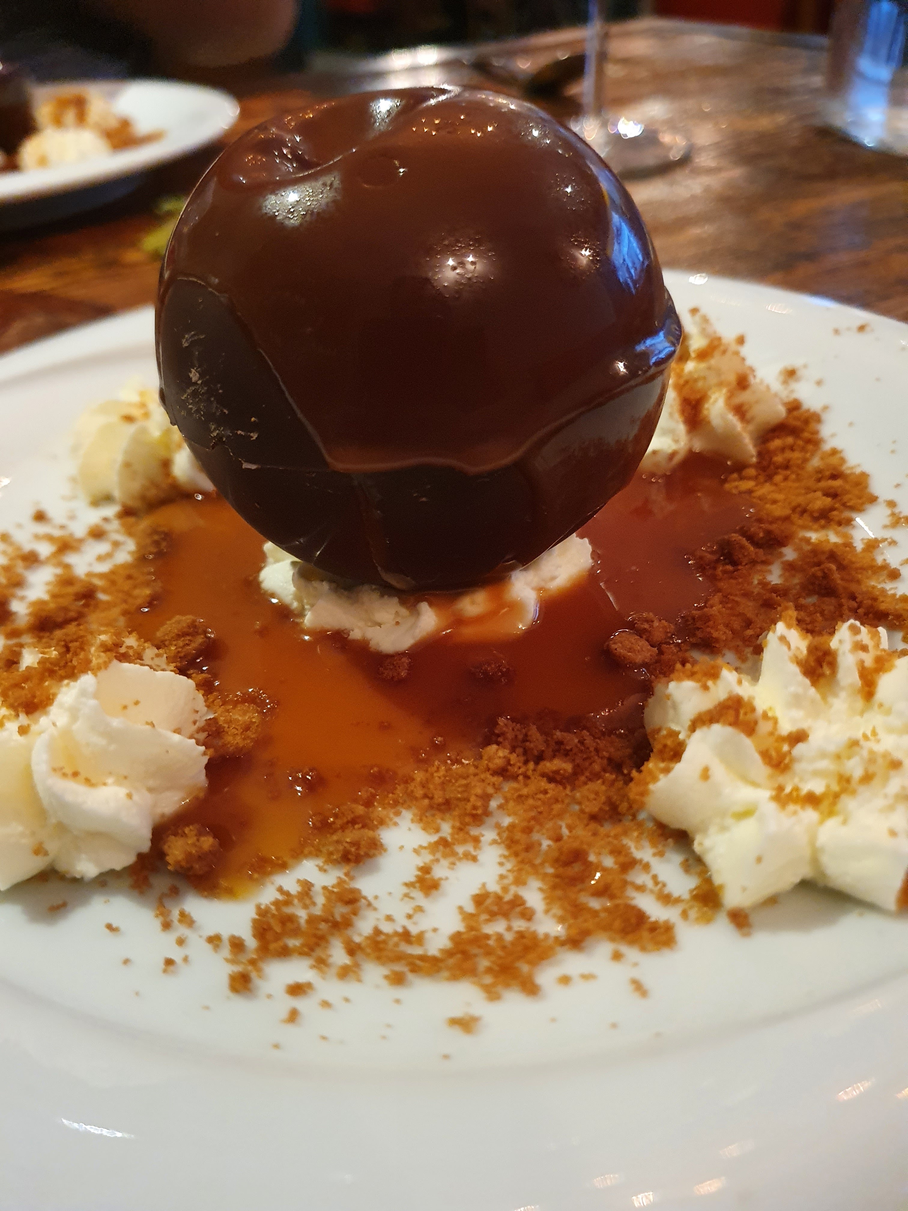 Bonne table et service professionnel. Le dessert... Une sphère chocolat fondue de son caramel beurre salé servi chaud par le serveur, un vrai délice.