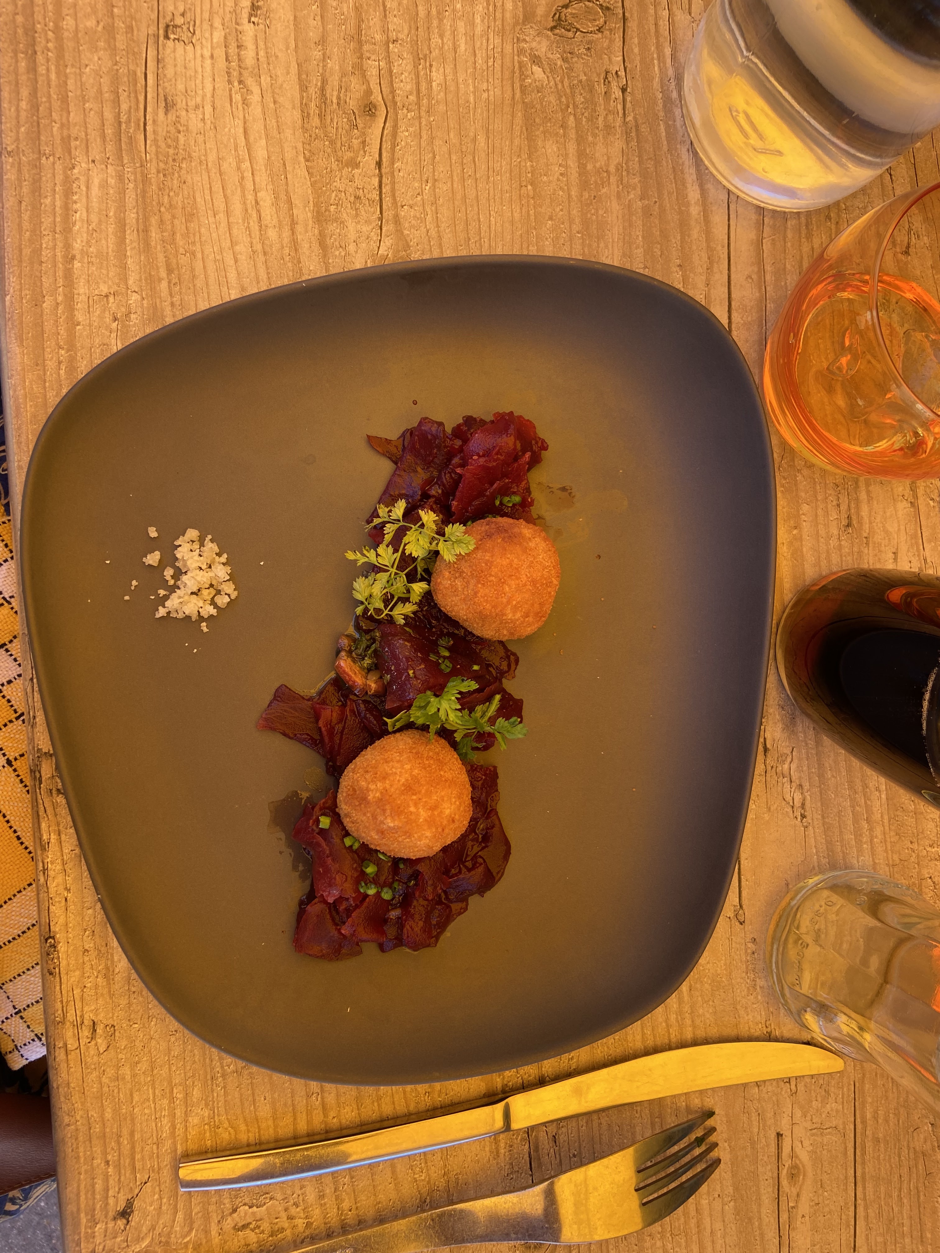 Plat du jour plus que moyen.apero servi avec l entrée..viande demandée saignante arrivée plus qu à point..rizzoto sec harchi sec..bref passons pas terrible du tout. ⅜⅖