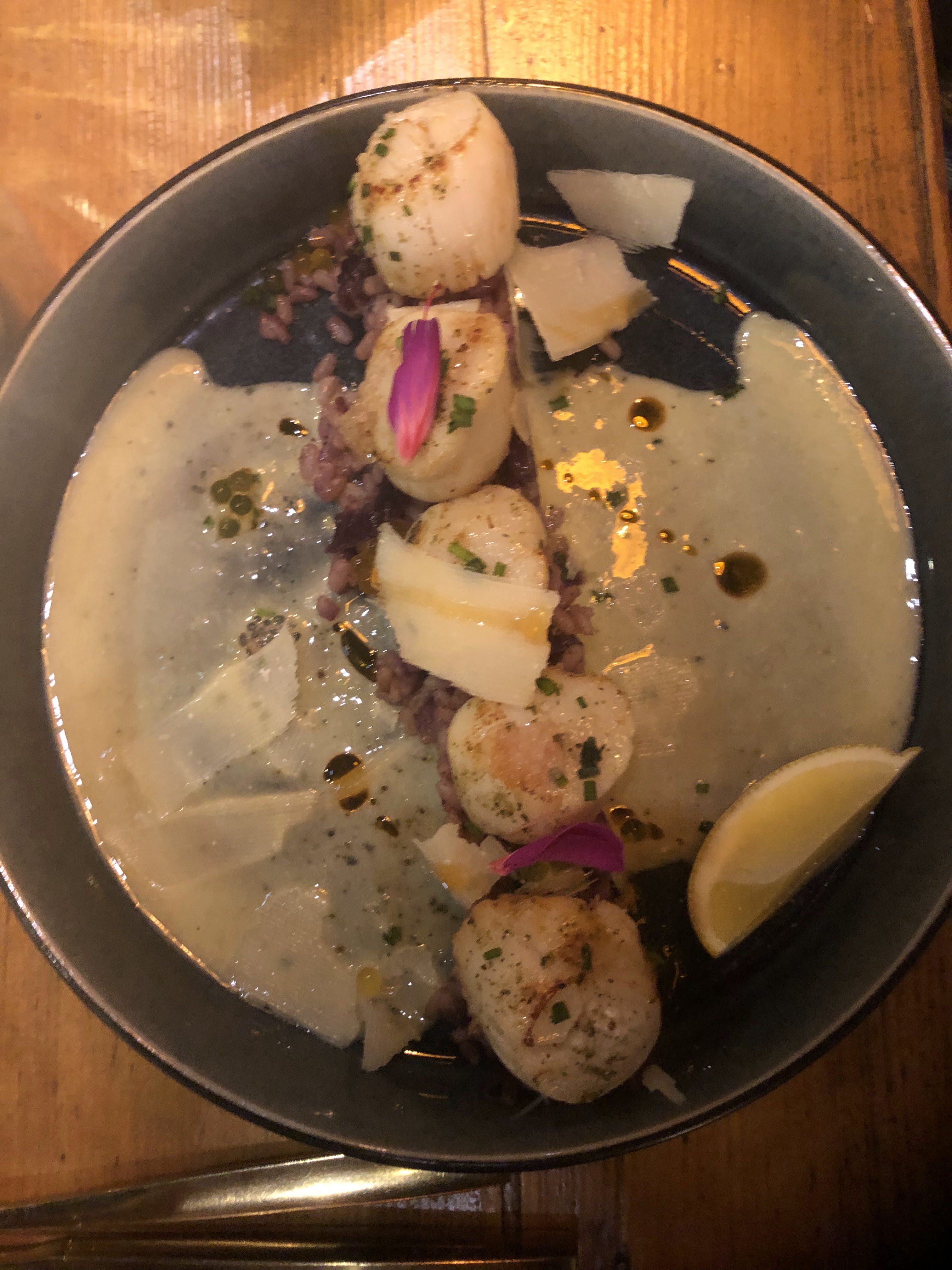 Un peu déçue ;entrée tacos aux poissons fumés et avocat un peu trop crémeux puis risotto de betterave rouge et noix de st Jacques vraiment trop salé... Je m'attendais à mieux