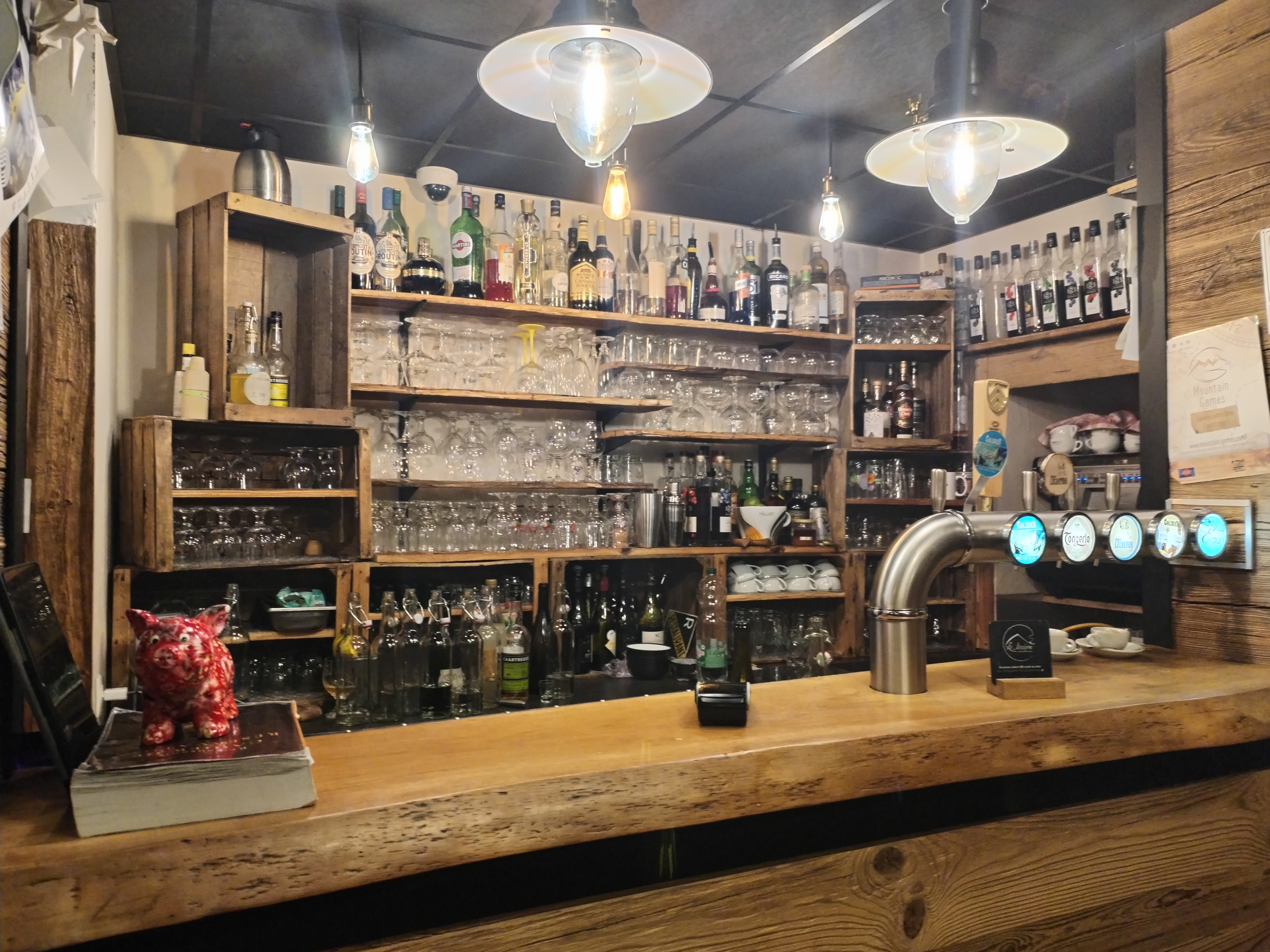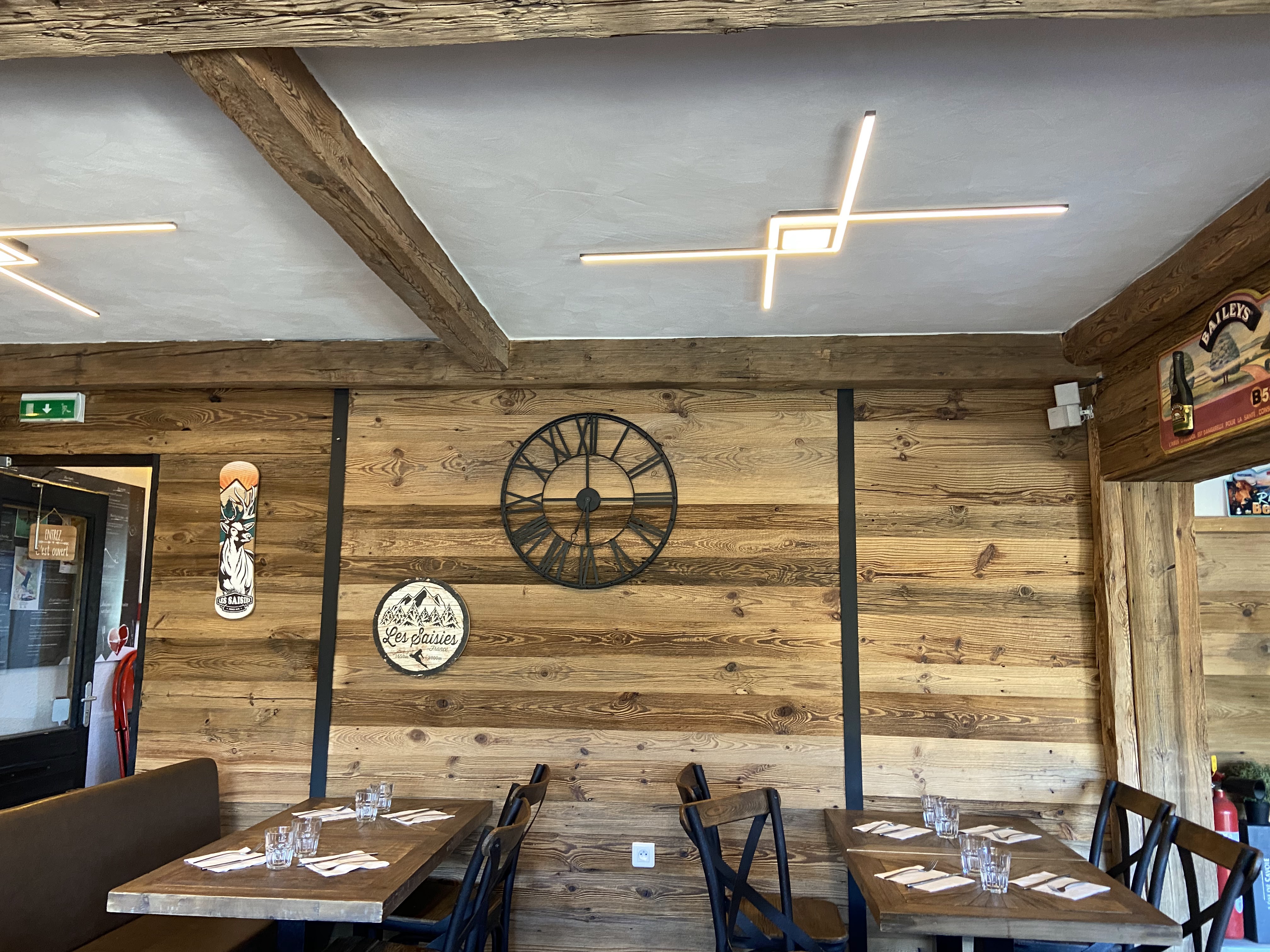 excellent restaurant avec une cuisine très unique et une atmosphère chaleureuse et une décoration locale le menu change régulièrement en fonction de l'humeur et de l'inspiration du moment Le restaurant possède une mijoteuse canadienne en bois où ils préparent du porc effiloché, du saumon et d'autres plats étonnants. il y a aussi des classiques forts comme le burger de montagne au roblochon ou une salade de toasts géants au chèvre ils ont également un menu pour enfants pour 10 euros qui peut être adapté à vos besoins. la vue sur la montagne de bisanne est également très sympa comme vous pouvez le voir sur les photos ils ont une grande sélection de bières triées sur le volet et une touche unique aux cocktails classiques Ne manquez pas cet endroit si vous venez aux saisies ! ils servent également non-stop du déjeuner au dîner, ce qui est rare en France ! apprécier !