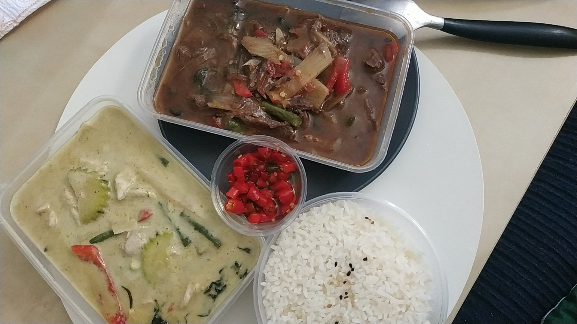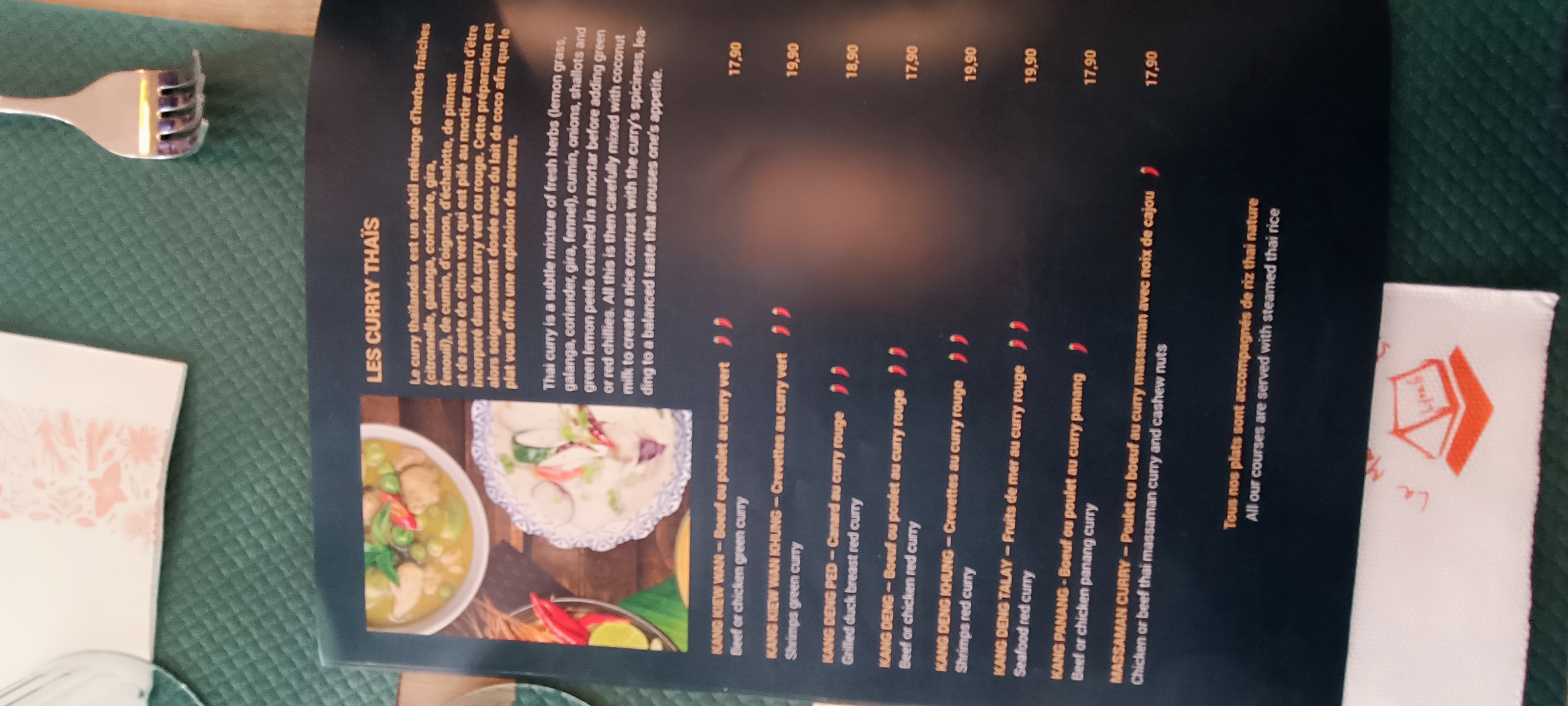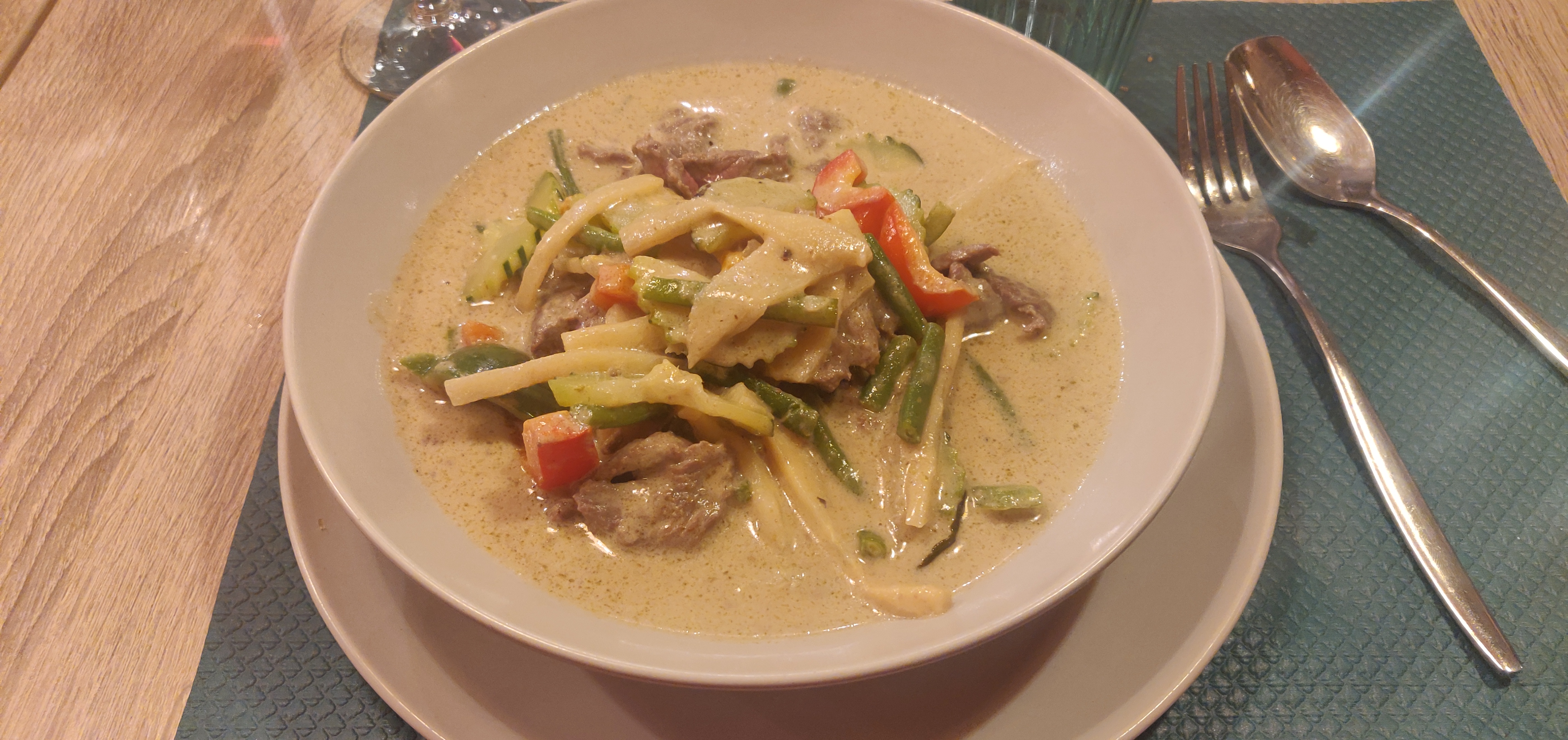 Enfin des plats avec des saveurs... le boeuf au curry vert avec riz thaï nature 😋 Un délice ! Je recommande sans problème. Merci pour l'accueil 👌