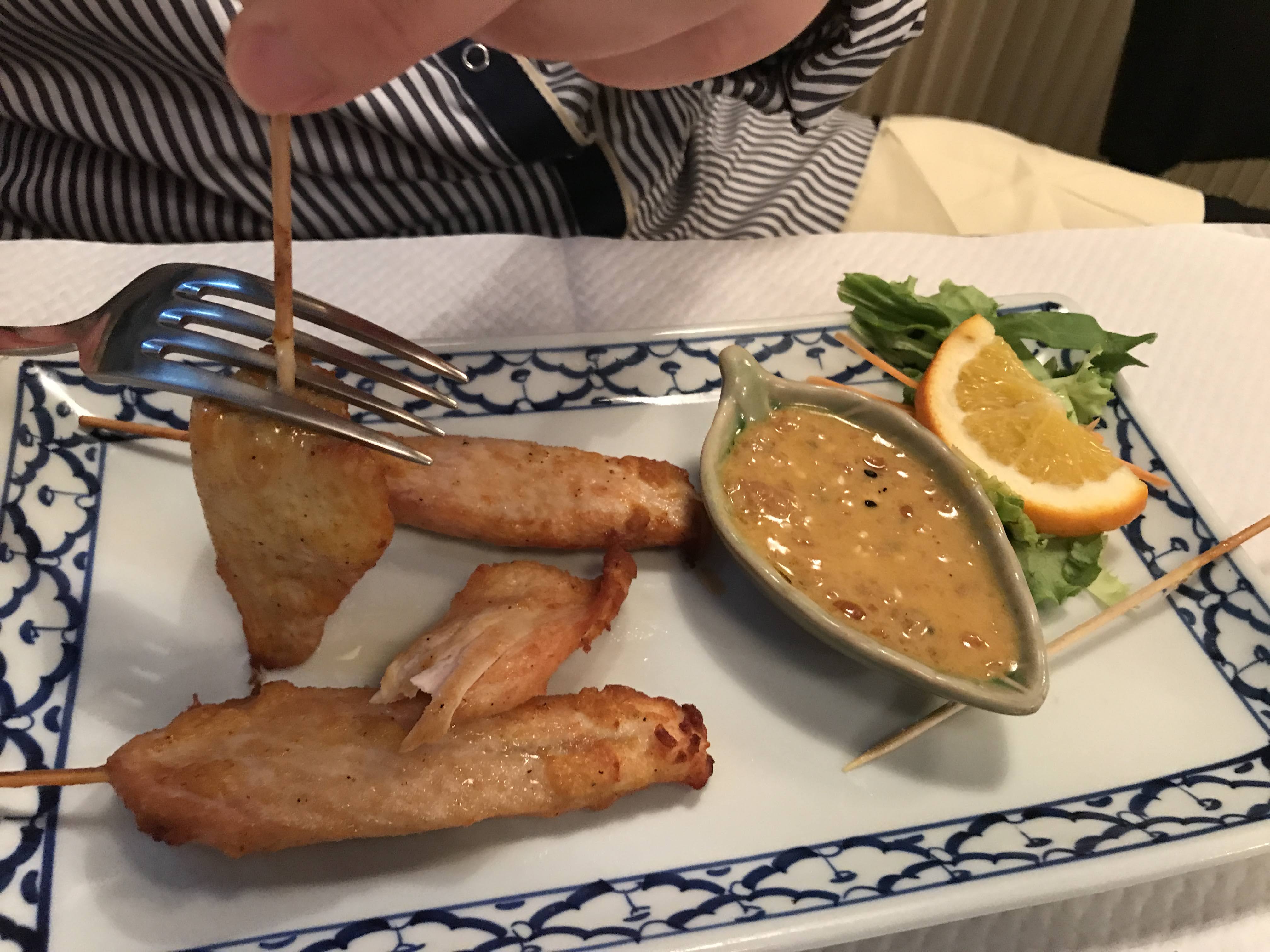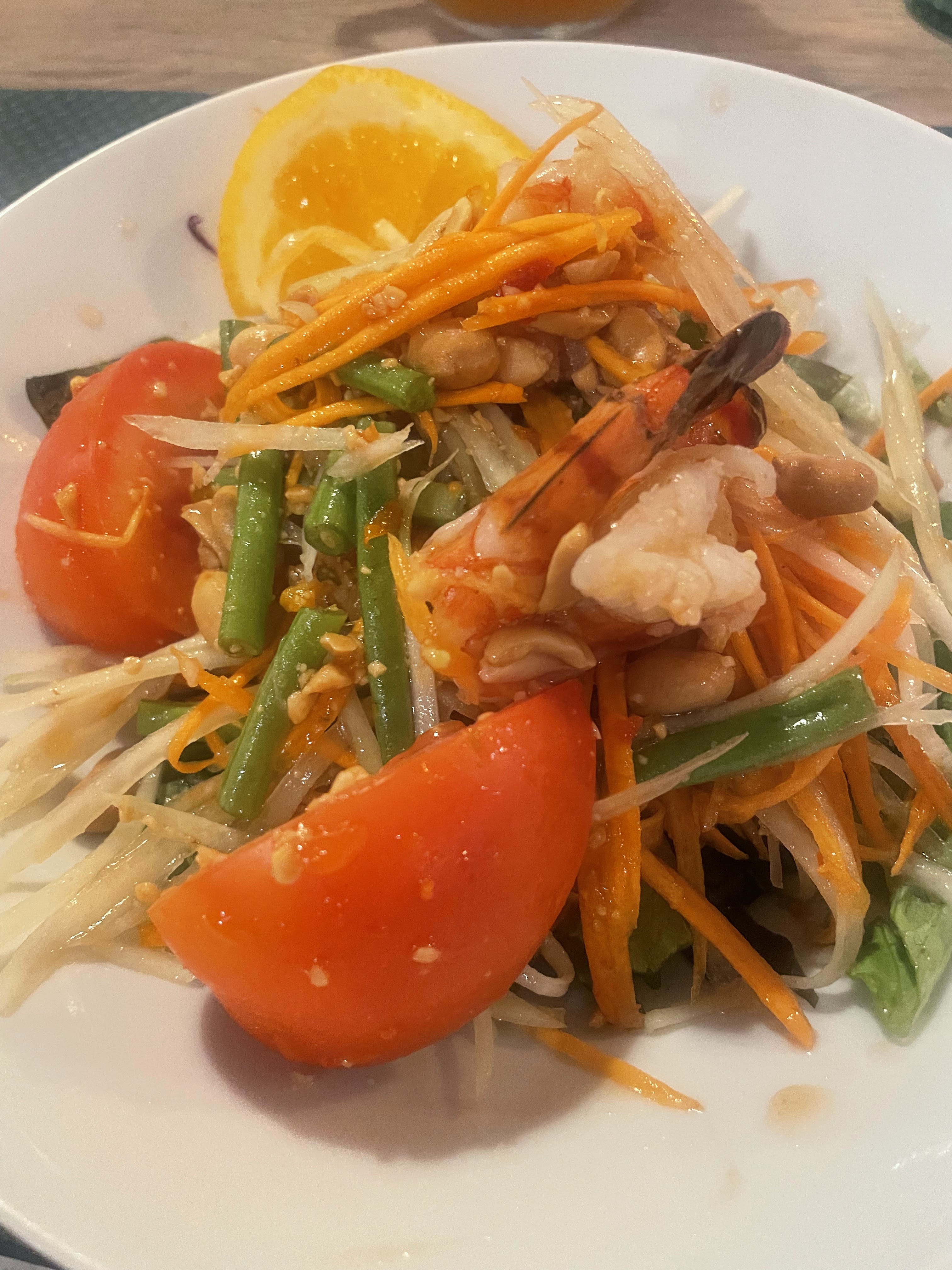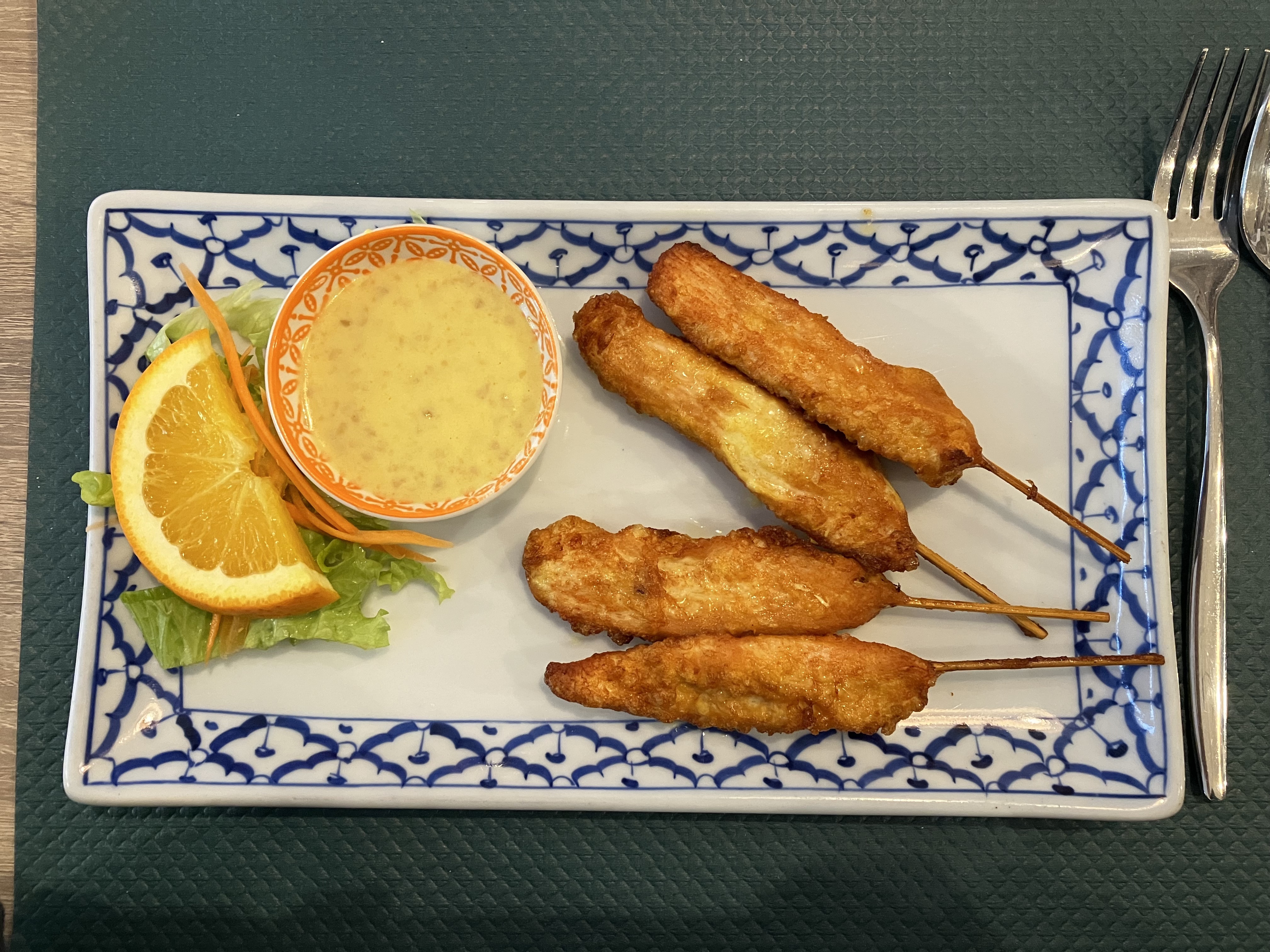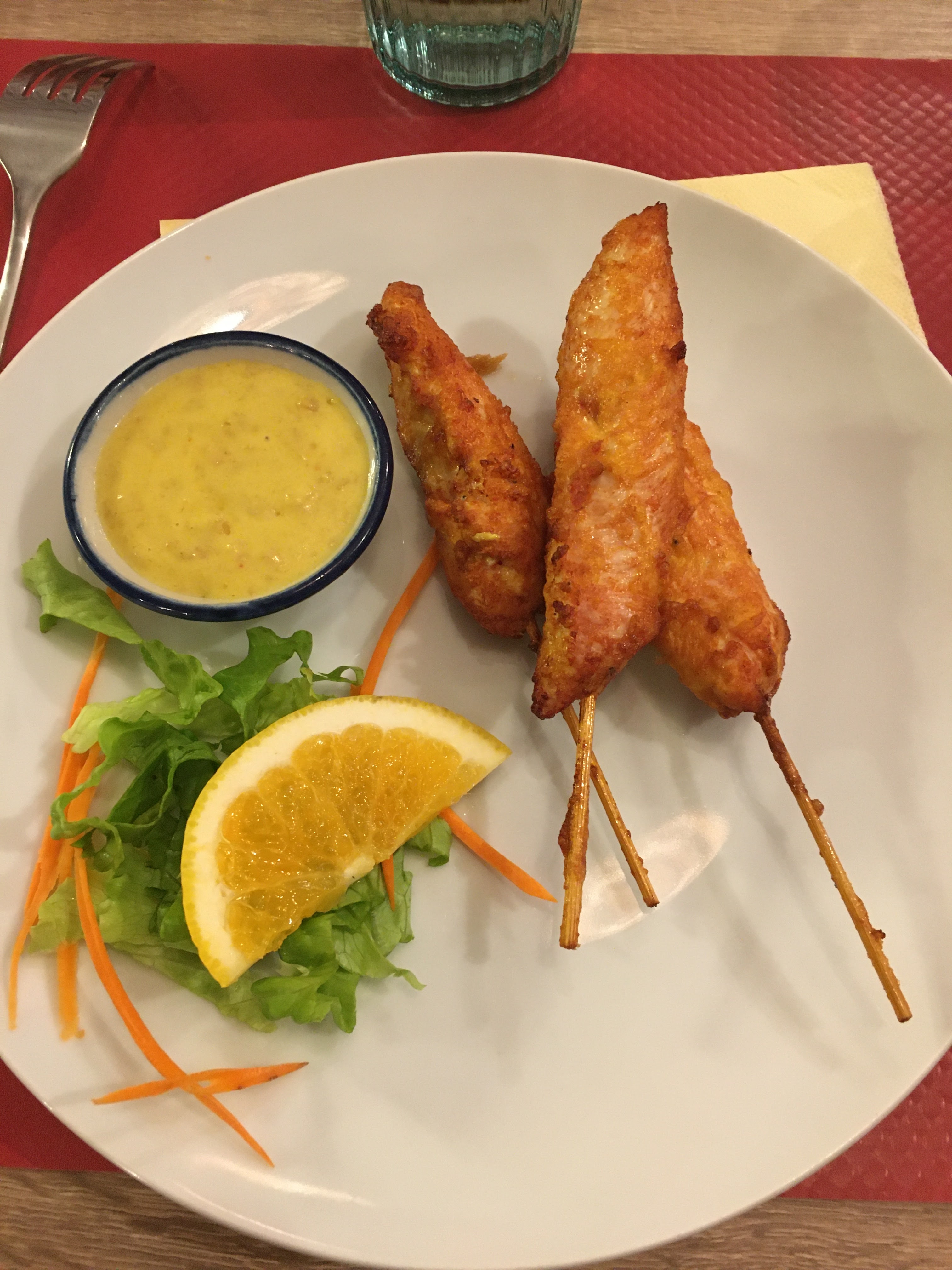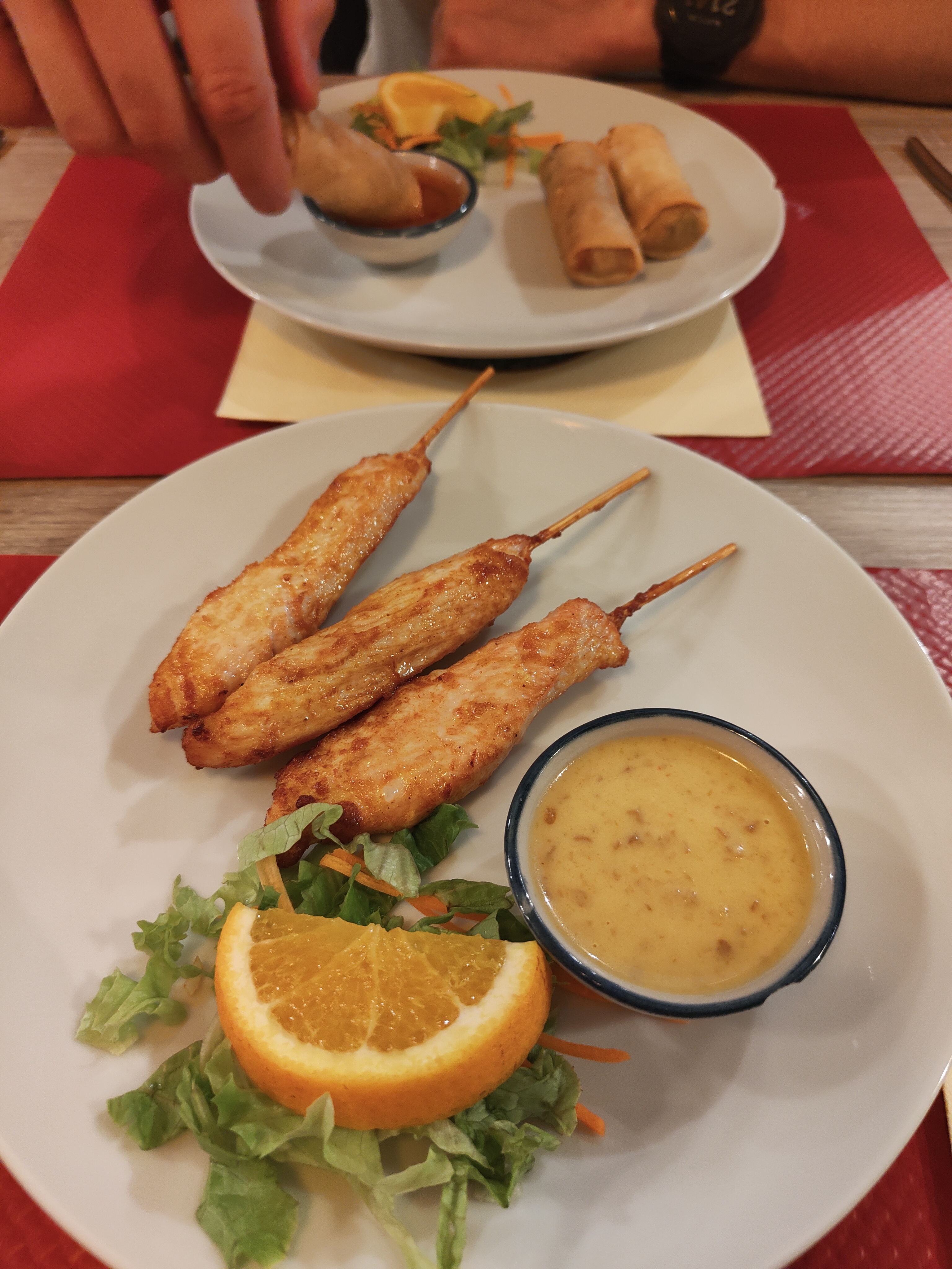 Brochette poulet marinée et salade de papaye très bonnes . Un peu déçu des pâtes thaï manque de pousse de soja et absence de ciboulette et citron.
