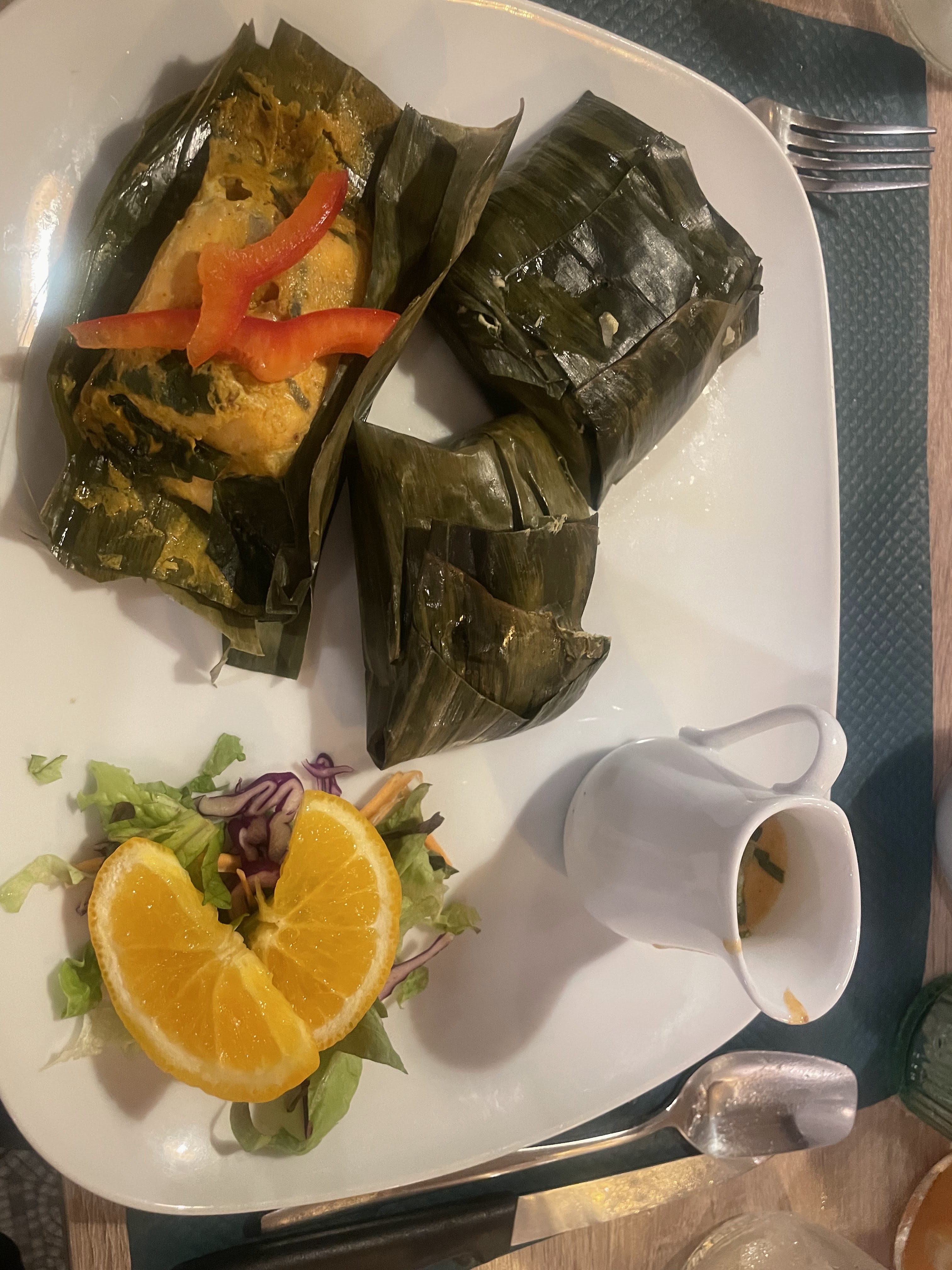 Très bon restaurant. On a très bien mangé. Nourriture thaïlandaise variée et de qualité Personnel sympa J’ai pris 2 entrées: Pla Khung et Som Tam Très bon surtout la salade de papaye Ensuite en plat principal: Ho mok pla Saumon en papillote cuit à la vapeur dans une feuille de bananier au curry rouge et aux herbes thaïes En dessert le flan thaï