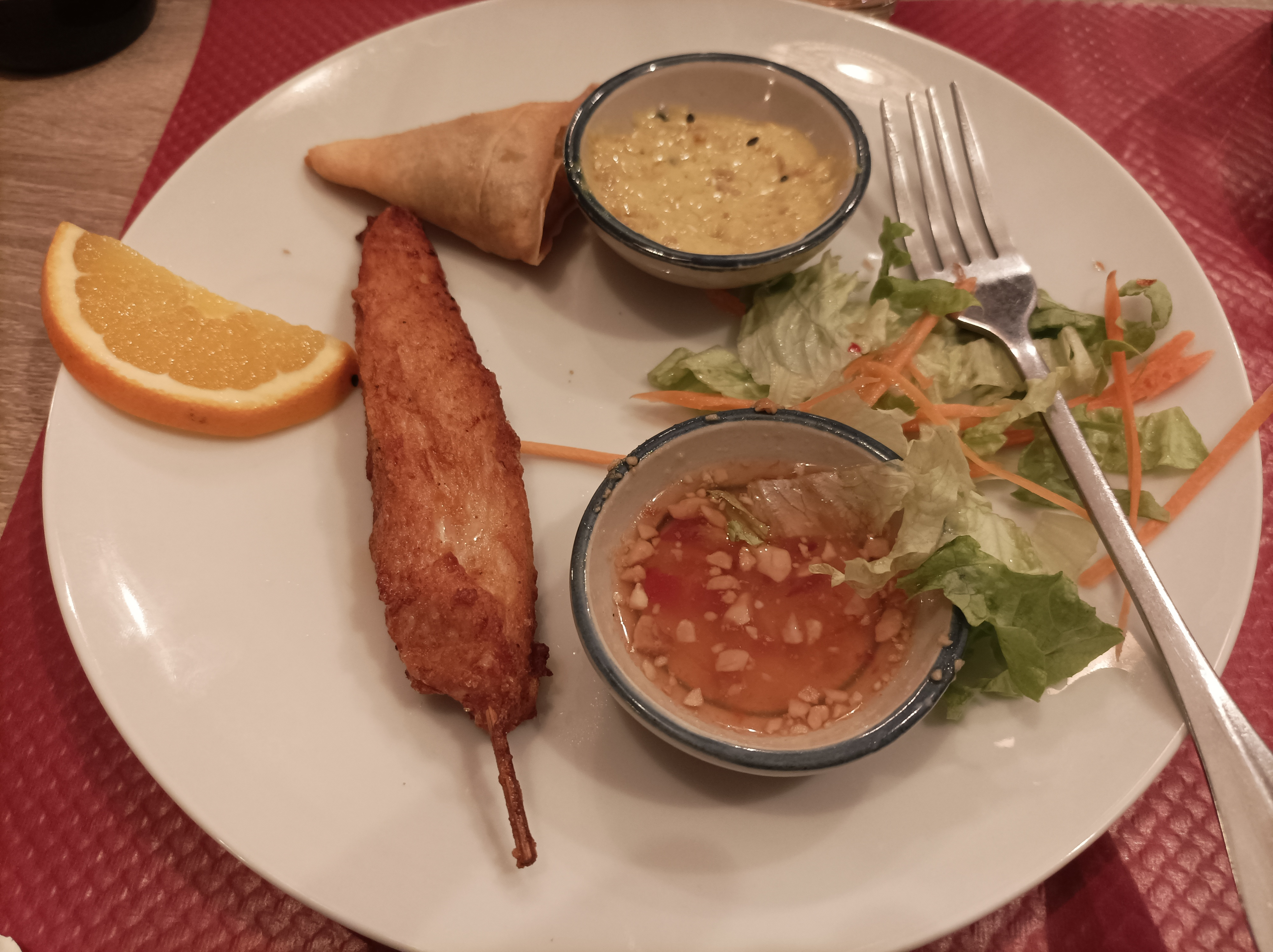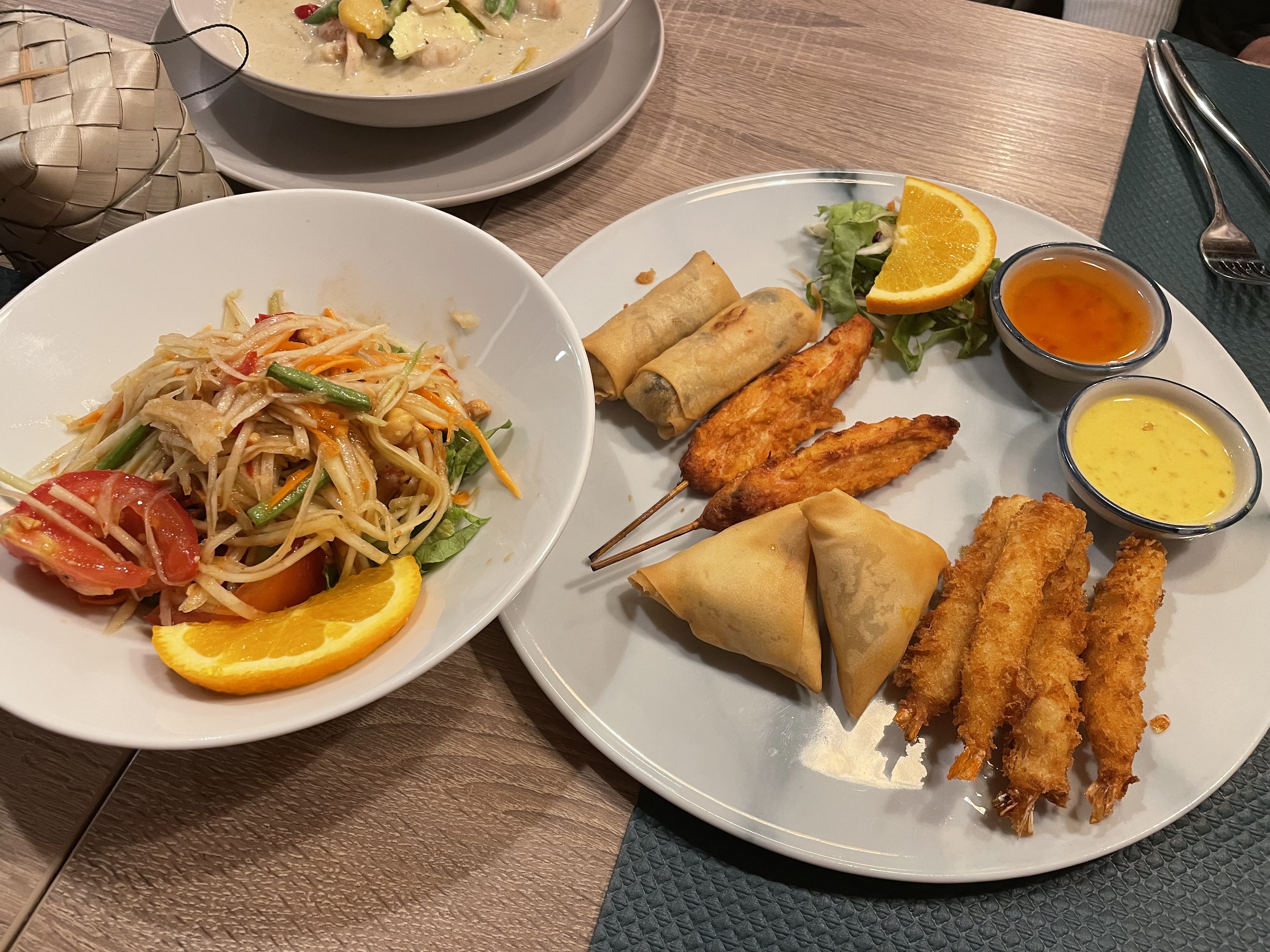un assortiment en entrée avec l'apéro, un plat bien thaï comme il faut pour un prix contenu. l'accueil mériterait d'être un peu plus chaleureux. une bonne adresse pour vous faire une soirée thaïlandaise.