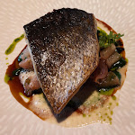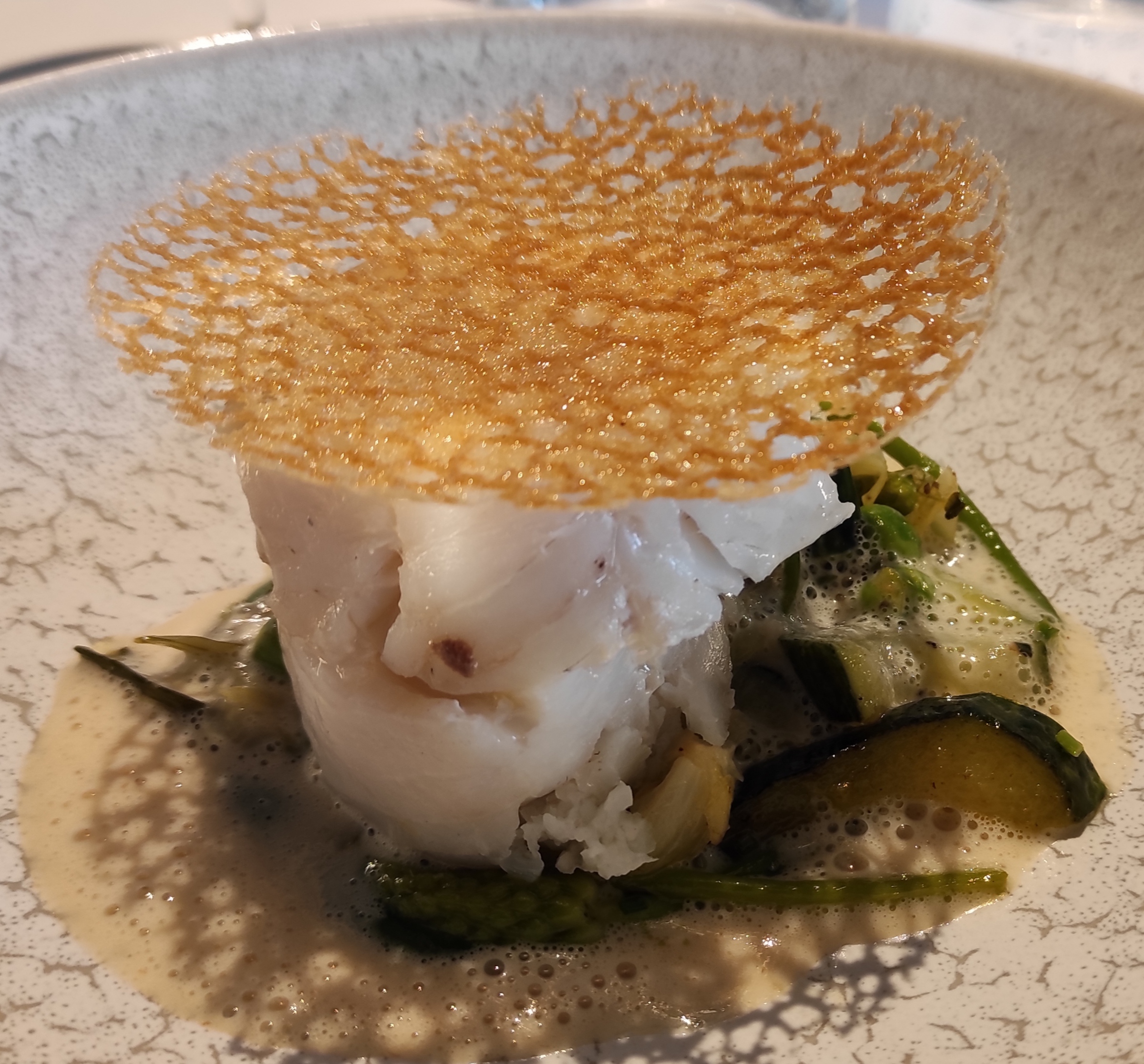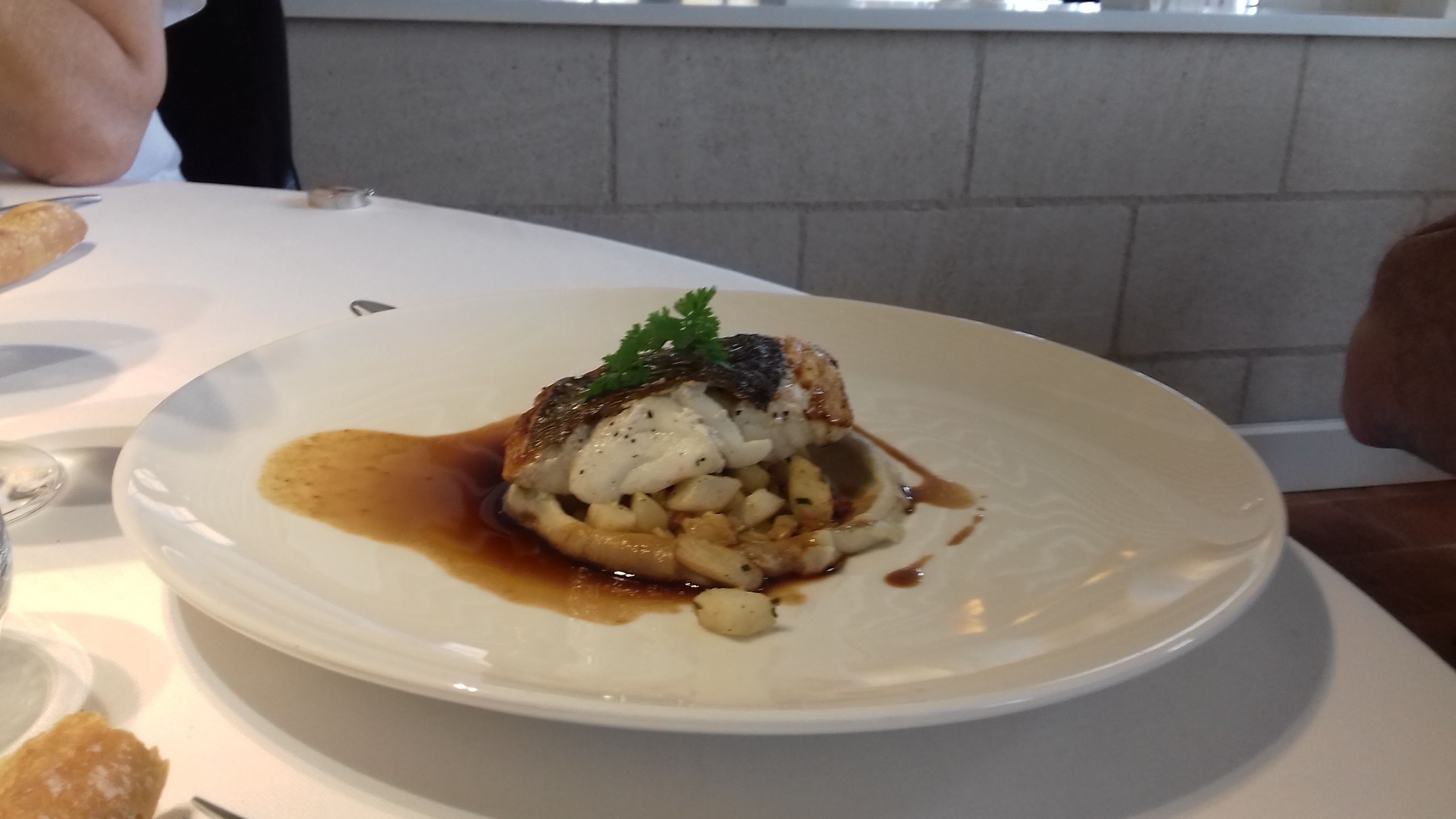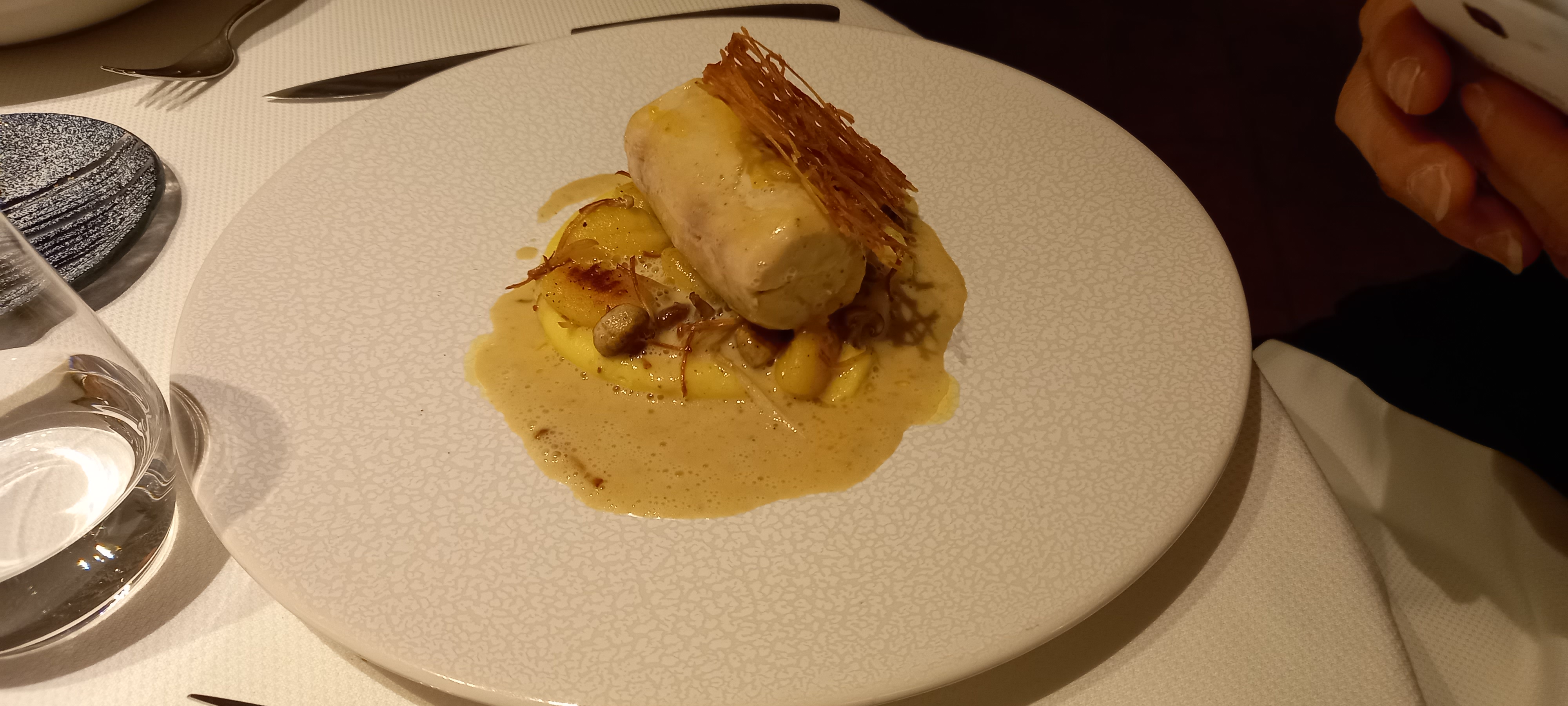 Très bon, très frais. Une recherche en saveur du début à la fin. A titre personnel, et humblement, je pense que la liaison foie gras-fruits rouges avec fraise et groseille a ses limites, la saveur du fruit rouge acide comme la groseille et certaines fraises se mêle mal au foie gras , qui était à lui seul très bon.