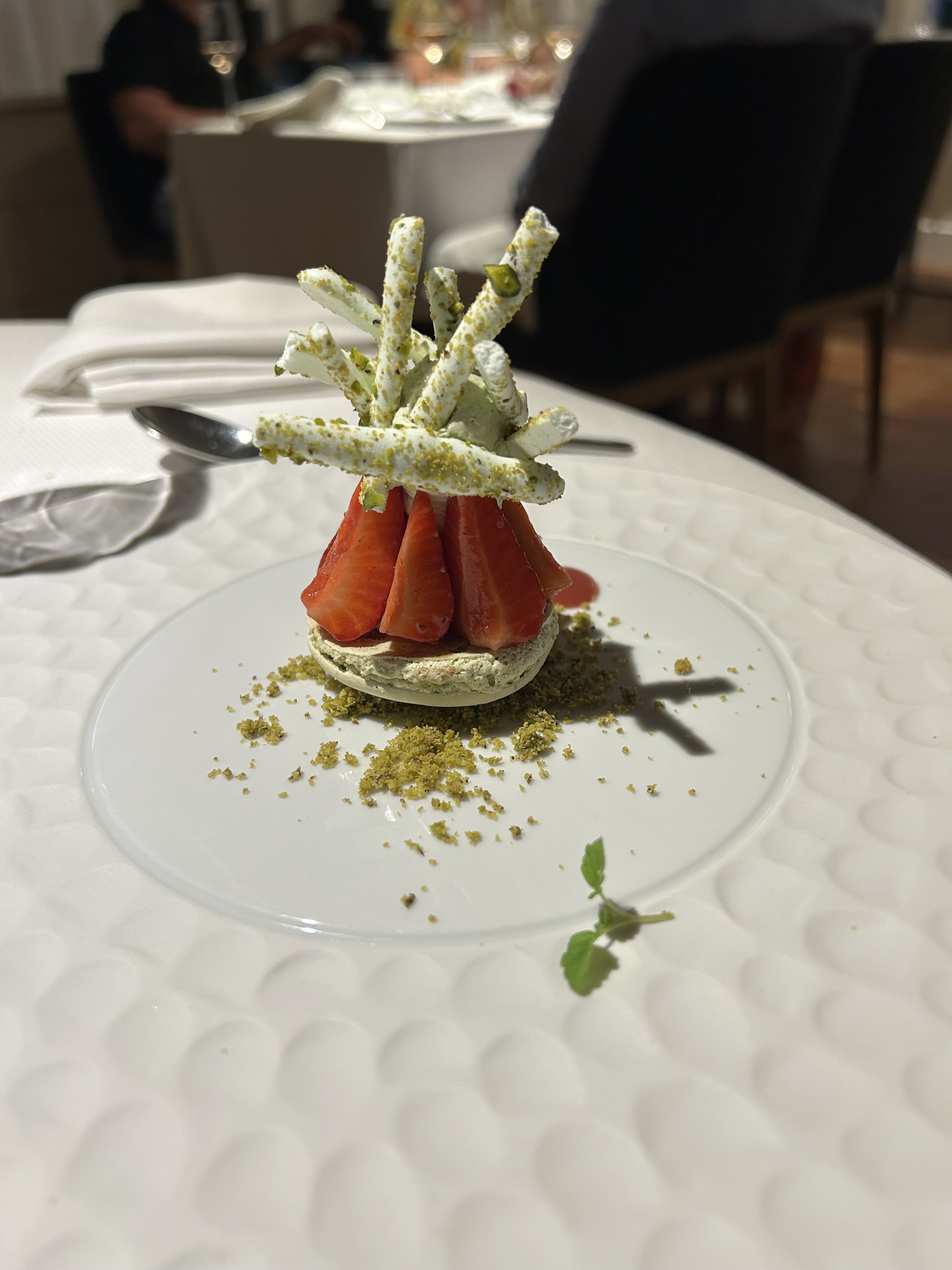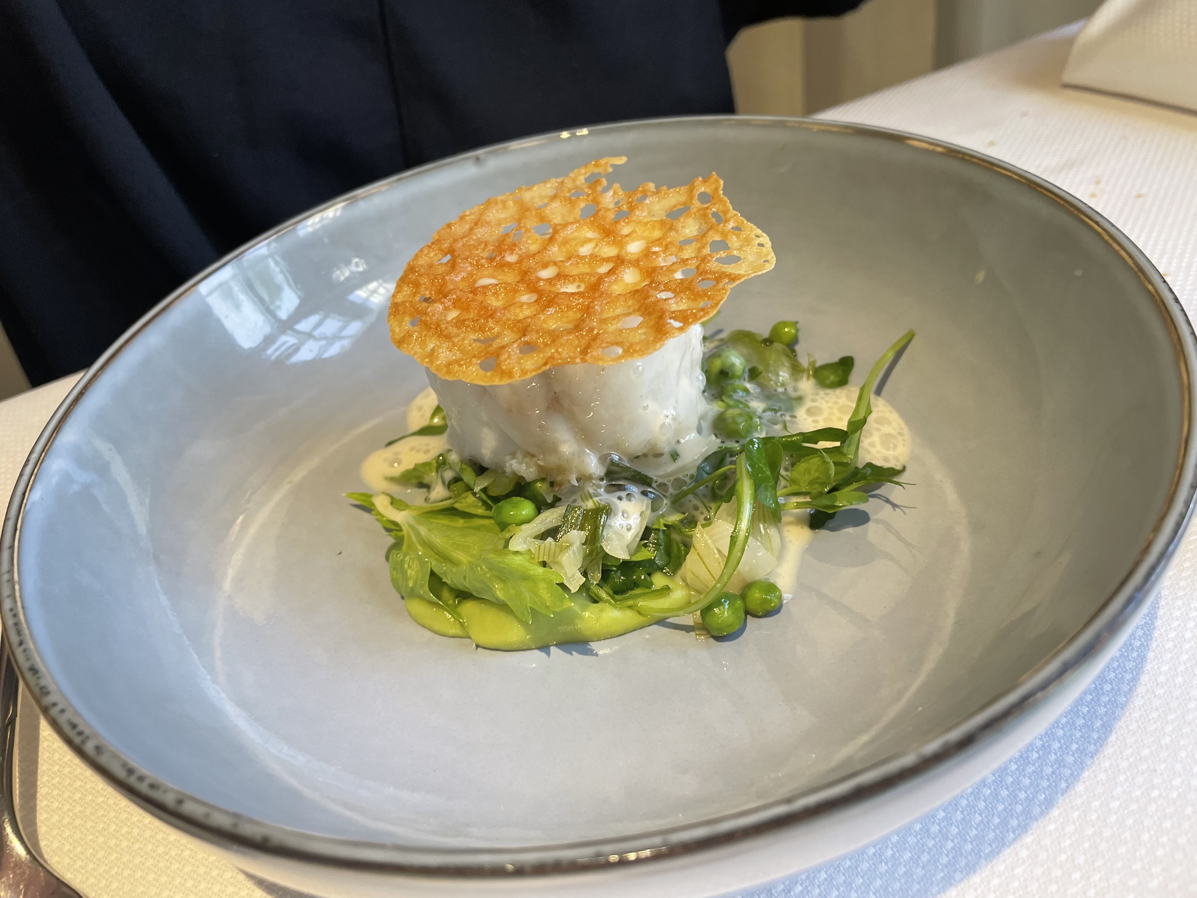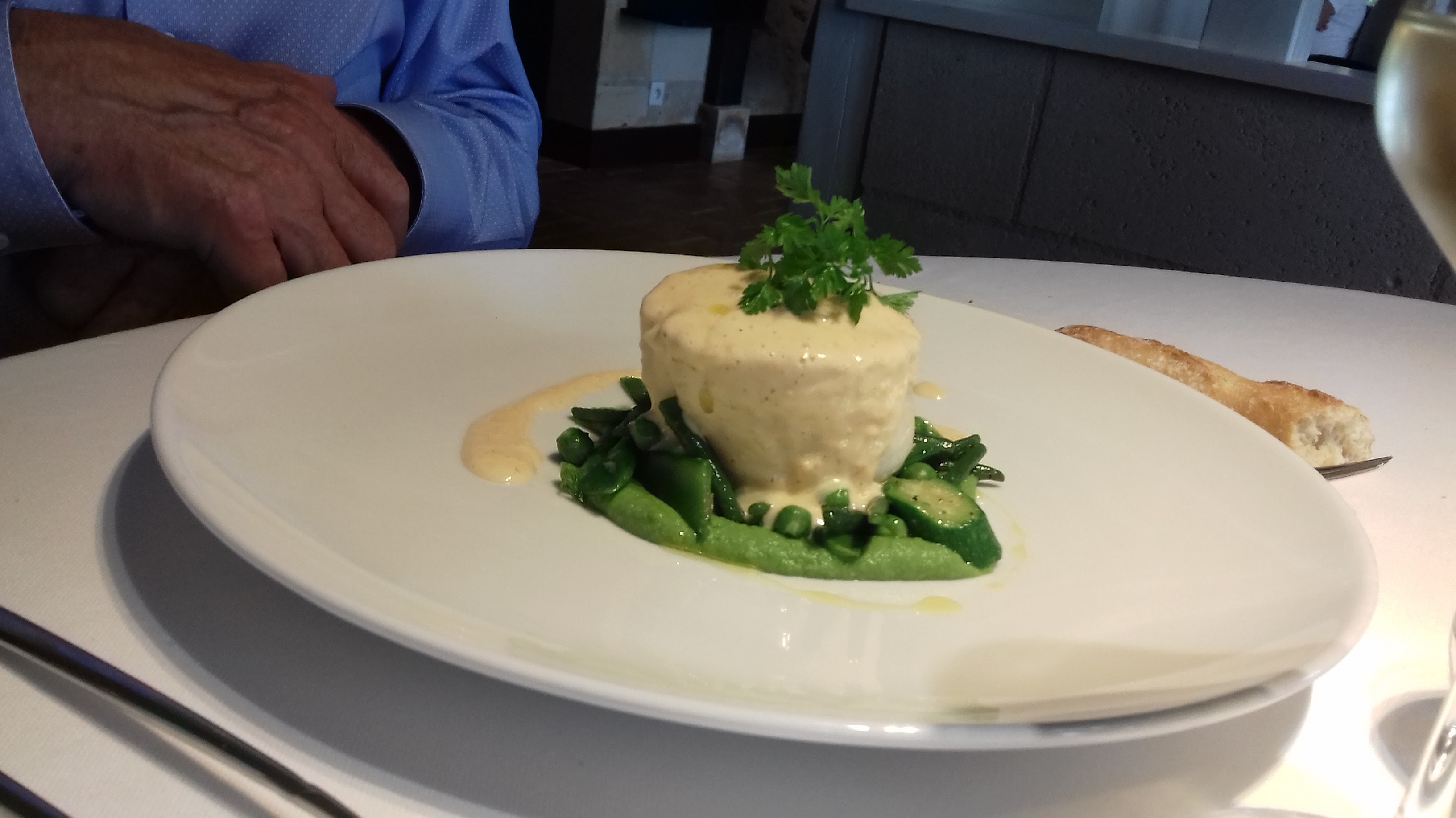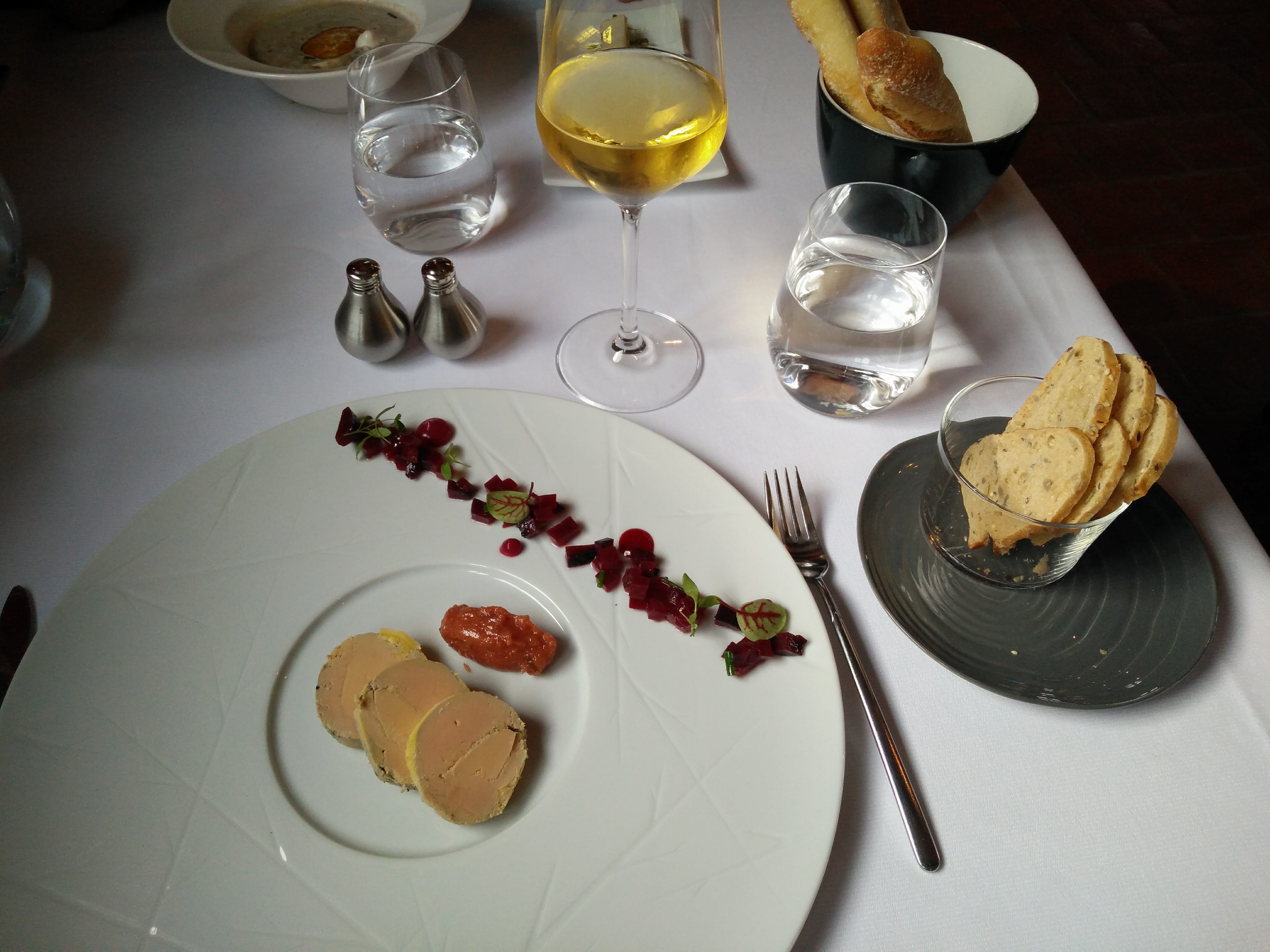 Très bon, très frais. Une recherche en saveur du début à la fin. A titre personnel, et humblement, je pense que la liaison foie gras-fruits rouges avec fraise et groseille a ses limites, la saveur du fruit rouge acide comme la groseille et certaines fraises se mêle mal au foie gras , qui était à lui seul très bon.
