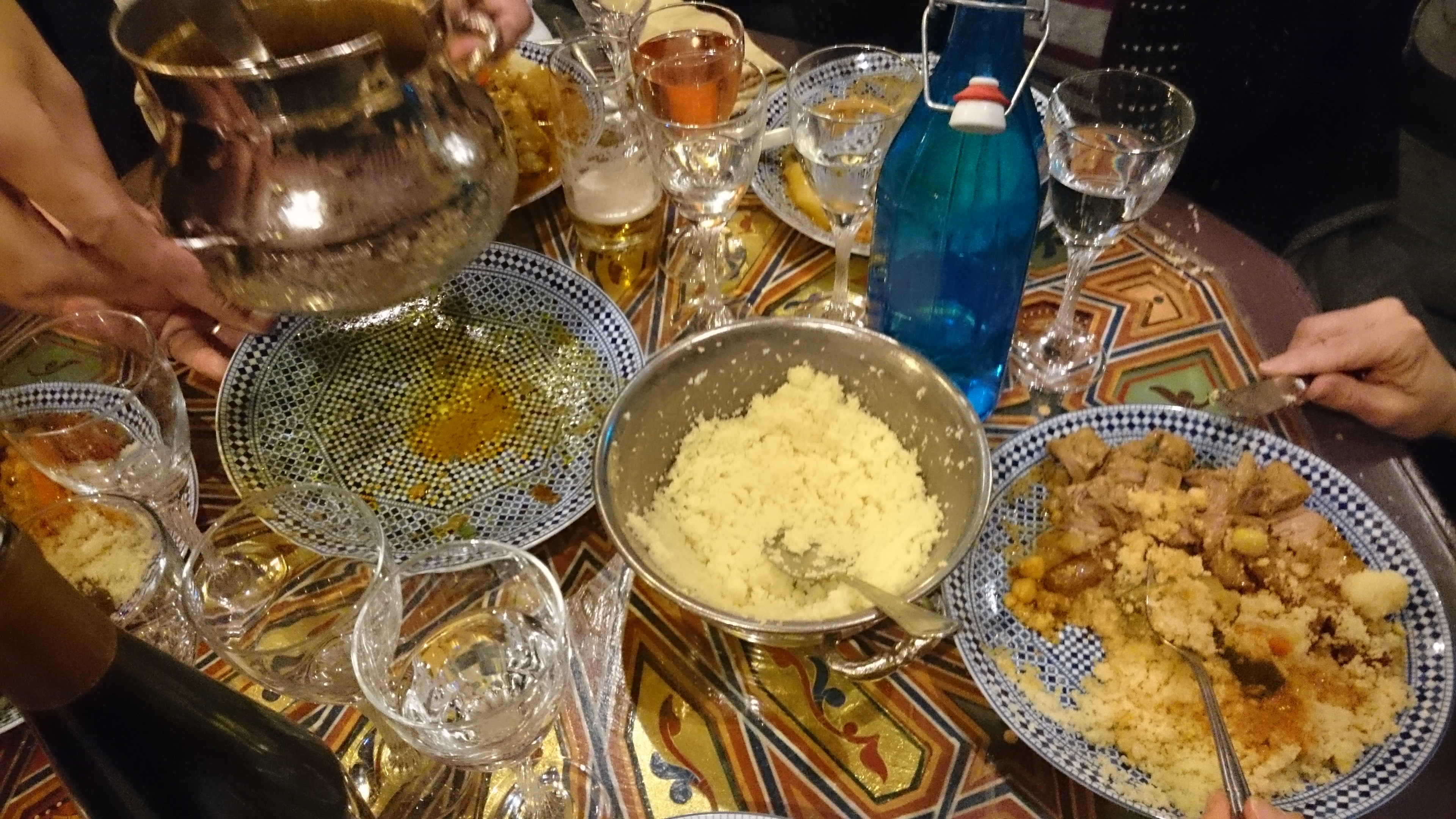 Repas savoureux et copieux dans un décor dépaysant et une table soignée. Des tajines qui transportent jusque dans la vallée de l’Ourika, couscous savoureux et une bière Casablanca pour accompagner le tout avant le thé à la menthe … bonne soirée en somme 👍