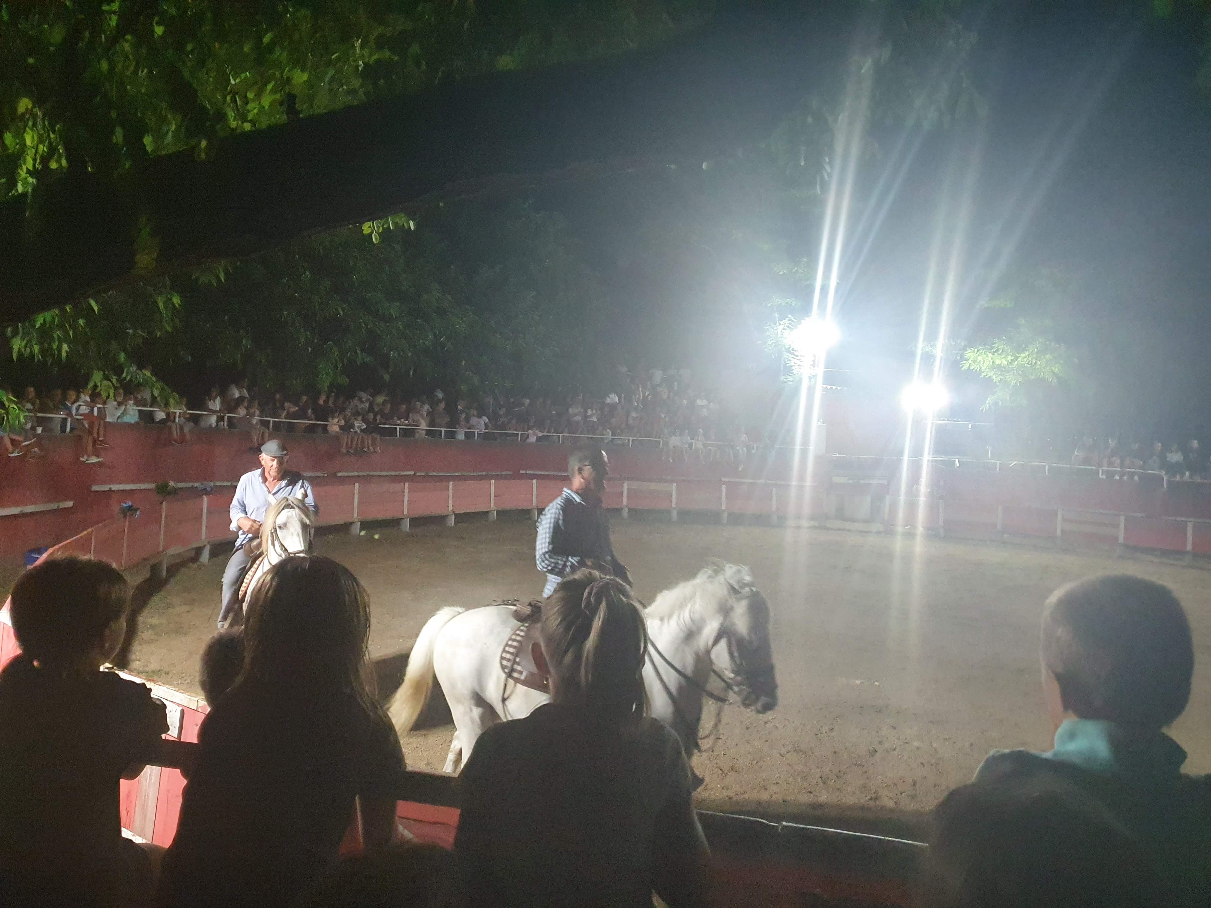 Le lieu est plutôt sympa, loin de tout. On y est allé pour la soirée taurine du mercredi. Mais tout est long, il faut faire la queue pour réserver le repas, assister un premier spectacle qui traîne en longueur puis pause pour le repas, donc file d'attente pour récupérer les assiettes... ah mais pour les frites et les boissons, c'est une autre queue, pfff. Puis le spectacle reprend, les enfants n attendent que les fameux taureaux mais non ils n'arrivent pas, pas encore. On assiste debout car pas assez de places assises au spectacle qui n en finit plus, on sent que tout est fait pour faire durer ( consommer?), les enfants sont crevés. On est là depuis 19h, il est 22h20, toujours pas de taureau dans l arène, on rentre déçus.