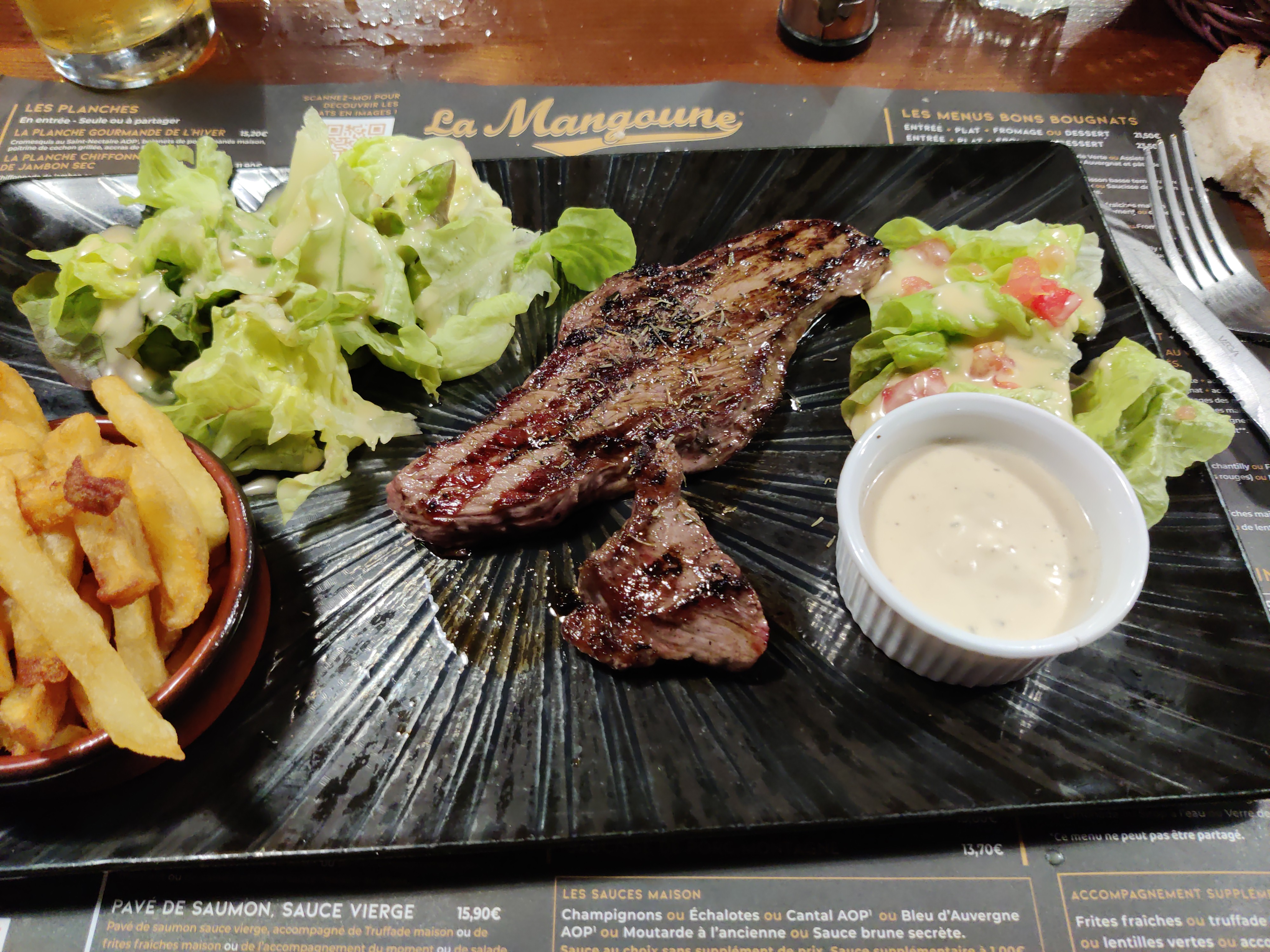 OK nous sommes sur une chaîne de restaurant mais La Mangoune est pour moi l'endroit idéal pour un déjeuner entre amis à la pause de midi (c'est ma conception de ce restaurant qui n'engage que moi). Service rapide et souriant, beaucoup de choix à la carte mais pour le coup cela ne me choque pas puisque nous sommes dans une chaîne, donc du volume et des produits de qualité malgré la diversité. Les assiettes sont copieuses. Je recommande ! PS : malgré un détail avec des 4 étoiles (il reste des petites améliorations dans les 3 catégories), je reste sur une note globale de 5 étoiles.