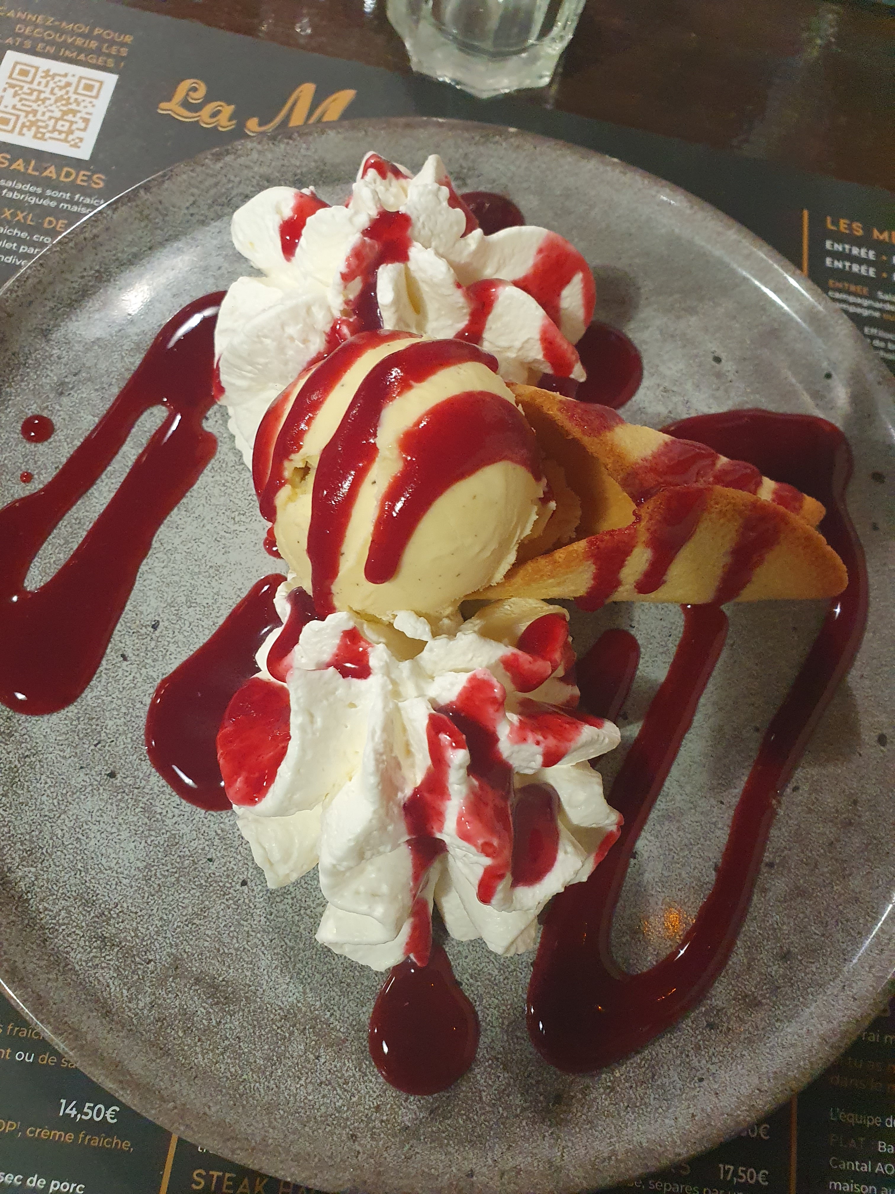 Apéritif servi en même temps que le repas.. Dessert :nous avons retrouvé de gros morceaux de givre dans la glace.. Nous en avons informer le personnel, qui apparemment ne se soucie guère de la satisfaction du client. À fuir
